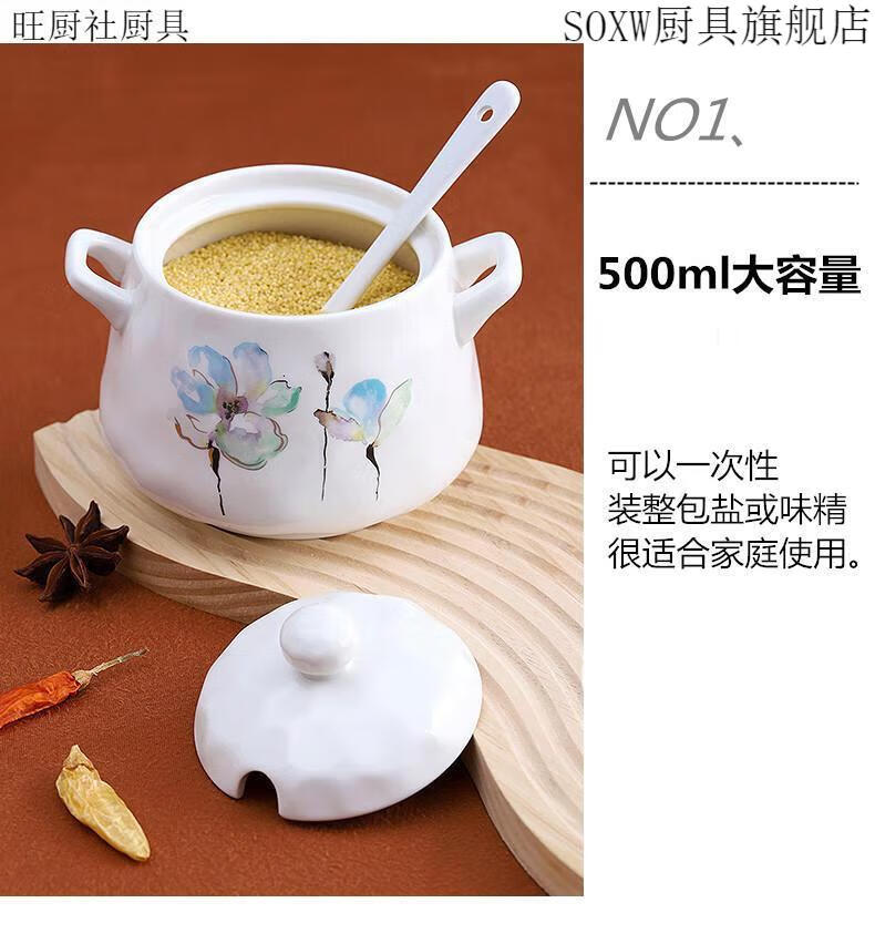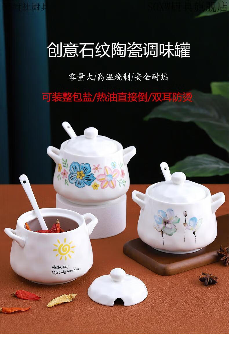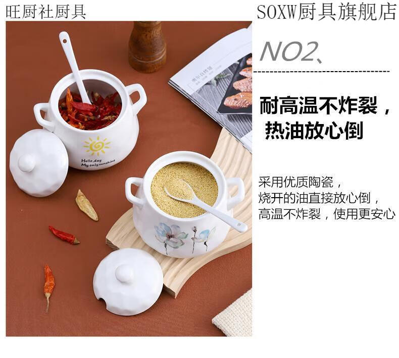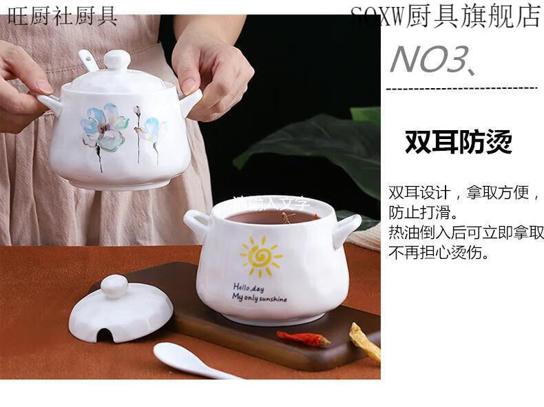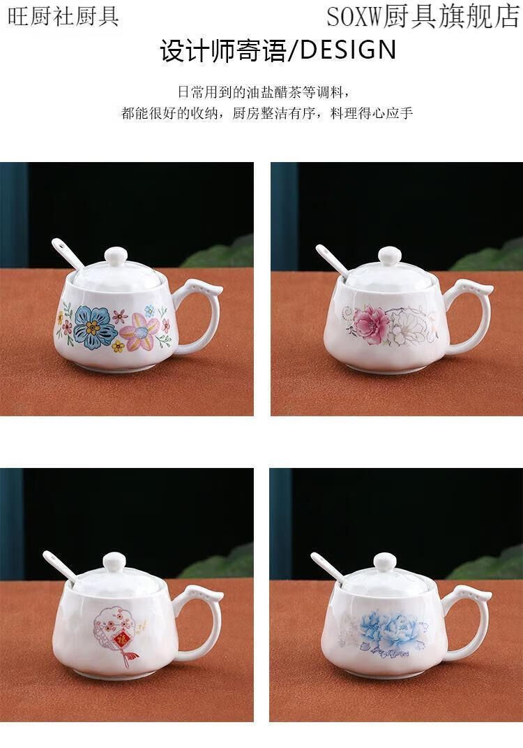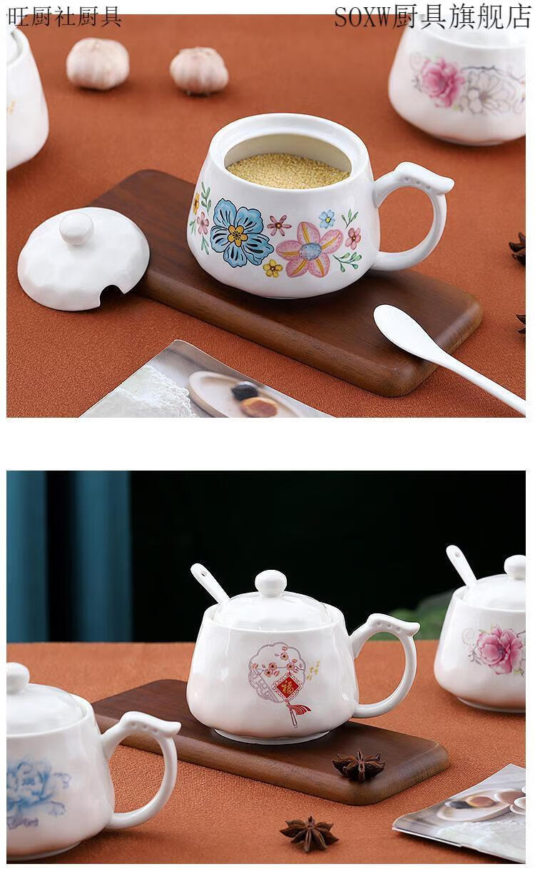 SOXW ceramic large capacity seasoning jar with handle chili oil jar kitchen high temperature resistant lidded spoon double-ear seasoning jar with handle - Huakai Fugui 500ml