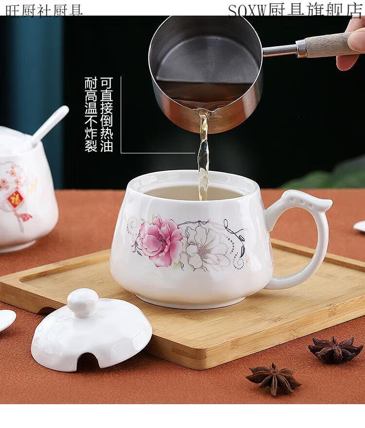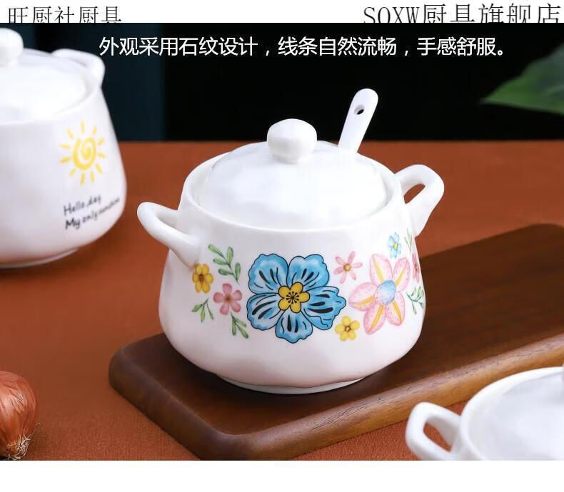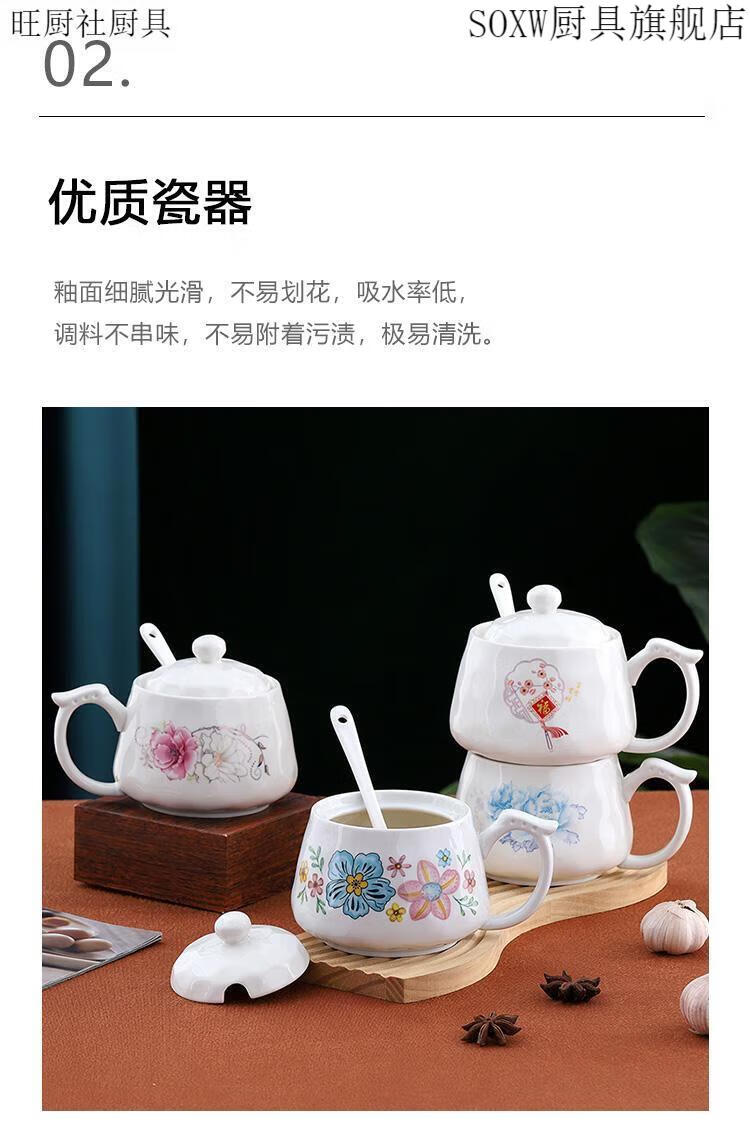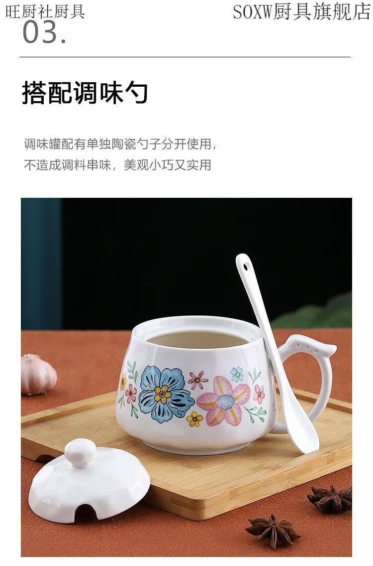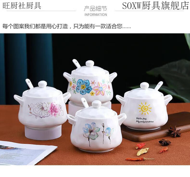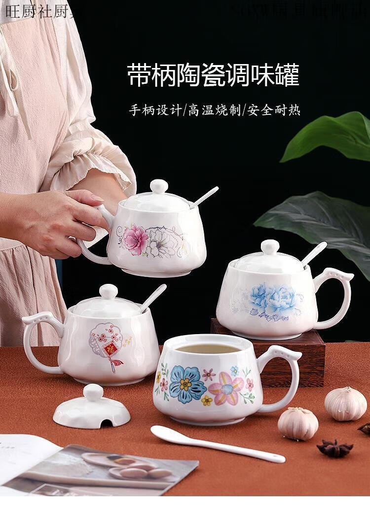 SOXW ceramic large capacity seasoning jar with handle chili oil jar kitchen high temperature resistant lidded spoon double-ear seasoning jar with handle - Huakai Fugui 500ml