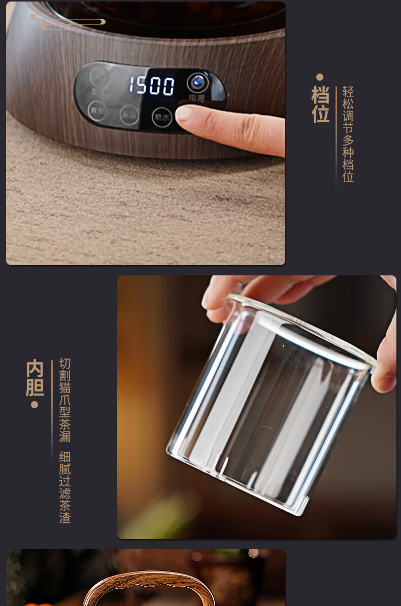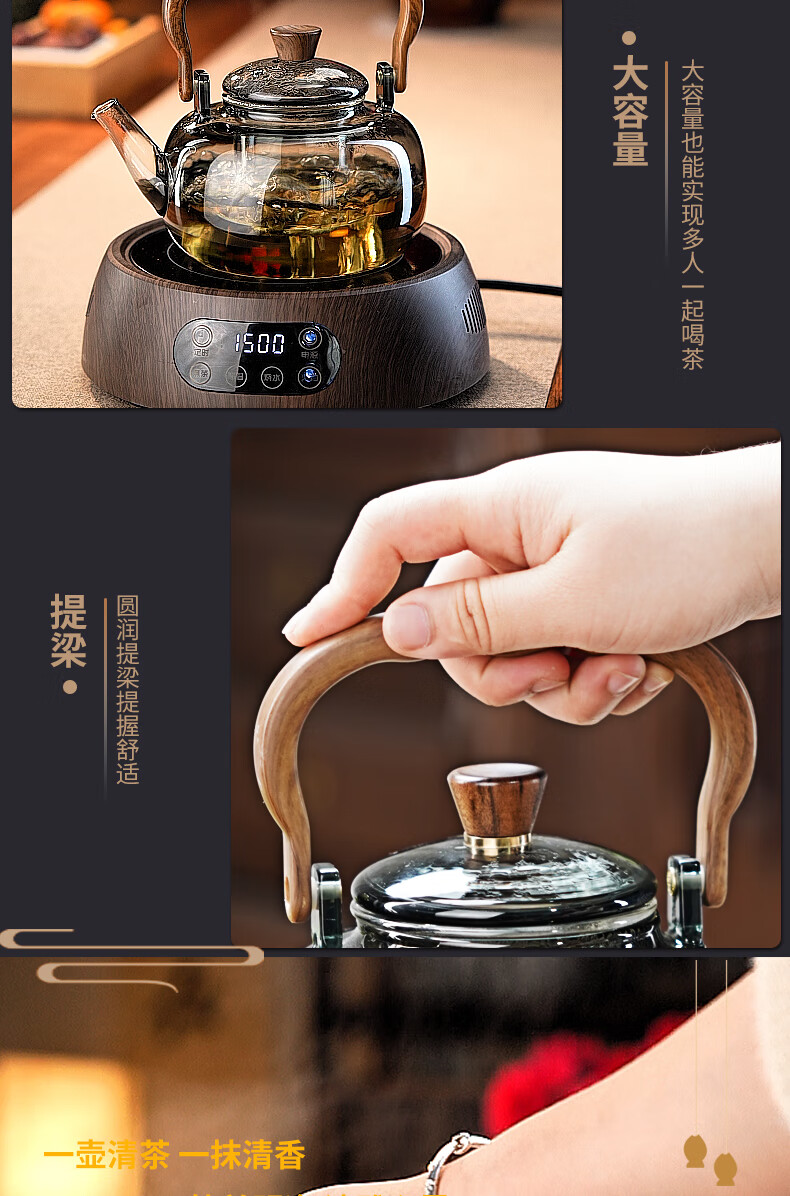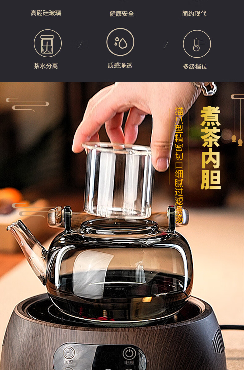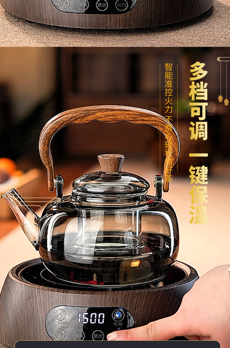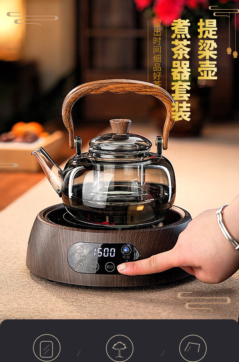 Full-degree heat-resistant glass teapot with wood grain teapot, home office stove, tea making kung fu tea set, open flame heating, wood shadow teapot + Kangmi wood grain ceramic stove