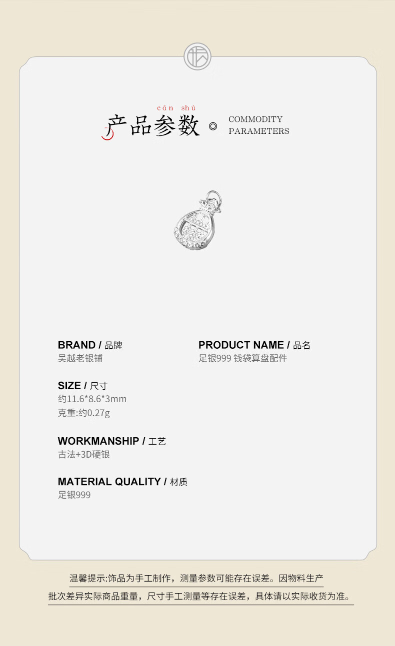 Wuyue Old Silver Shop Pure Silver Silver Products 999 Pure Silver Purse Abacus Accessories Fashion Silver Jewelry Accessories DIY Pendant 999 Pure Silver Purse Abacus Accessories