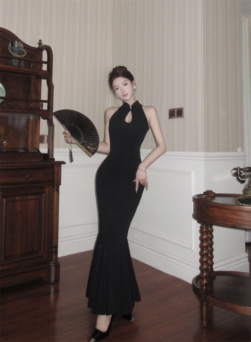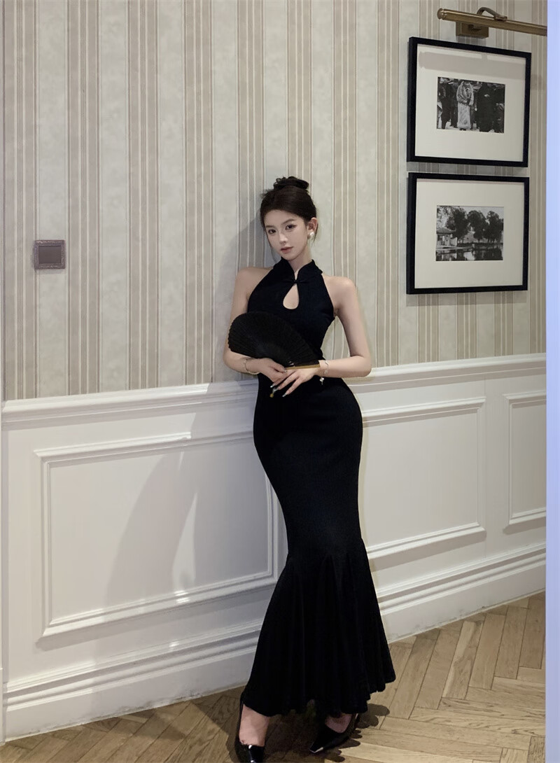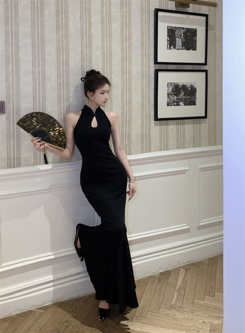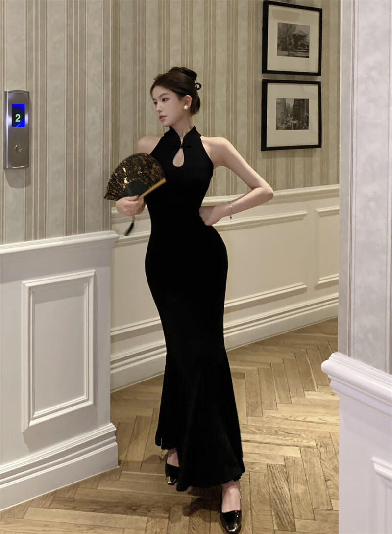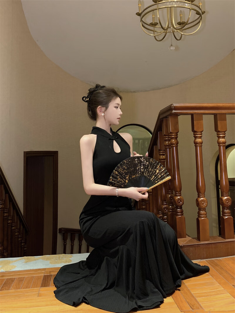 Chuangjingyi chooses fishtail skirt dress, new Chinese style national style black improved cheongsam dress for women summer sexy evening dress fishtail bag Picture color S
