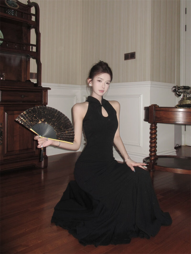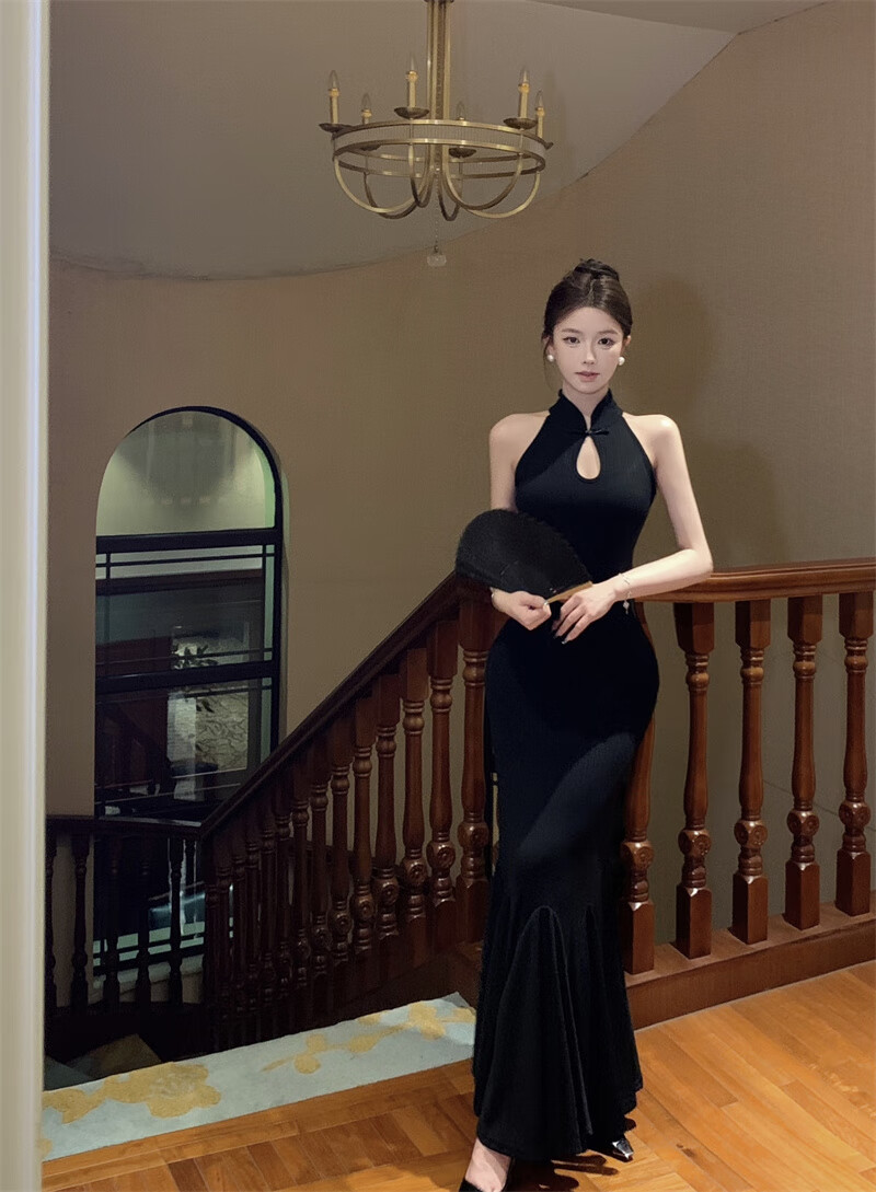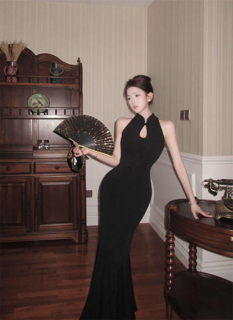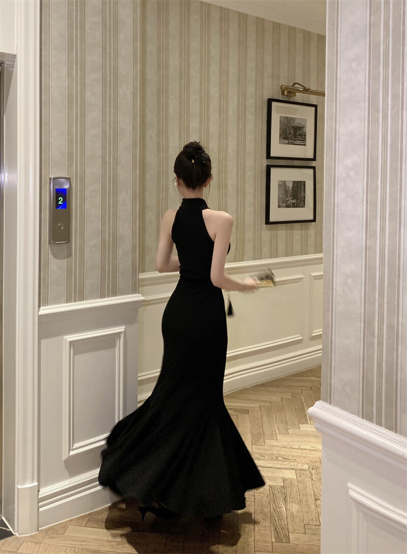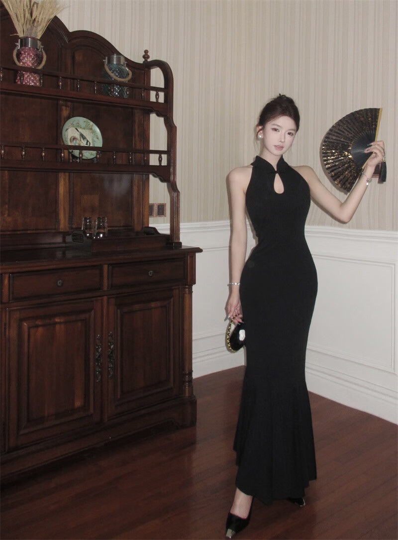 Chuangjingyi chooses fishtail skirt dress, new Chinese style national style black improved cheongsam dress for women summer sexy evening dress fishtail bag Picture color S