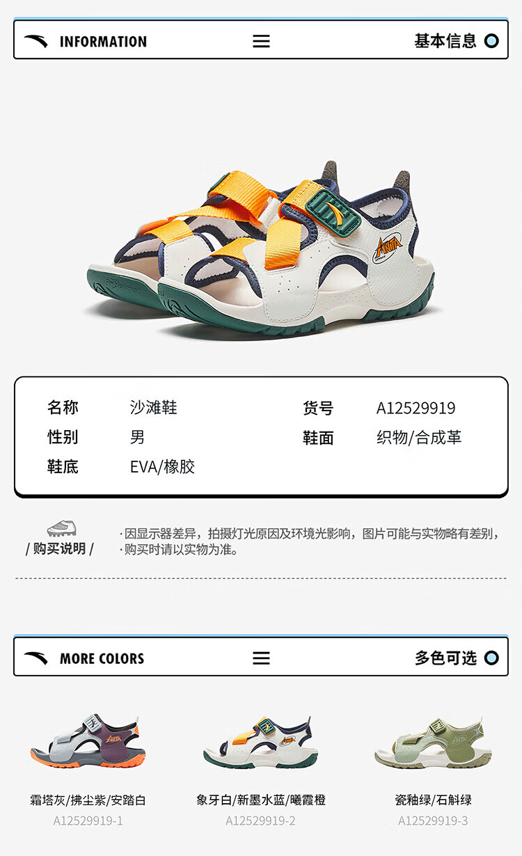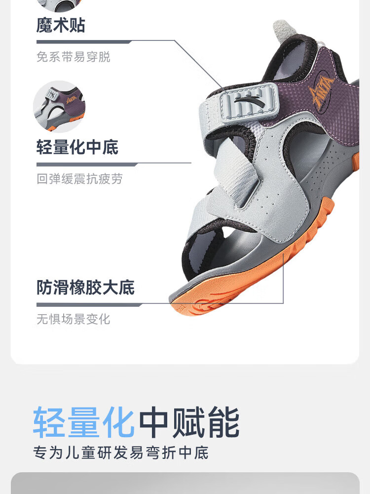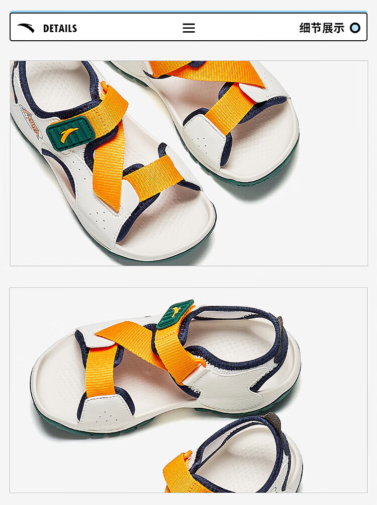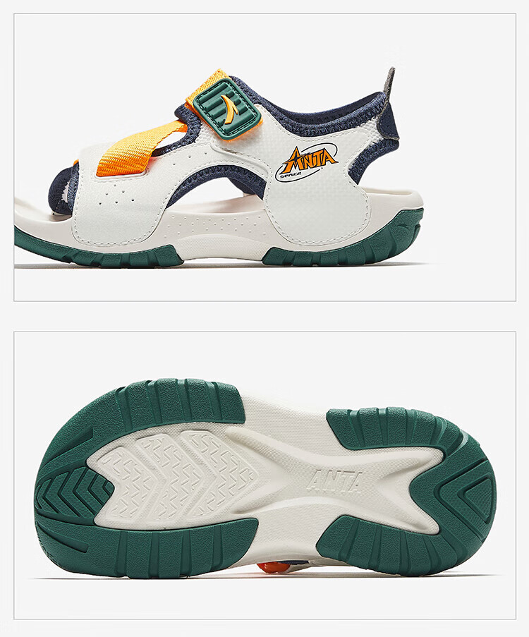 ANTA children's sandals for boys, outdoor breathable and comfortable buckle low-top toe beach shoes, river shoes D, ivory white/new ink blue/Xixia orange 29