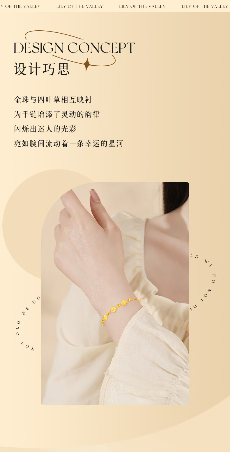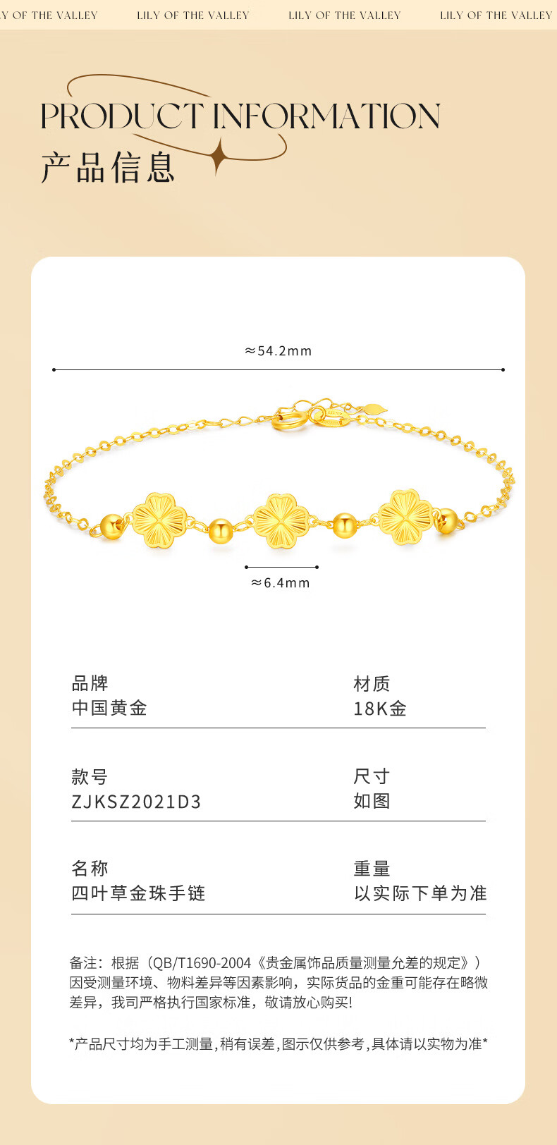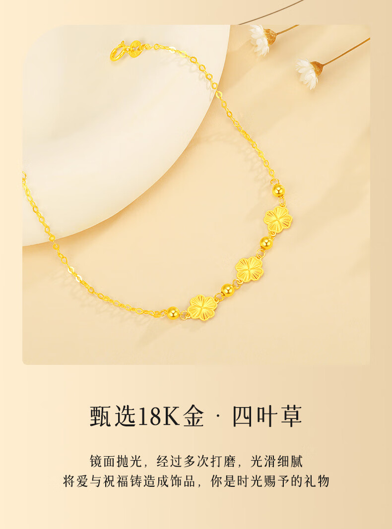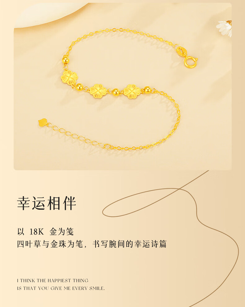 Chinese gold 18K gold lucky four-leaf clover women's K gold plain chain transfer bead bracelet for girlfriend and wife's birthday gift versatile bracelet + rose gift box + greeting card + engraving