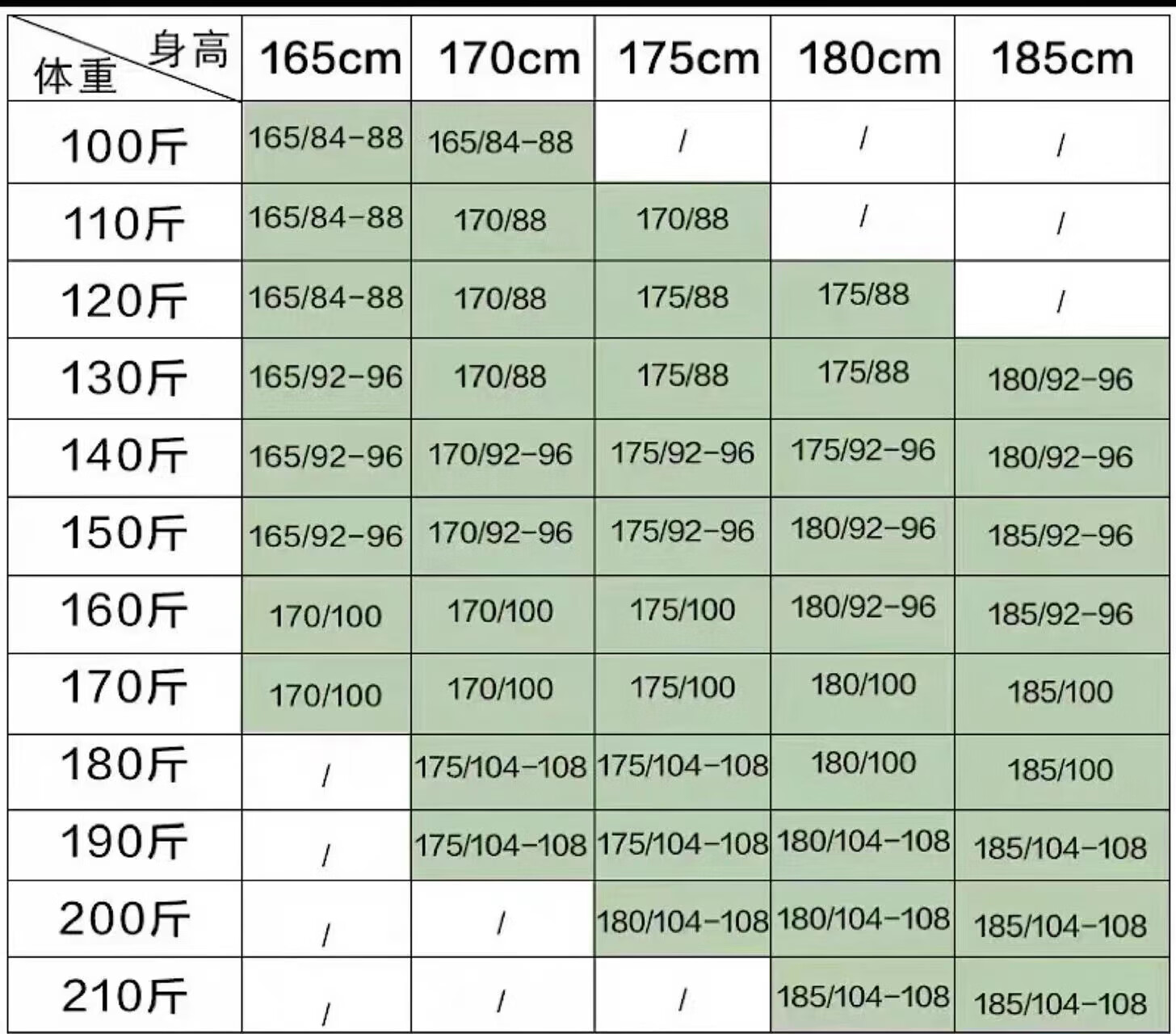 China (cm) 160-165/84-86 165-170 / 88-90 167-172 / 92-96 168-173 / 98-102 170-176 / 106-110