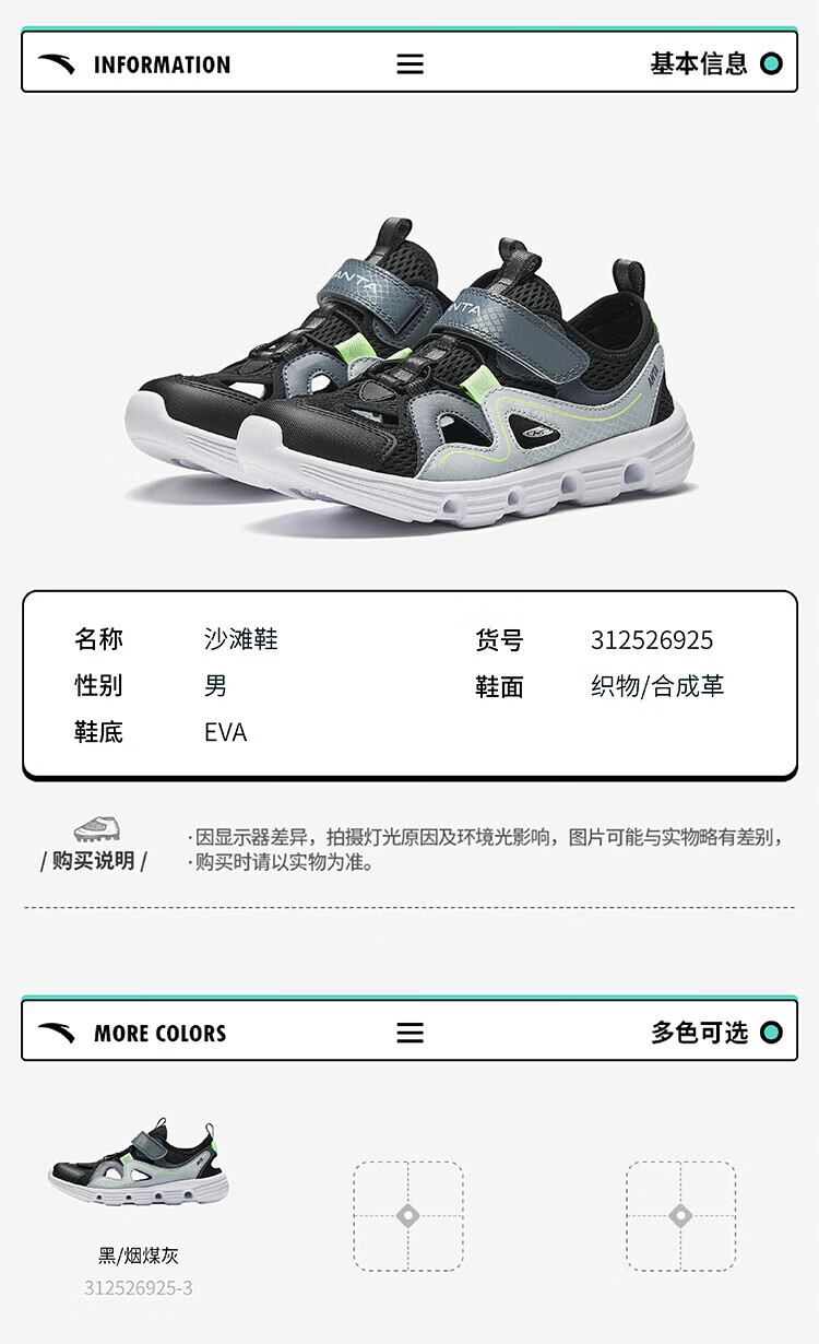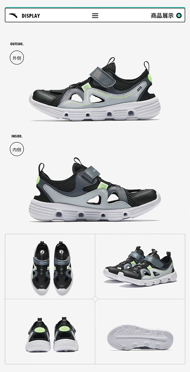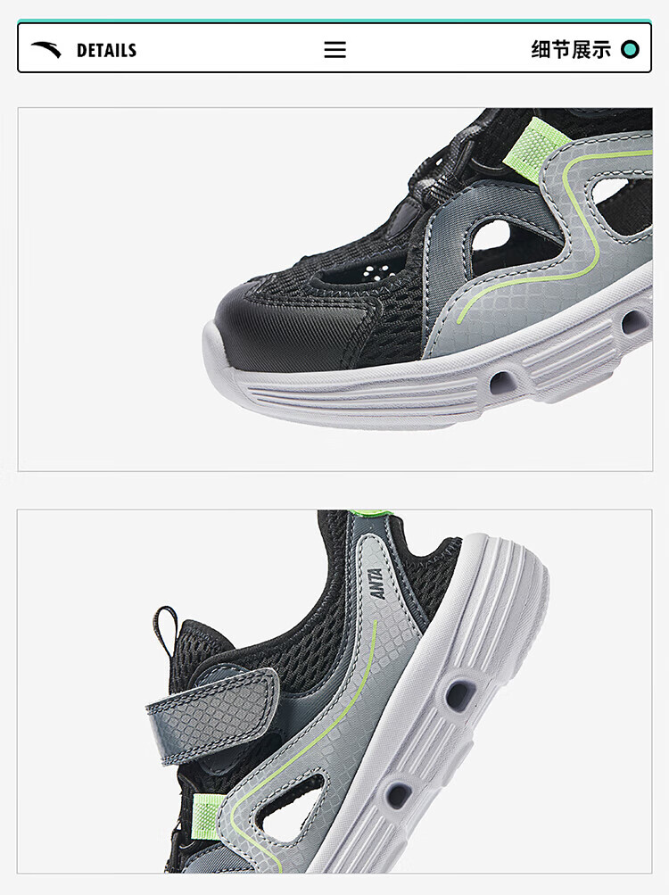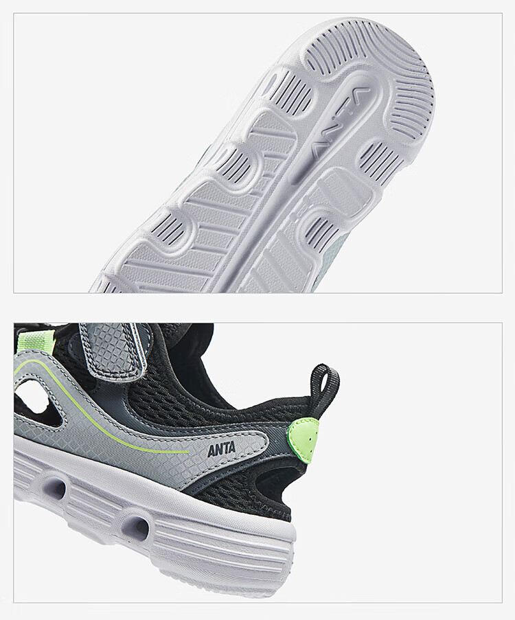 ANTA Children's Sandals Men's Big Children's Shoes 2025 Summer New Product Baotou Lightweight Outdoor Soft Elastic Beach Shoes Black/Anthracite Gray-3 35