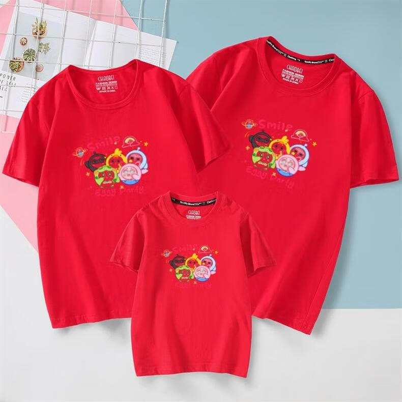 Parent-child summer clothes for a family of four, a family of three, short-sleeved 2025 new pure cotton high-end cartoon mother-child mother-daughter wear t-shirt red smile 170 (L) adults