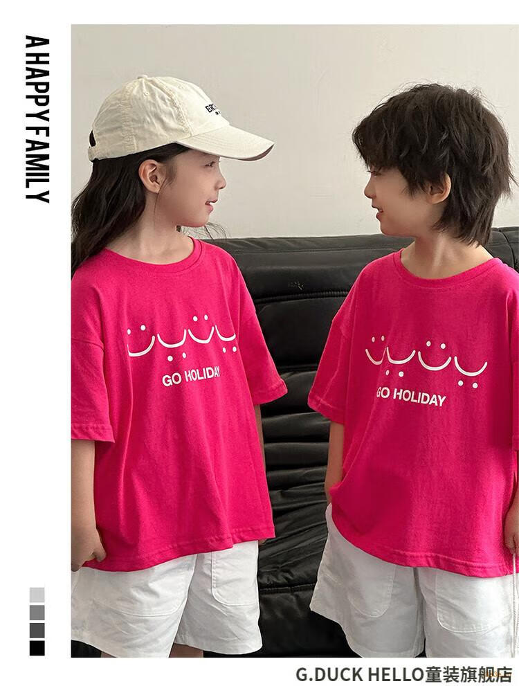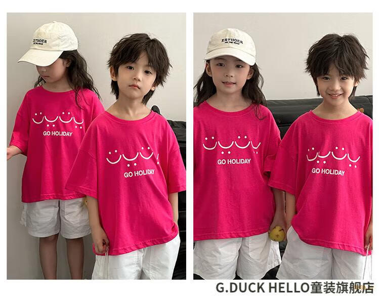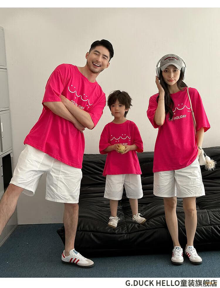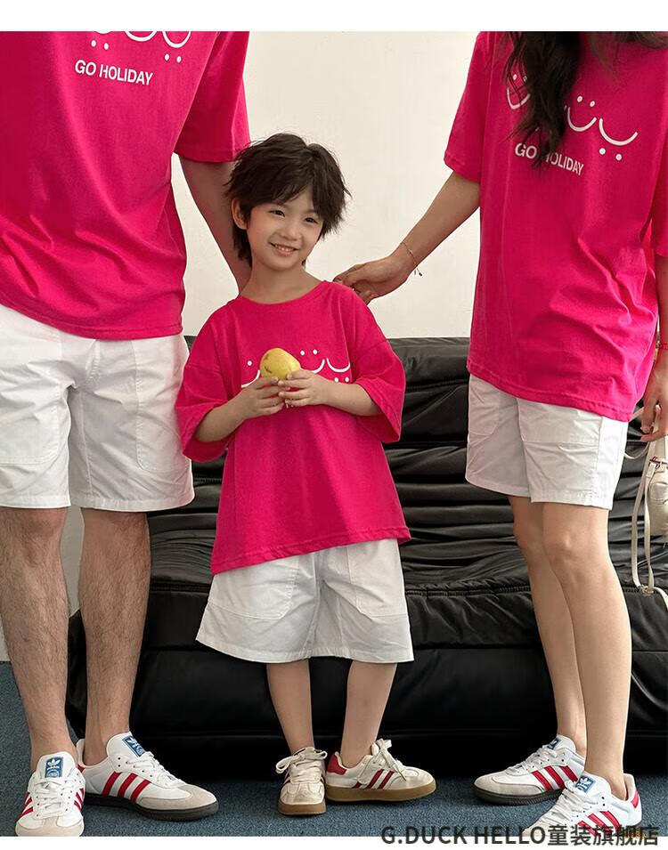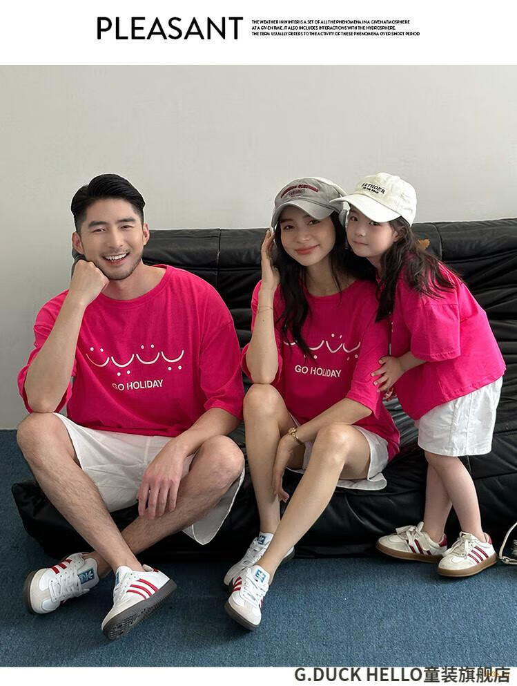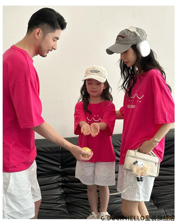 G.duck little yellow duck parent-child wear summer 2025 new style family of three or four full family wear short-sleeved T-shirt suit mother and daughter wear rose red smiling face short-sleeved 150 recommended for 11~12 years old 140-150cm cm