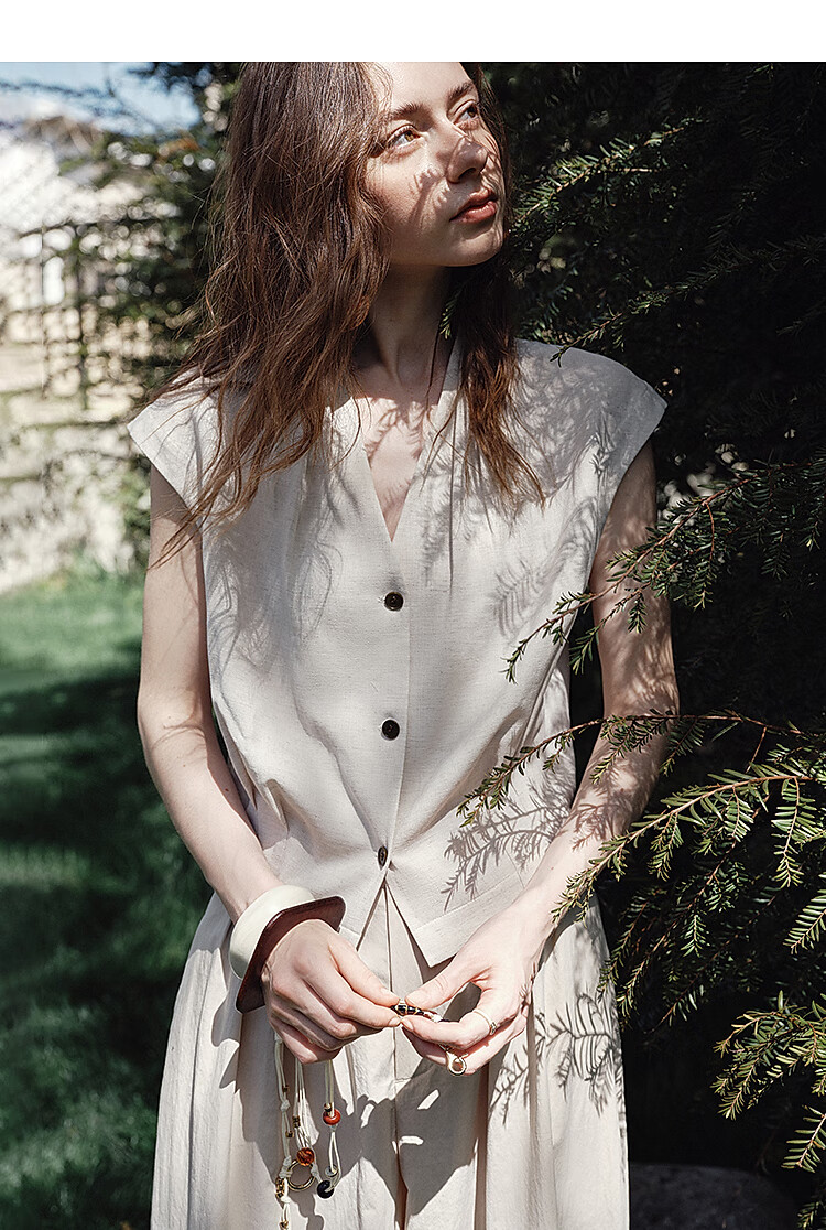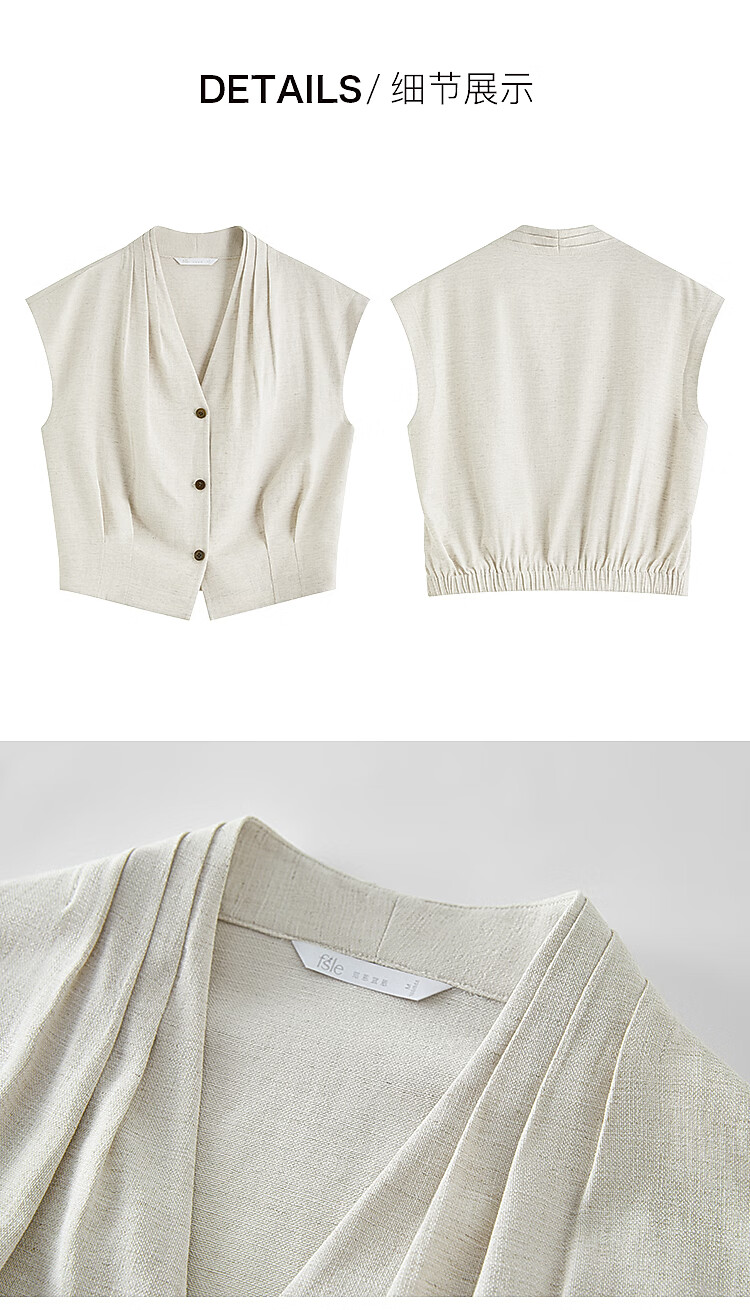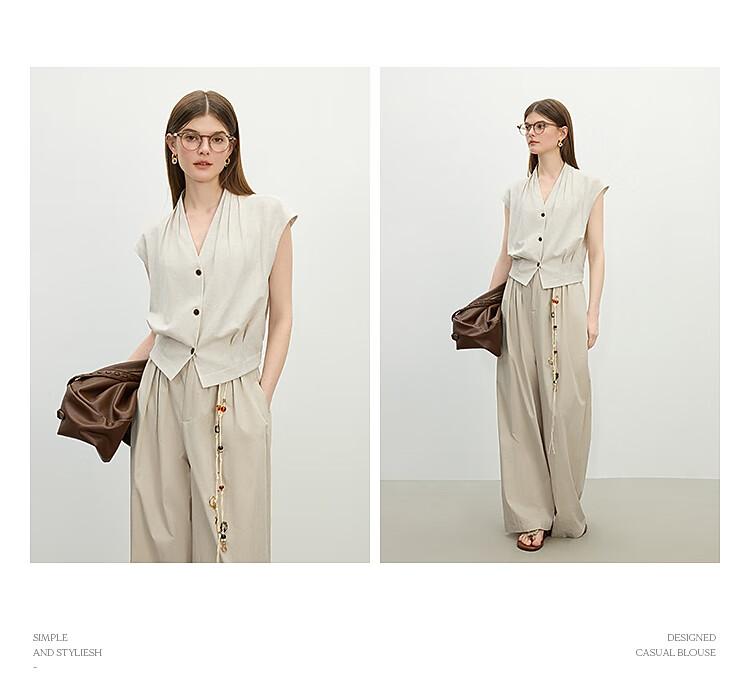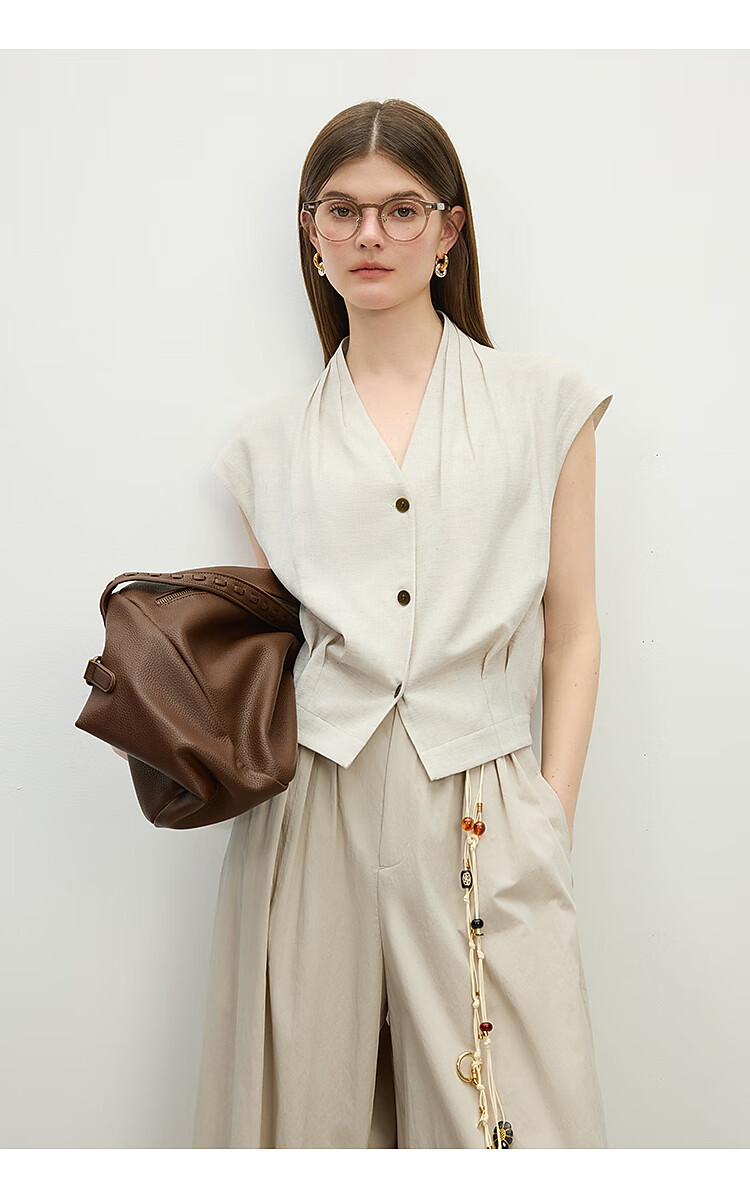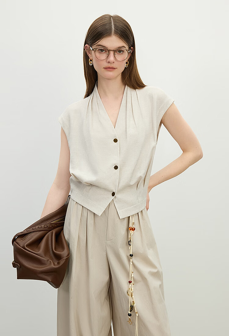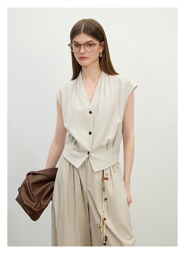 Fan Silan's temperament old money style hemp natural color casual shirt women's 2025 summer new style waistcoat v-neck shirt 2390 hemp natural color M