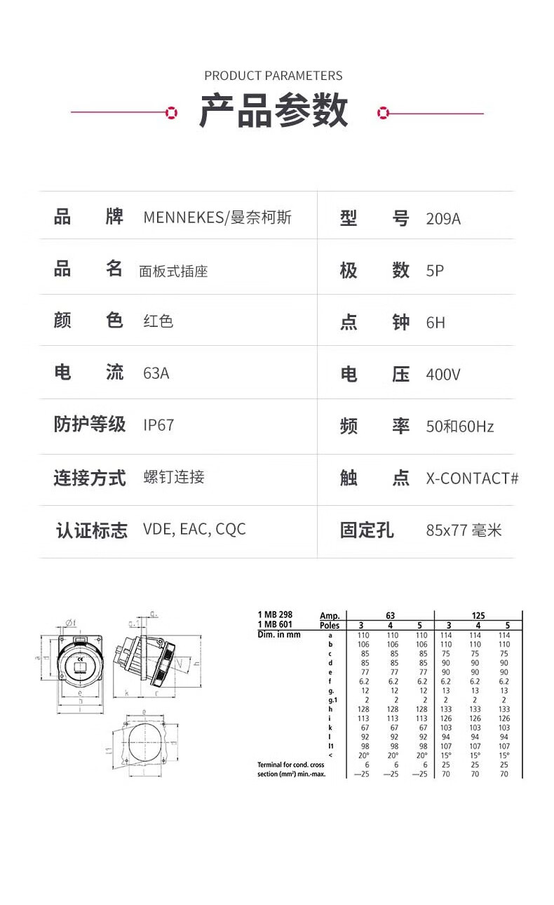 MENNEKES 209A MENNEKES 63A 380V 5P IP67 concealed industrial socket waterproof aviation plug male and female docking 63A-380V-209A