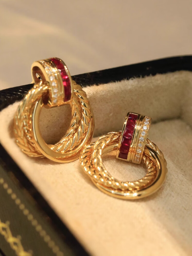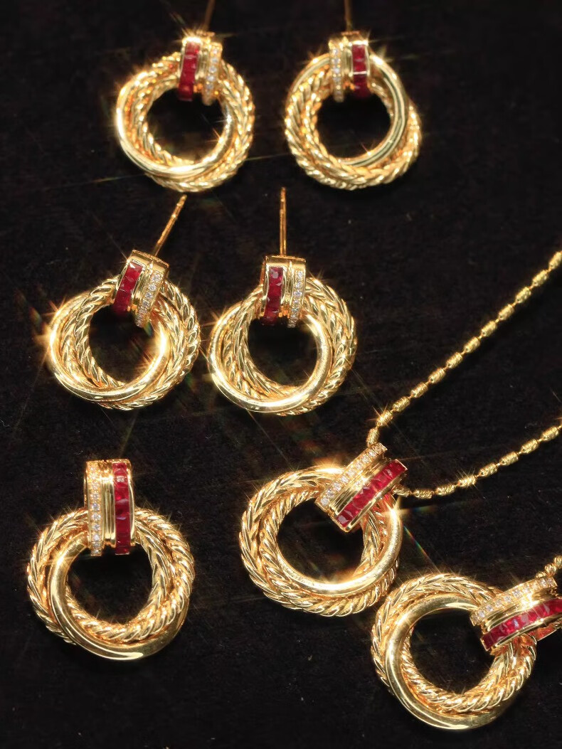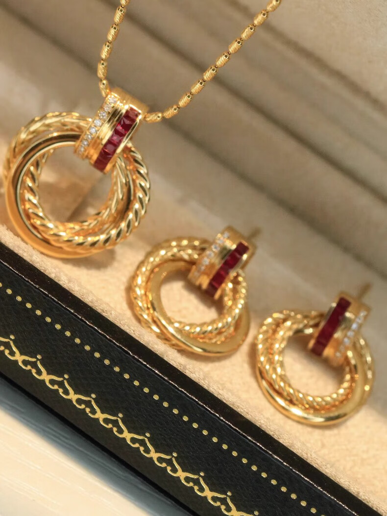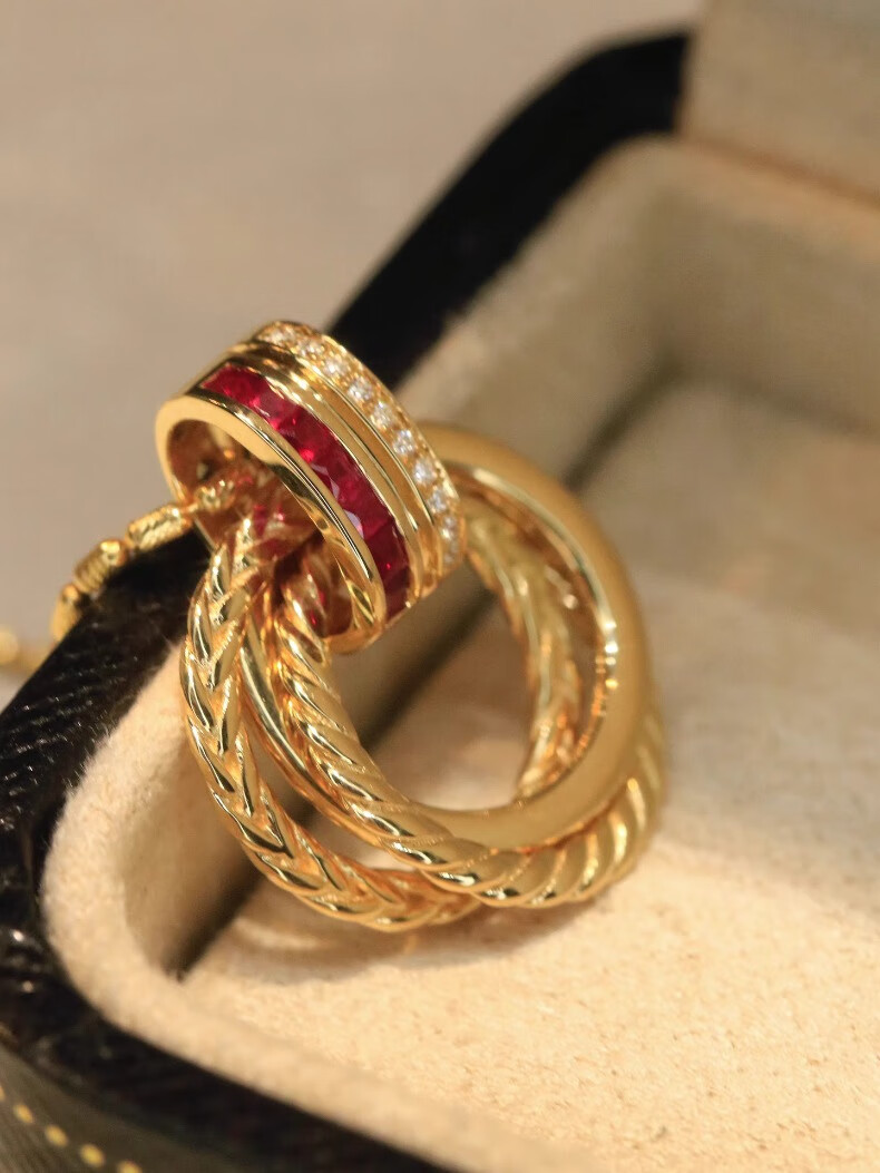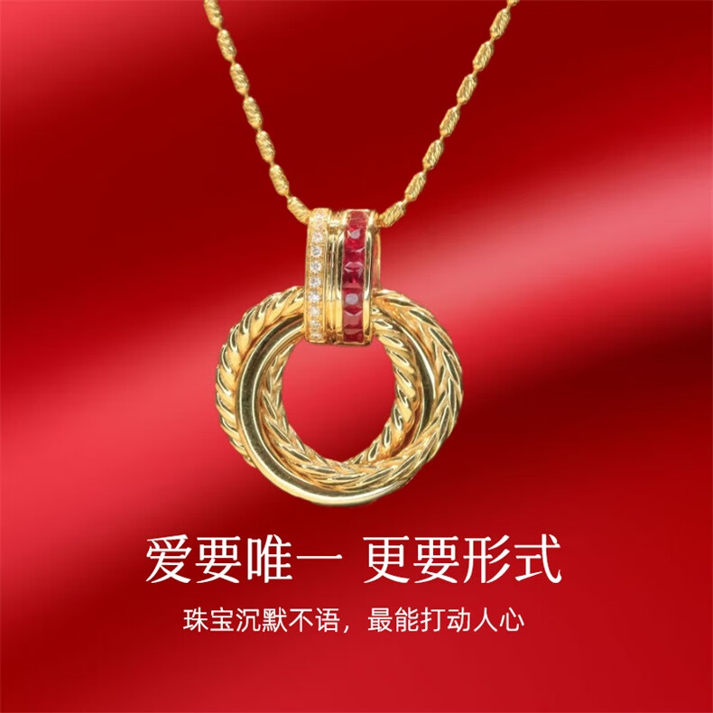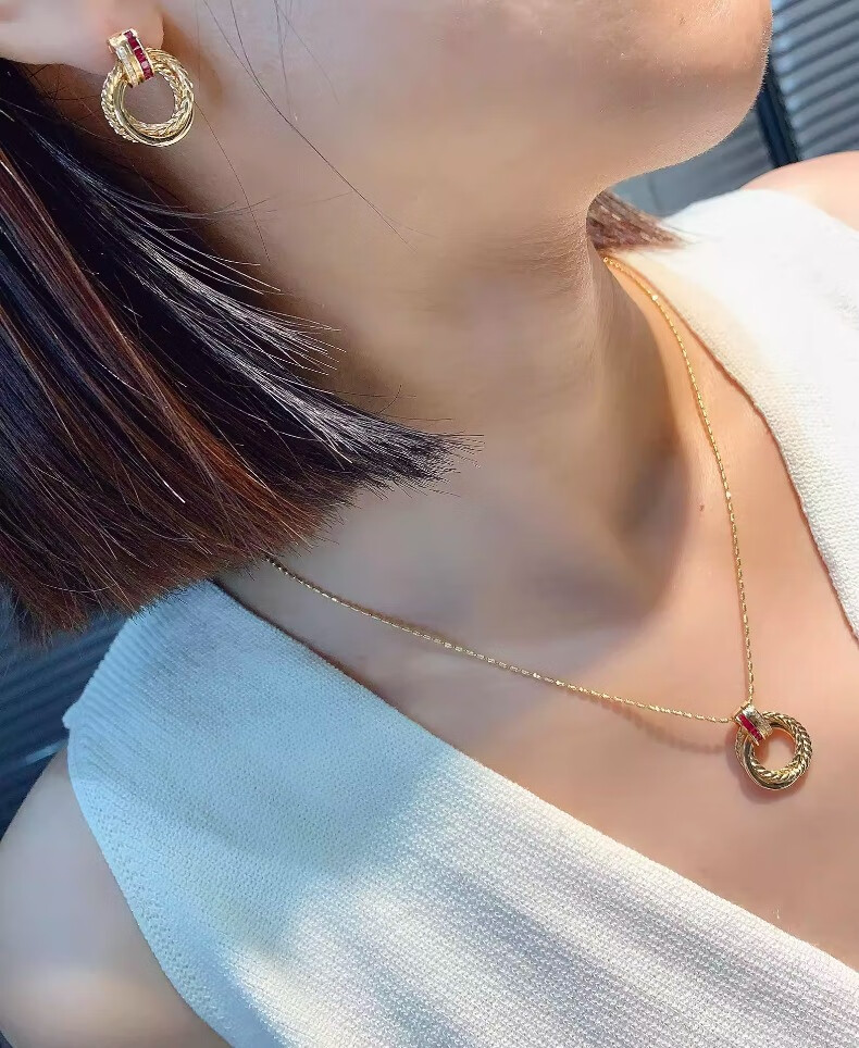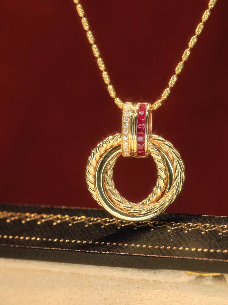 Orenchi Necklace for Women Natural Ruby 18K Gold Diamond Pendant Luxury Jewelry Wedding Anniversary Birthday Gift for Wife Ruby Three Ring Design Necklace