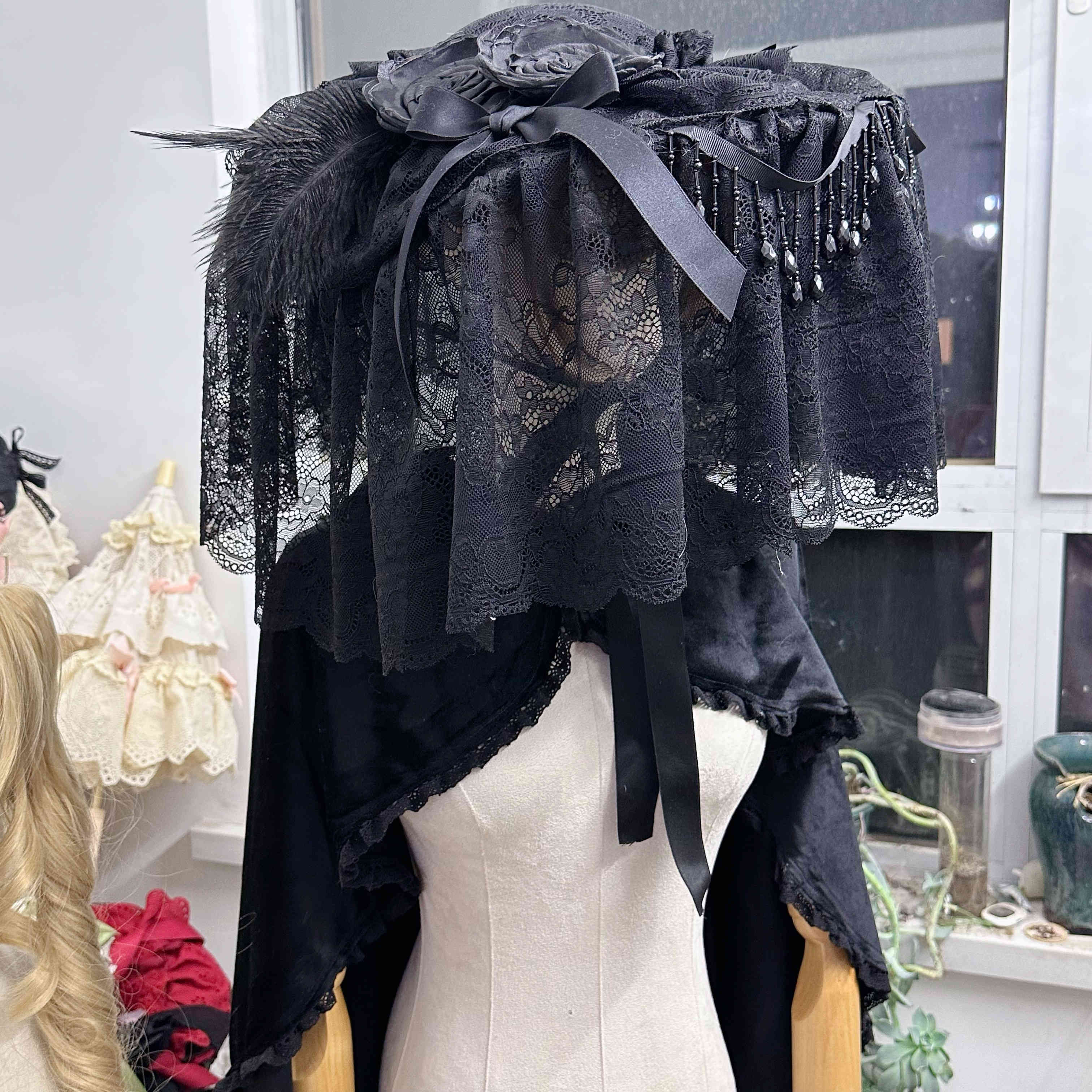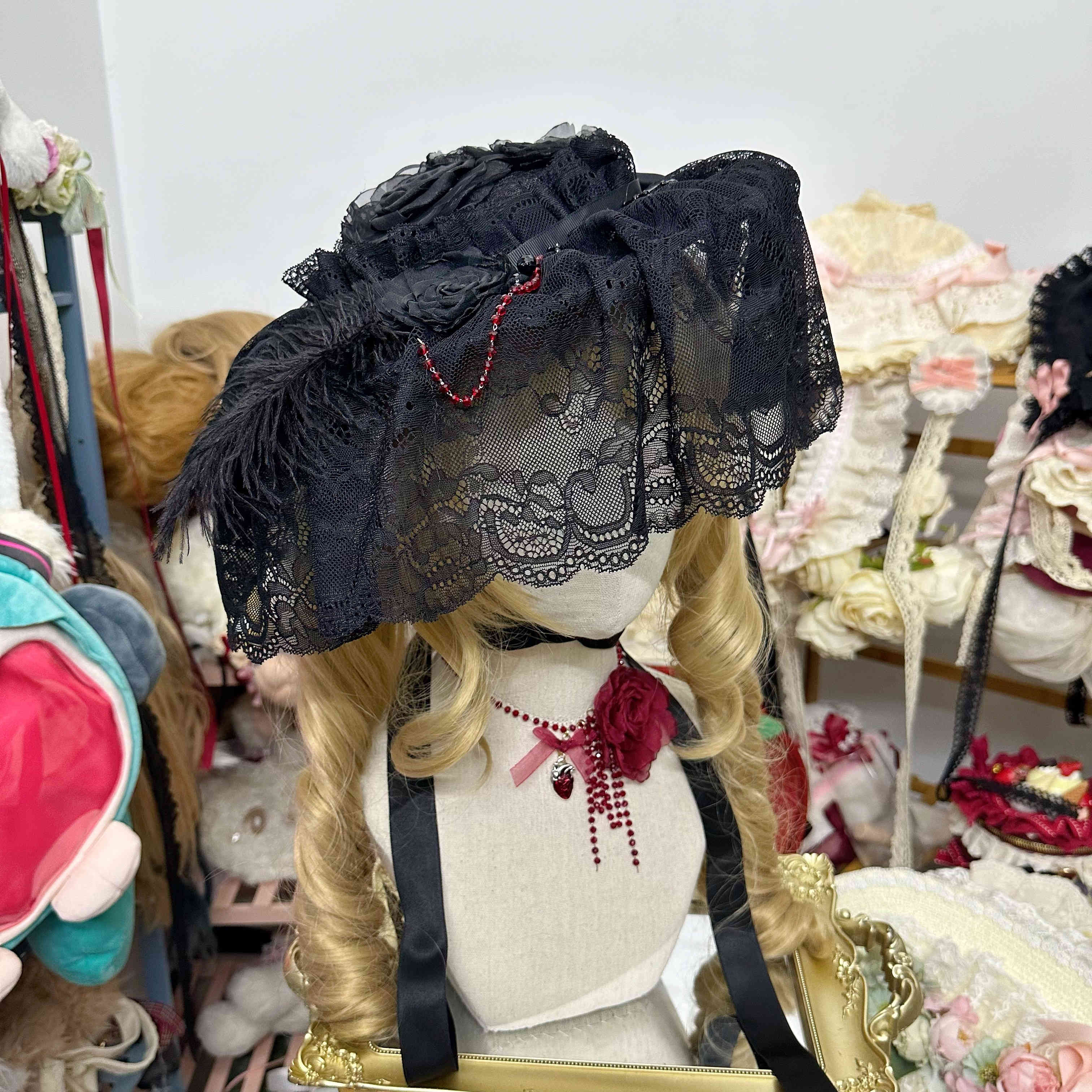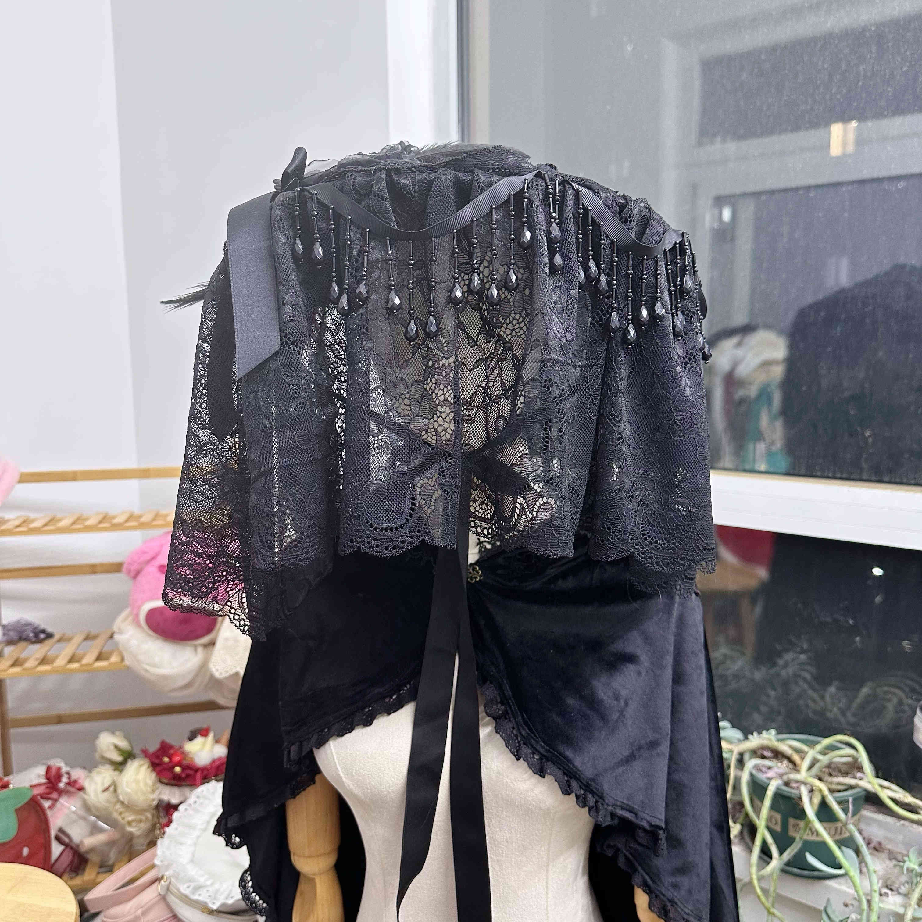 CLCEY homemade Lolita element pure black flat hat widow hat gothic style dark hat half-covered medium size