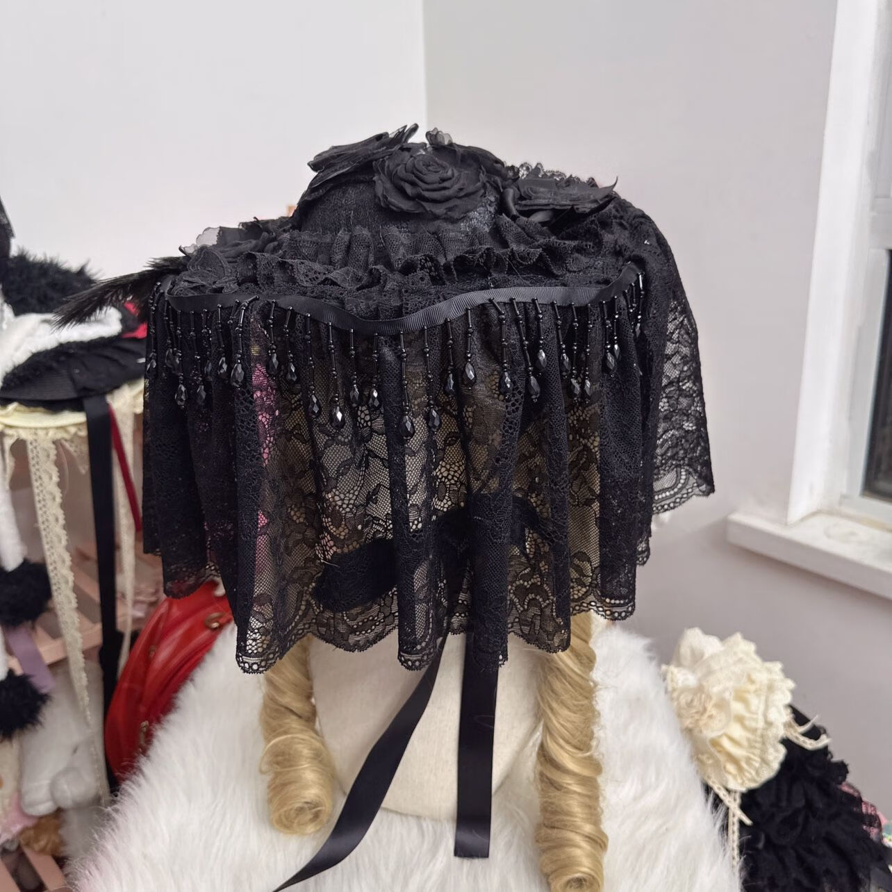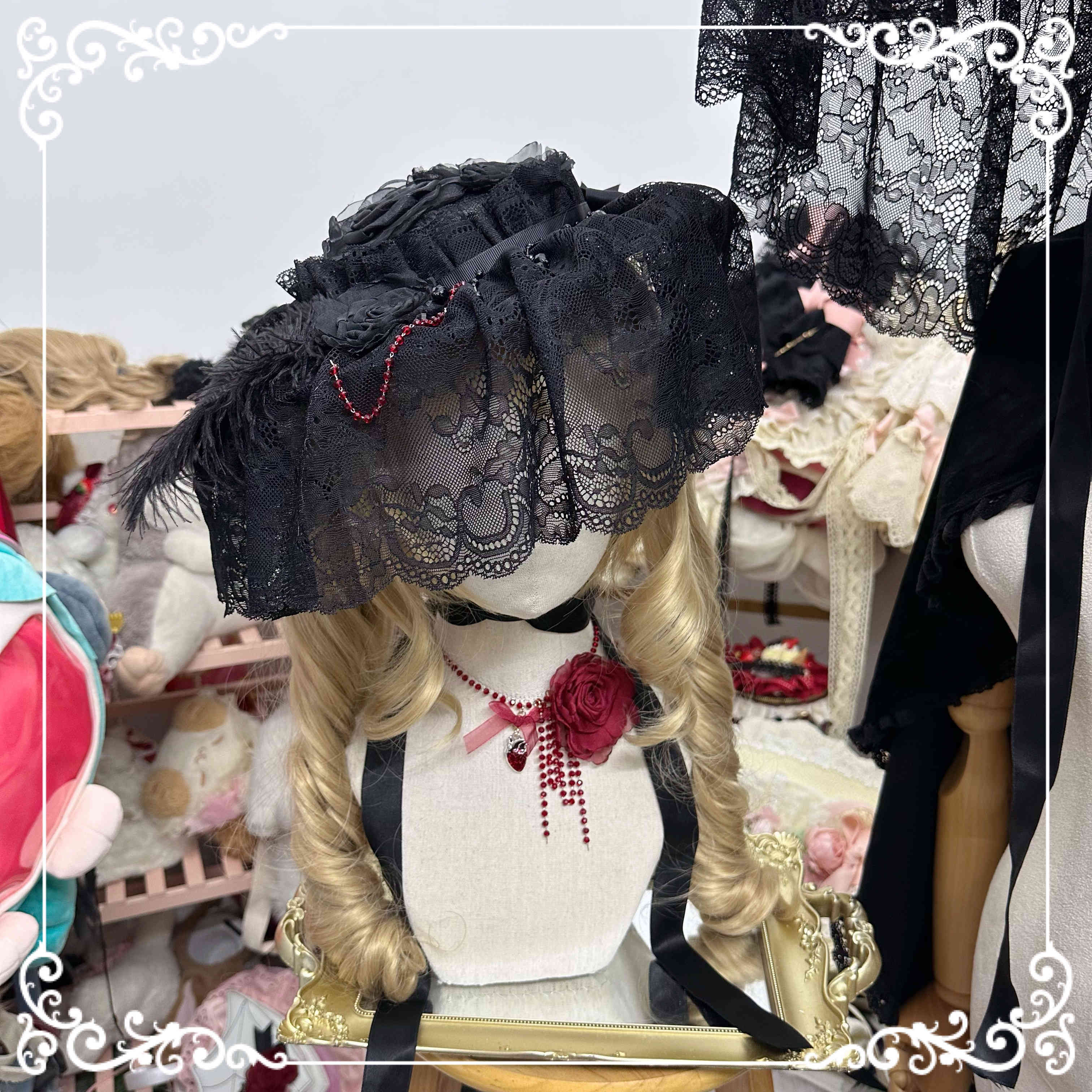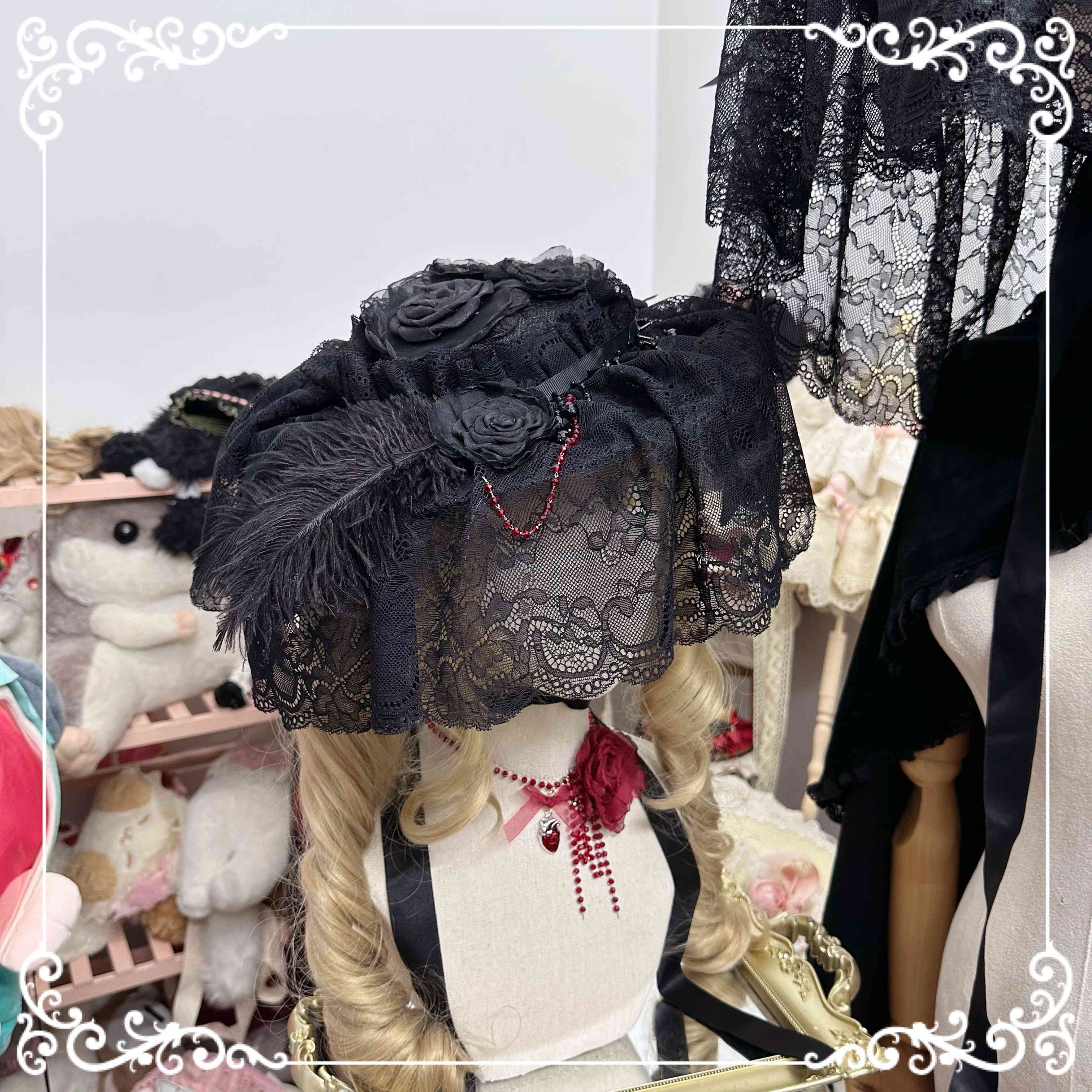 CLCEY homemade Lolita element pure black flat hat widow hat gothic style dark hat half-covered medium size