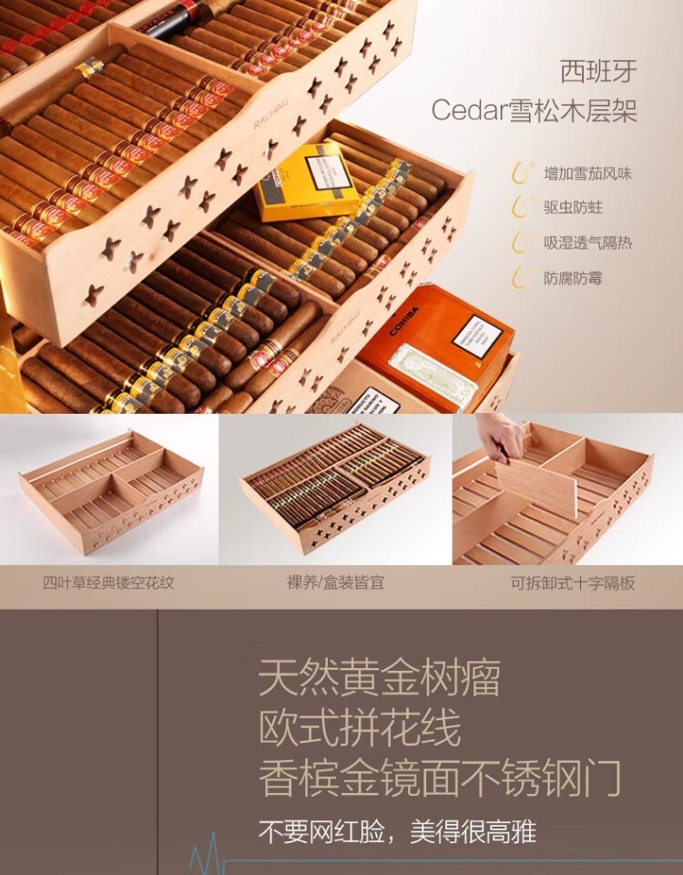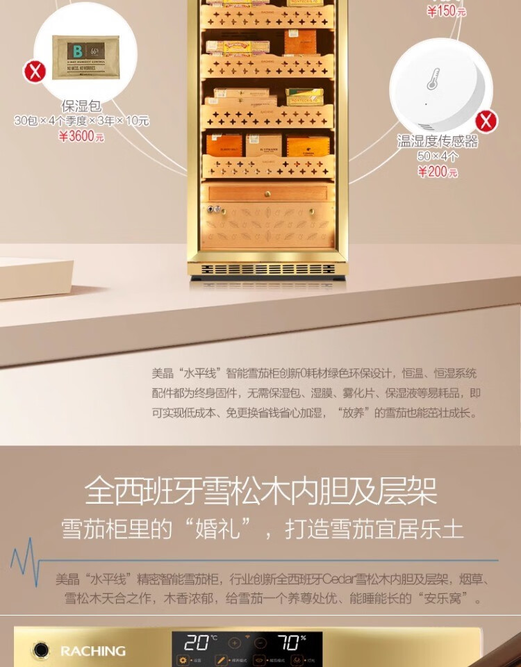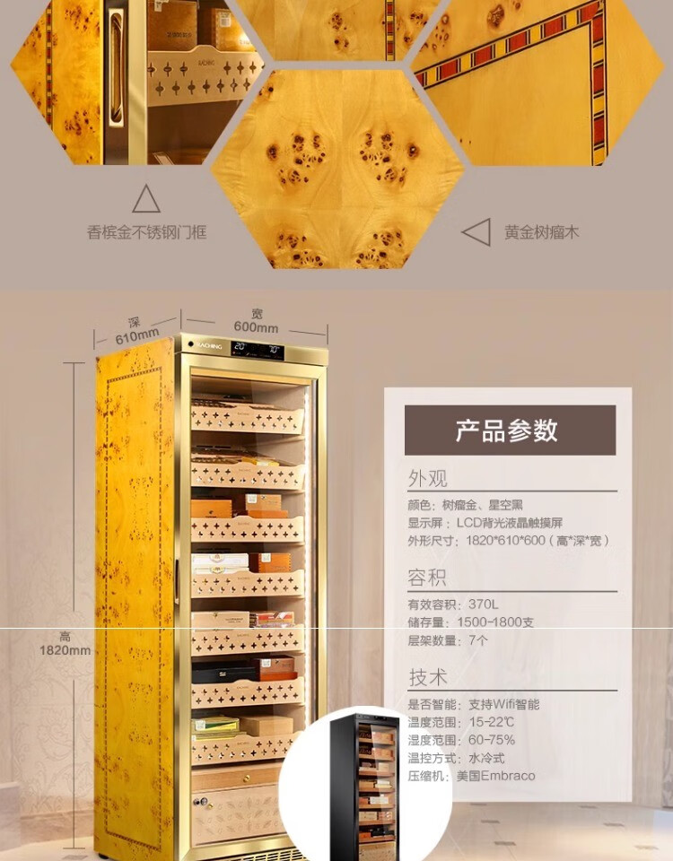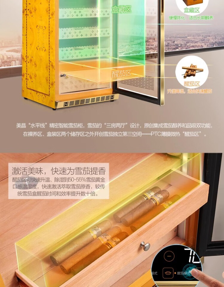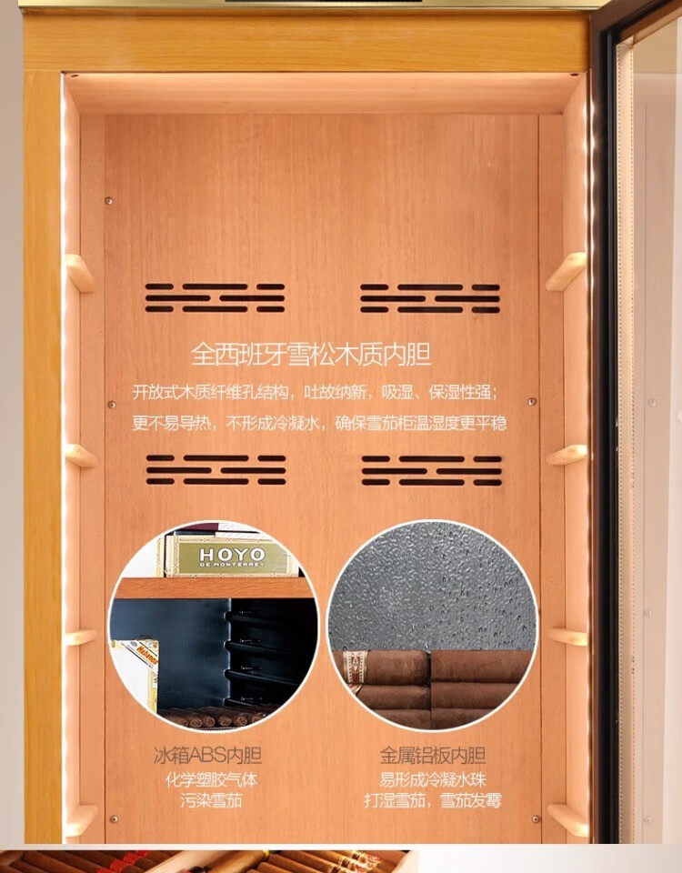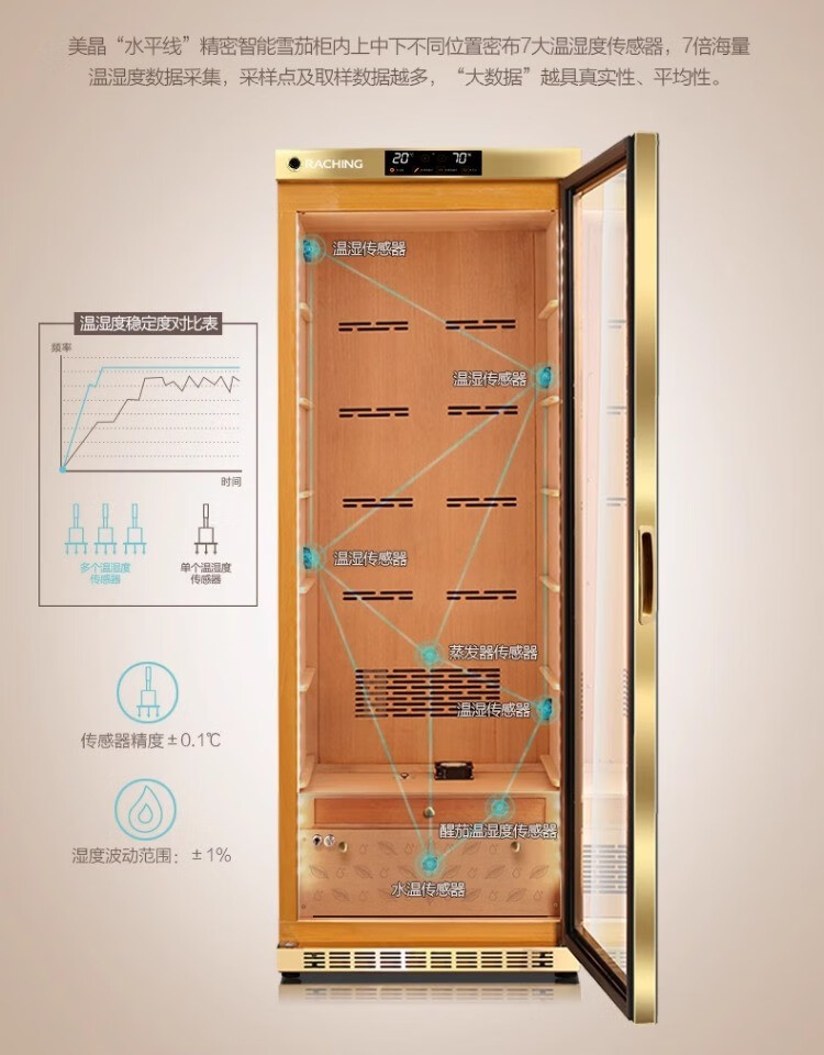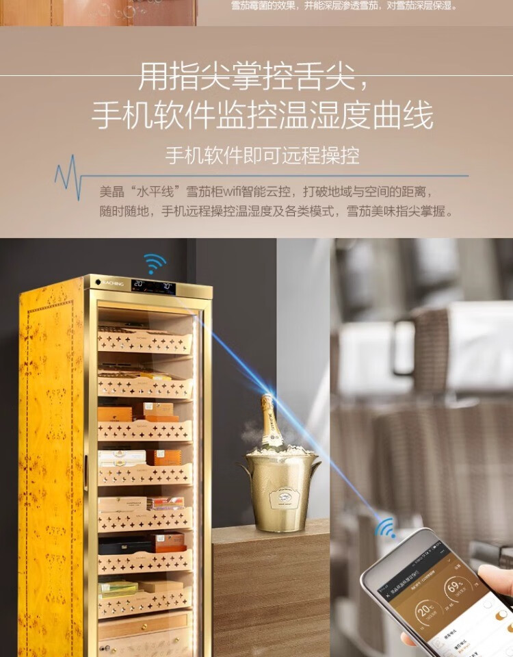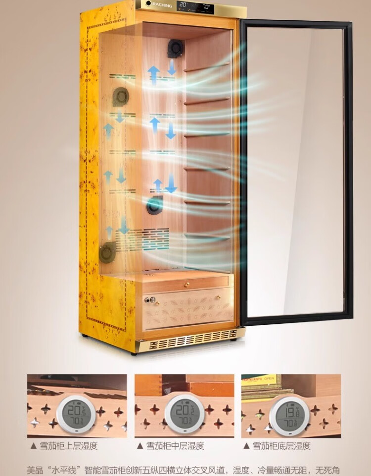 Meijing cigar cabinet MON3800A intelligent horizontal line solid wood constant temperature and humidity cigar cabinet moisturizing cabinet golden Spanish cedar wood shelf