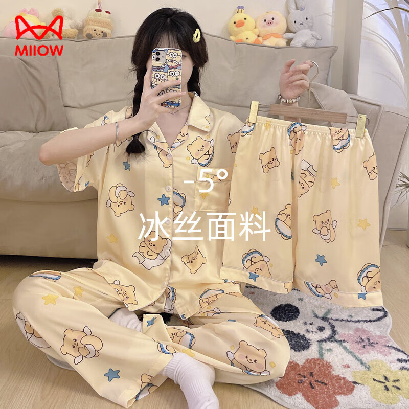 MiiOW butterbear ice silk pajamas for women summer short-sleeved cute cartoon home clothes three-piece suit ice silk Xiaoba short-sleeved + shorts 2XL recommended 125-140Jin Jin equals 0.5 kg
