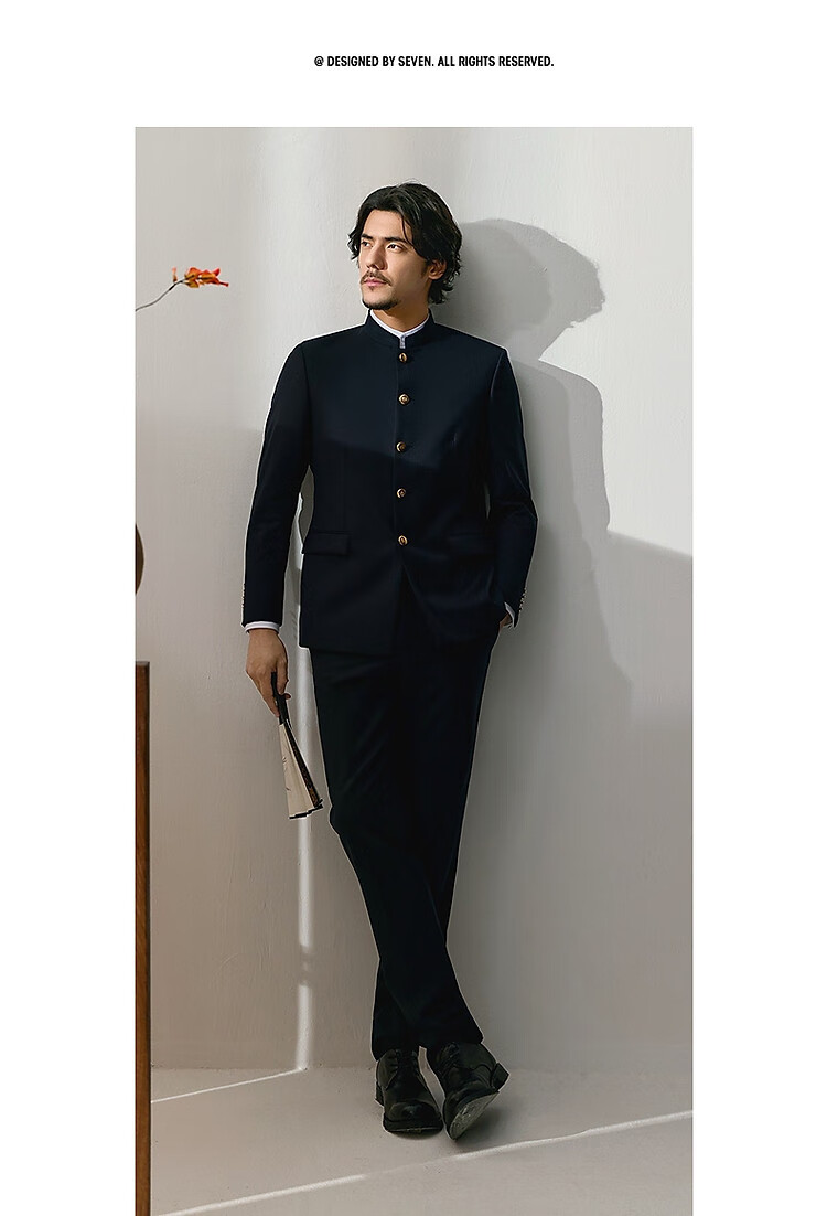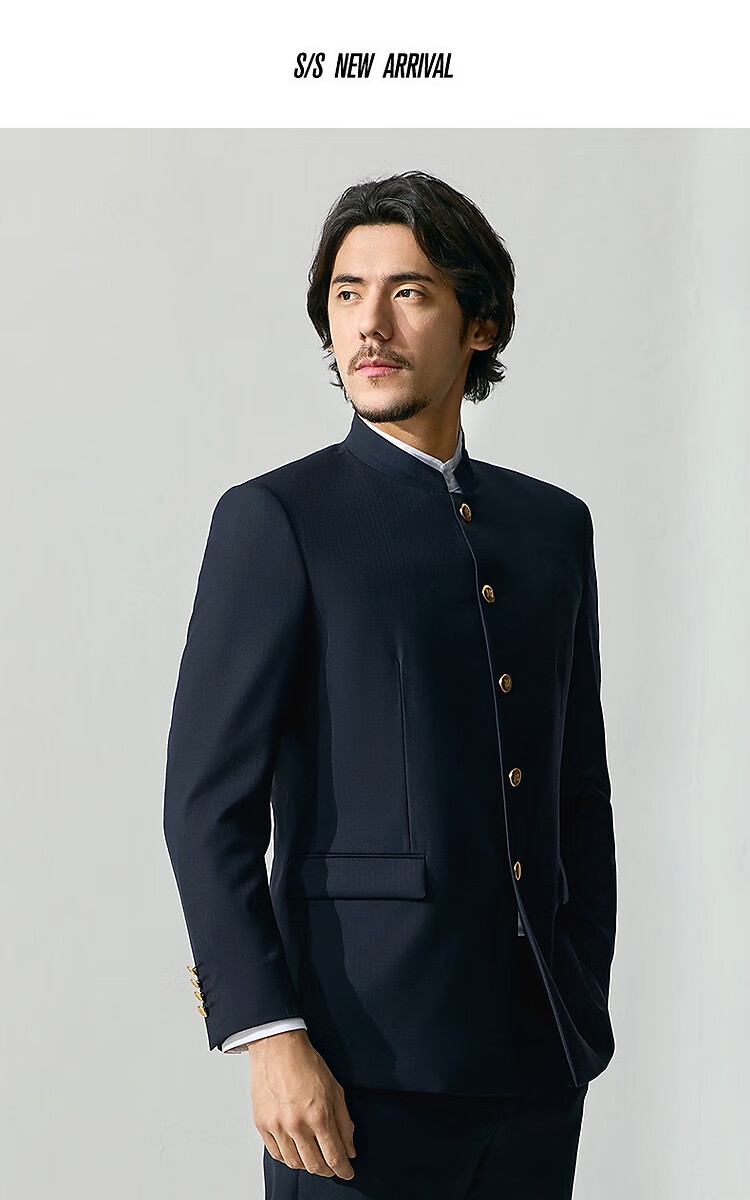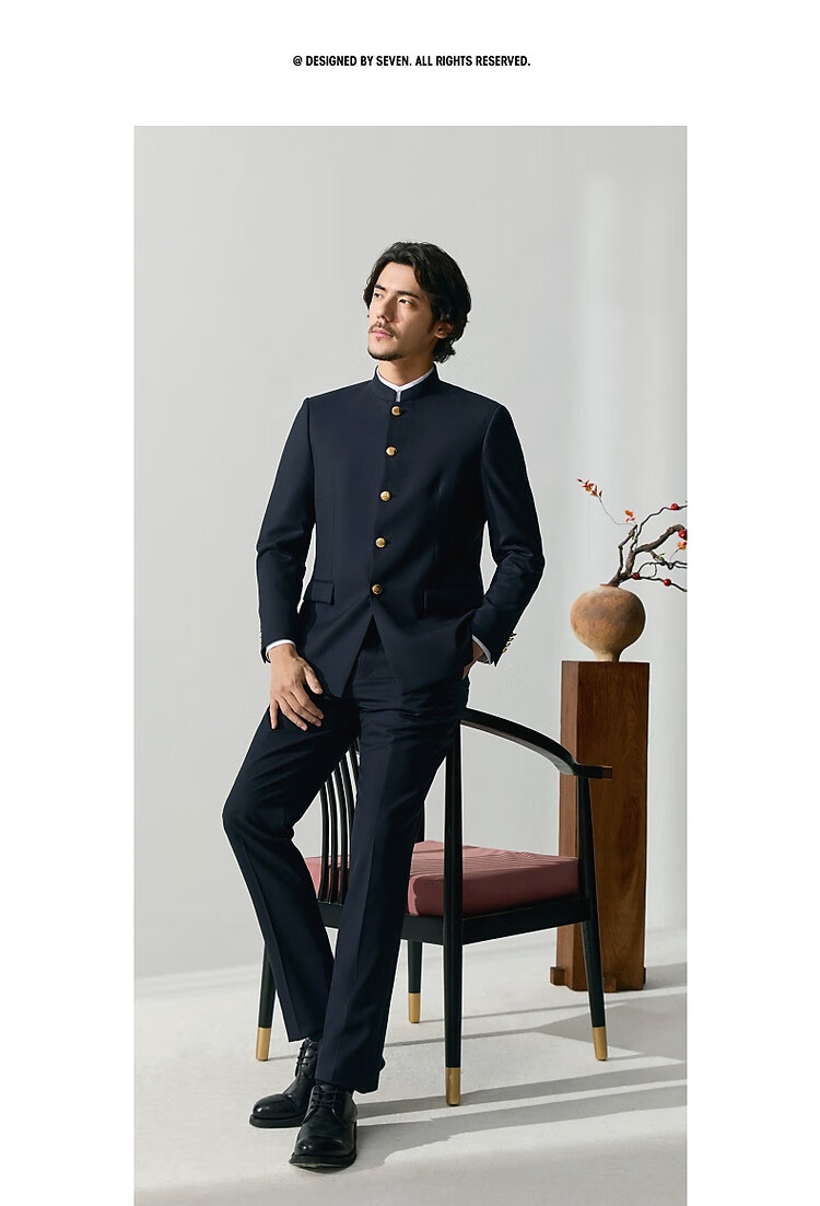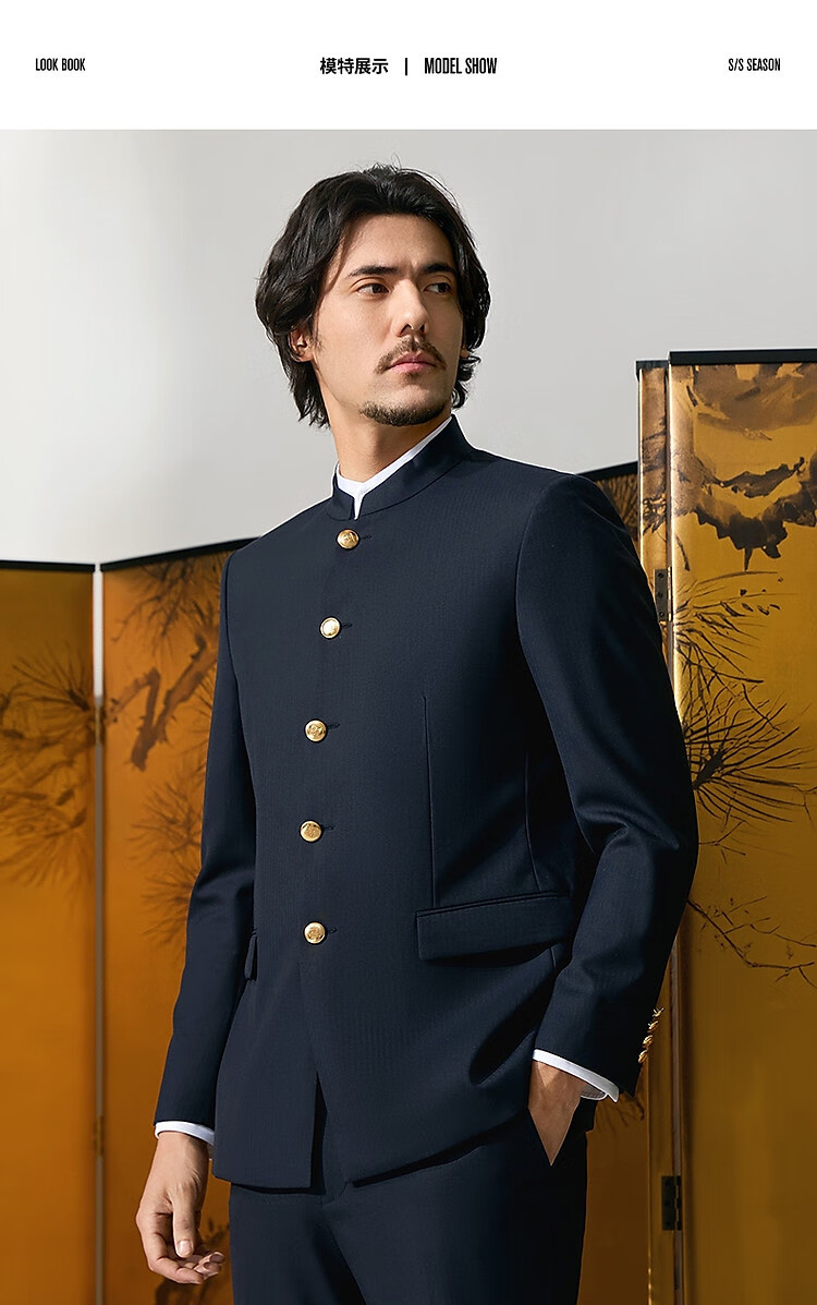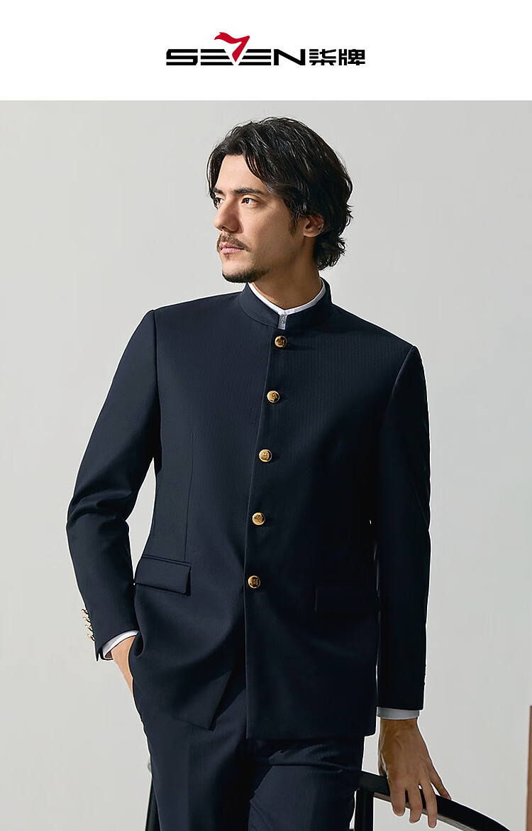 Qipai Chinese tunic woolen suit men's 2025 autumn new style middle-aged men's Chinese stand-up collar business suit dress Tibetan blue Chinese stand-up collar 175B B48 (175/96B)