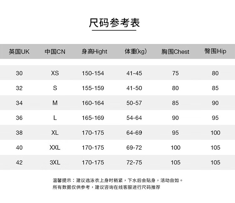 China (cm) 160-165/84-86 165-170 / 88-90 167-172 / 92-96 168-173 / 98-102 170-176 / 106-110