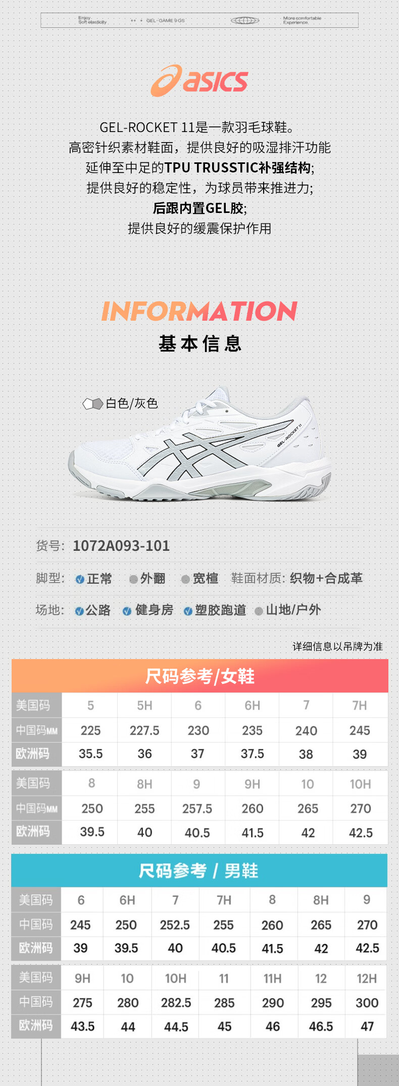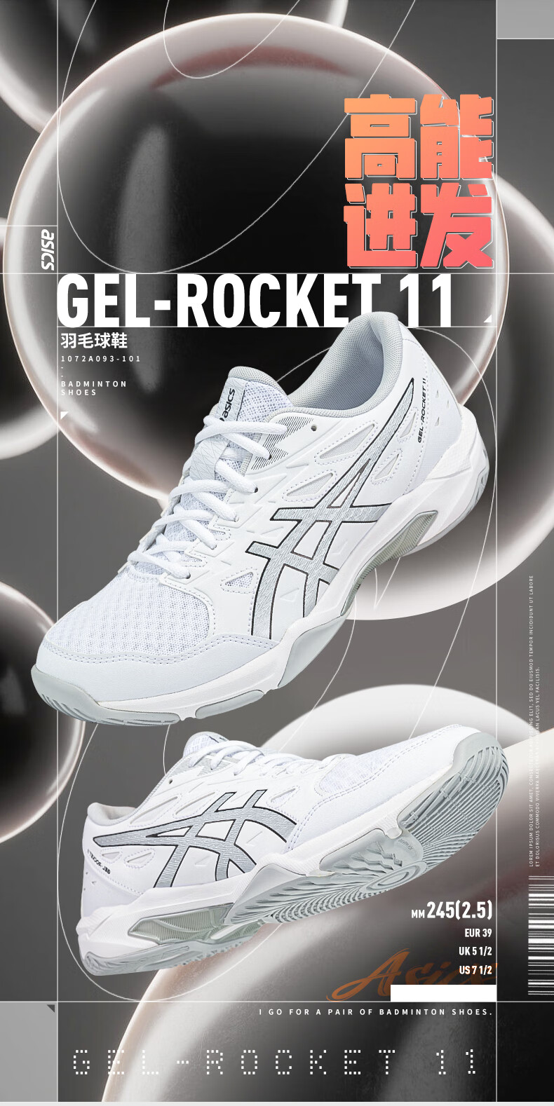Asics badminton shoes for men and women professional stable wear-resistant sports shoes breathable training shoes GEL-ROCKET 11 white/grey 38