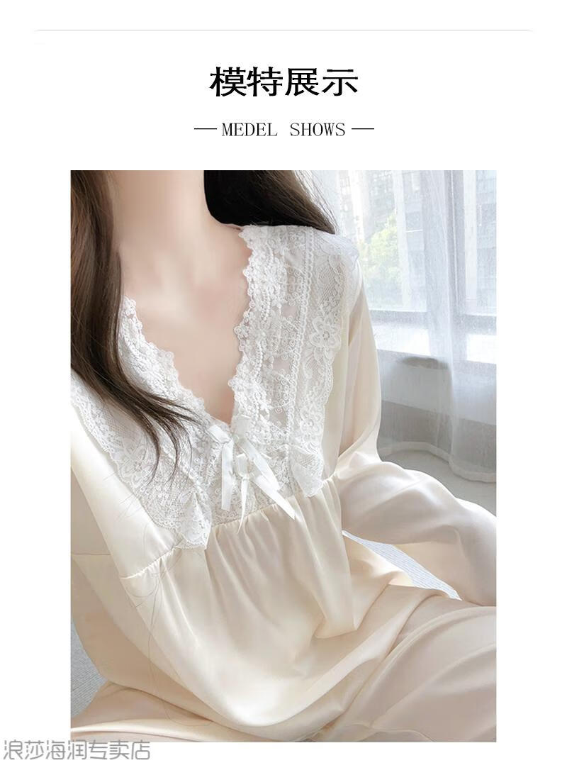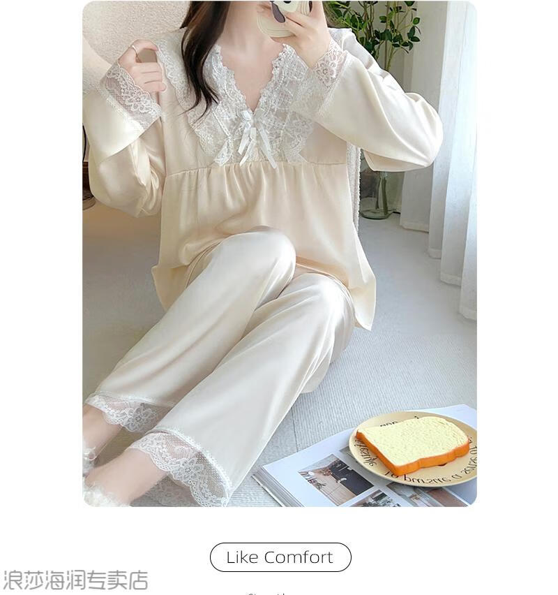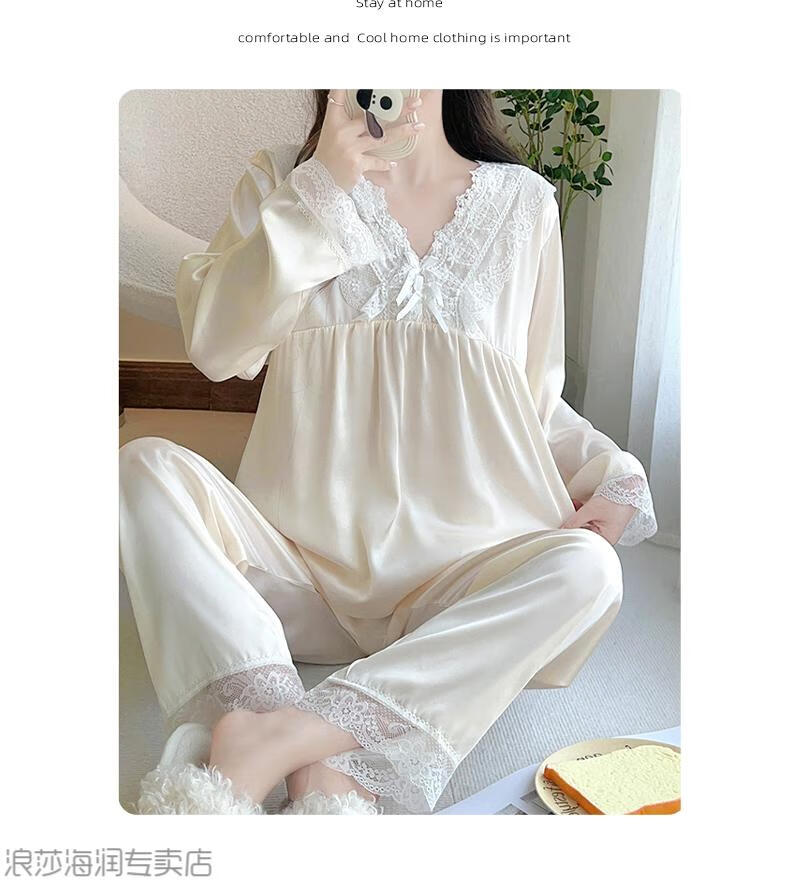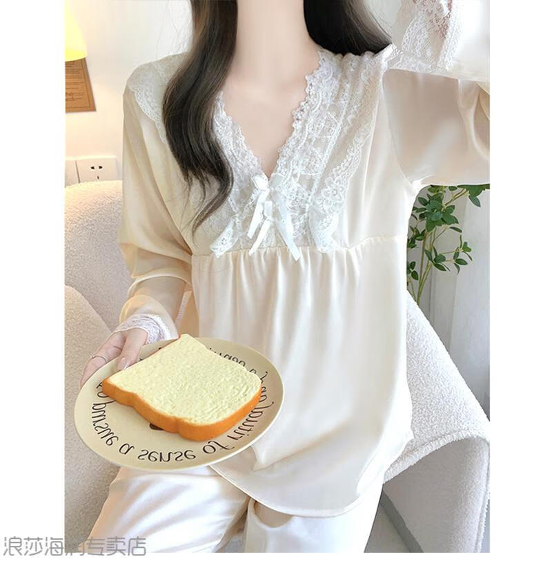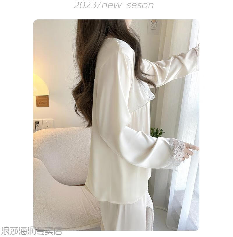 LangSha Light Luxury Pure Desire Lace Collar Sexy Pajamas Women's Spring and Autumn Ice Silk Long Sleeve Suit New Year's Home Clothing Champagne Apricot Double Length