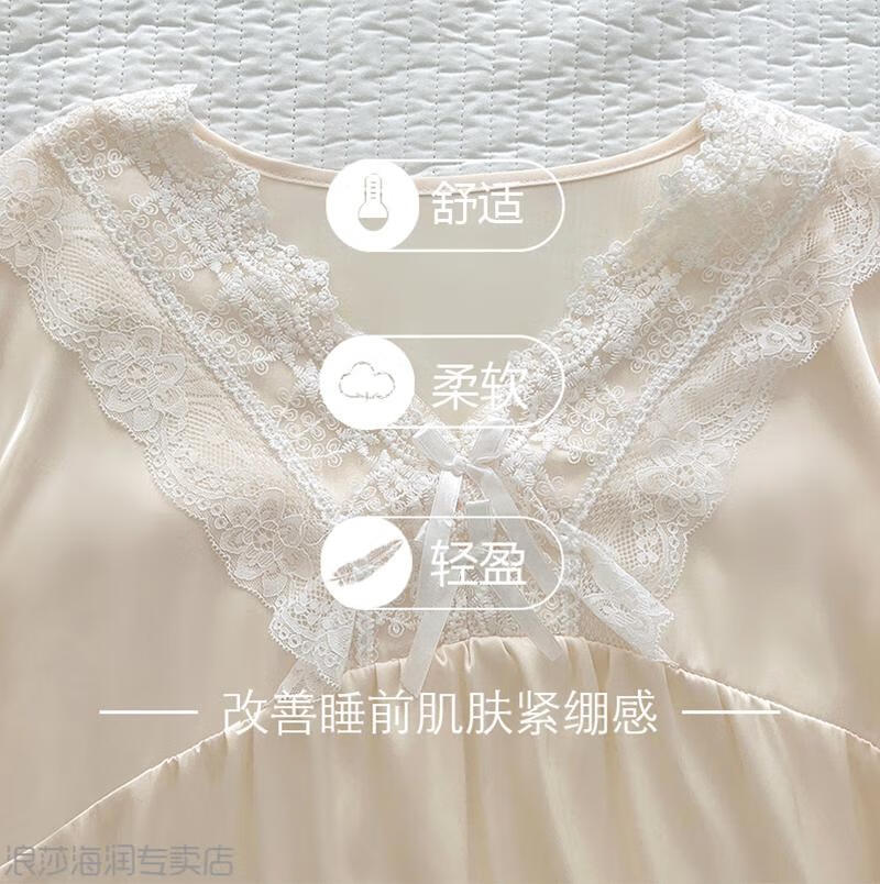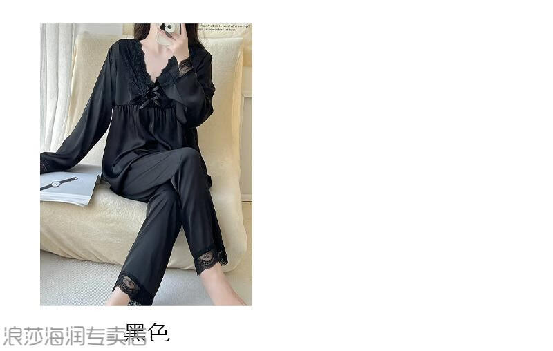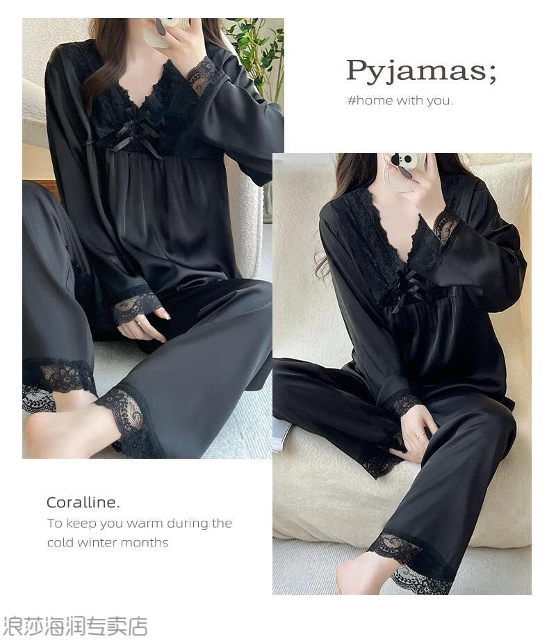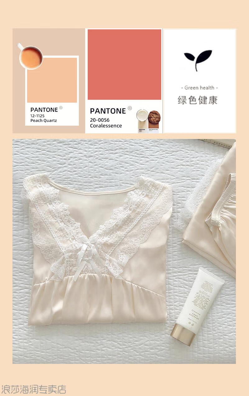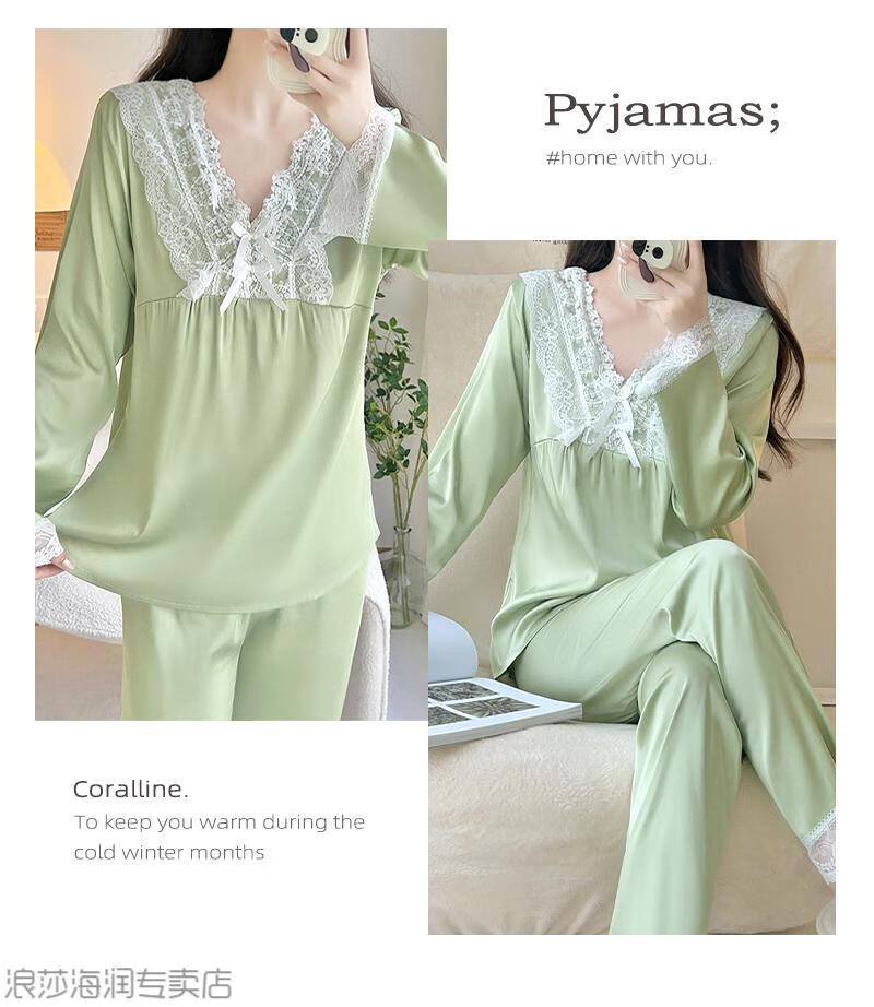 LangSha Light Luxury Pure Desire Lace Collar Sexy Pajamas Women's Spring and Autumn Ice Silk Long Sleeve Suit New Year's Home Clothing Champagne Apricot Double Length