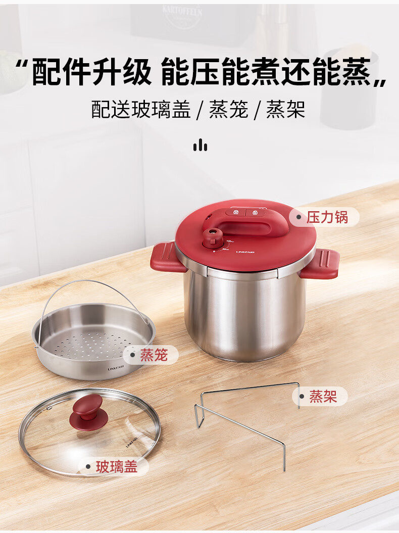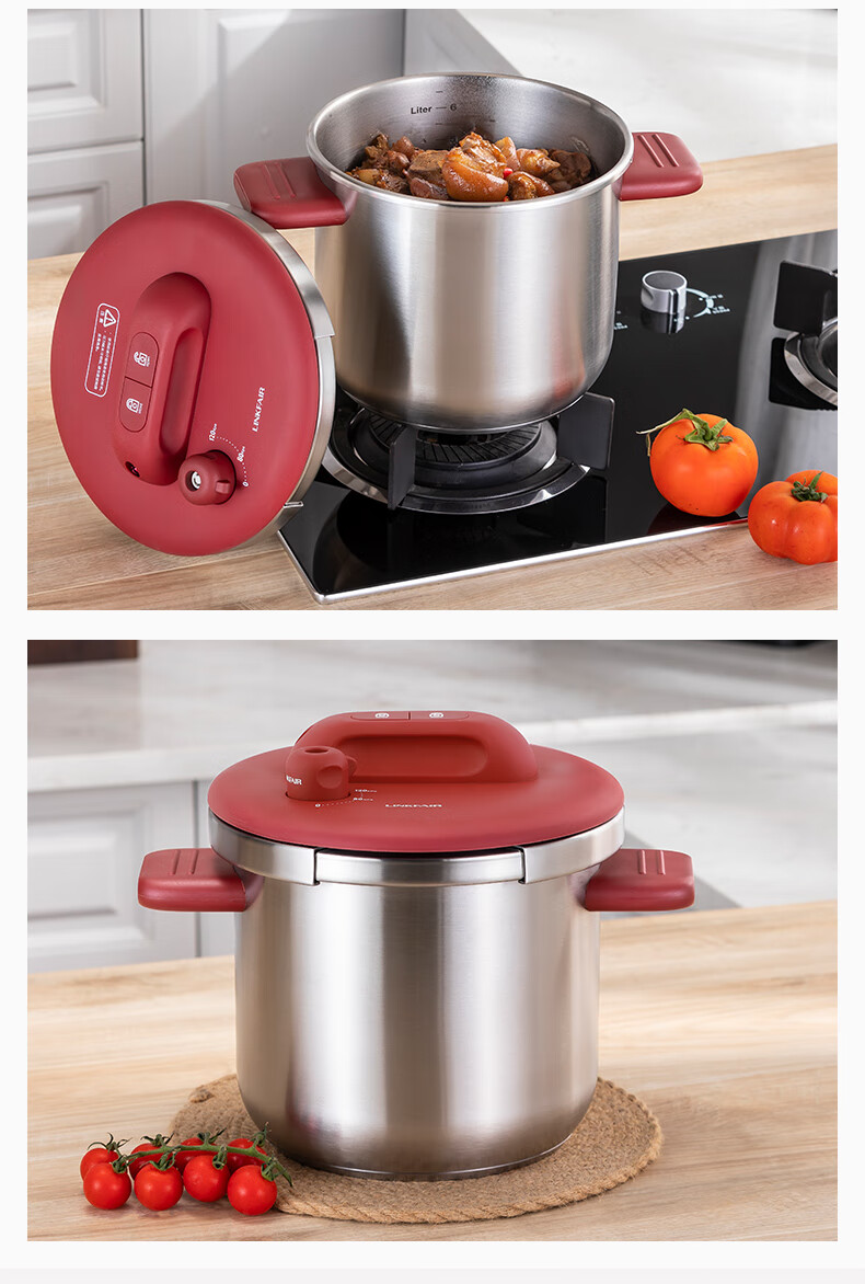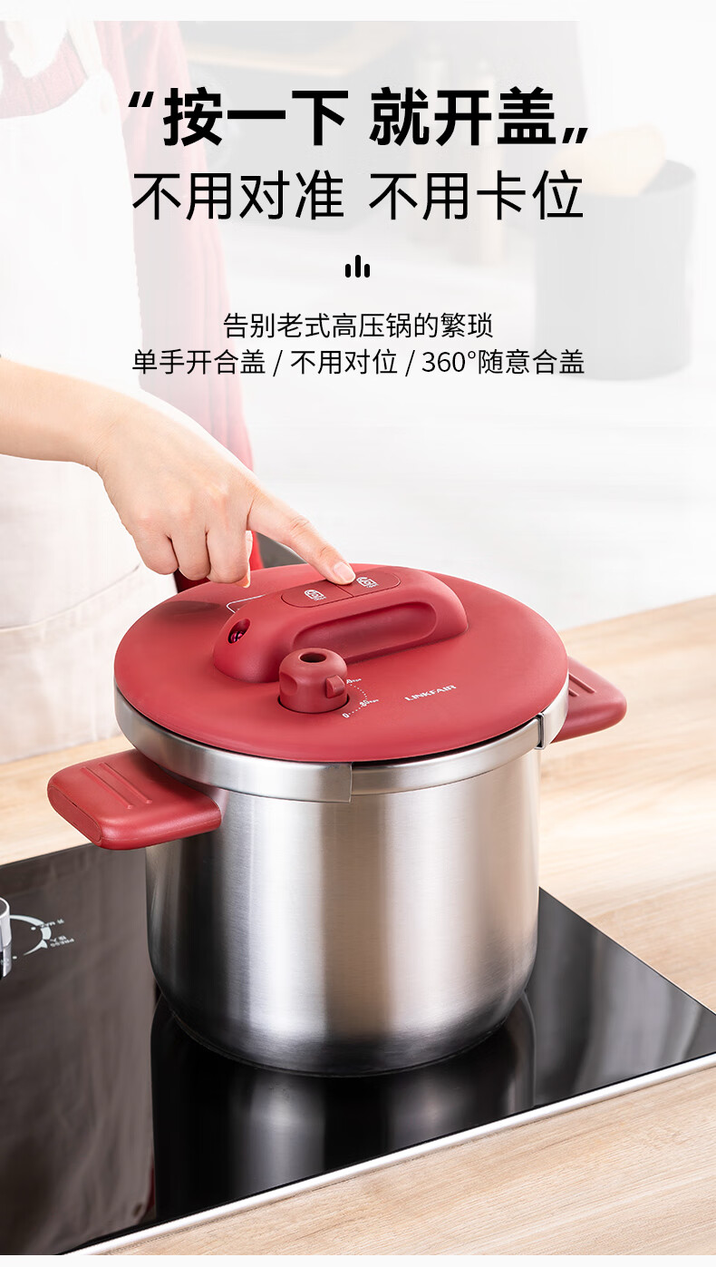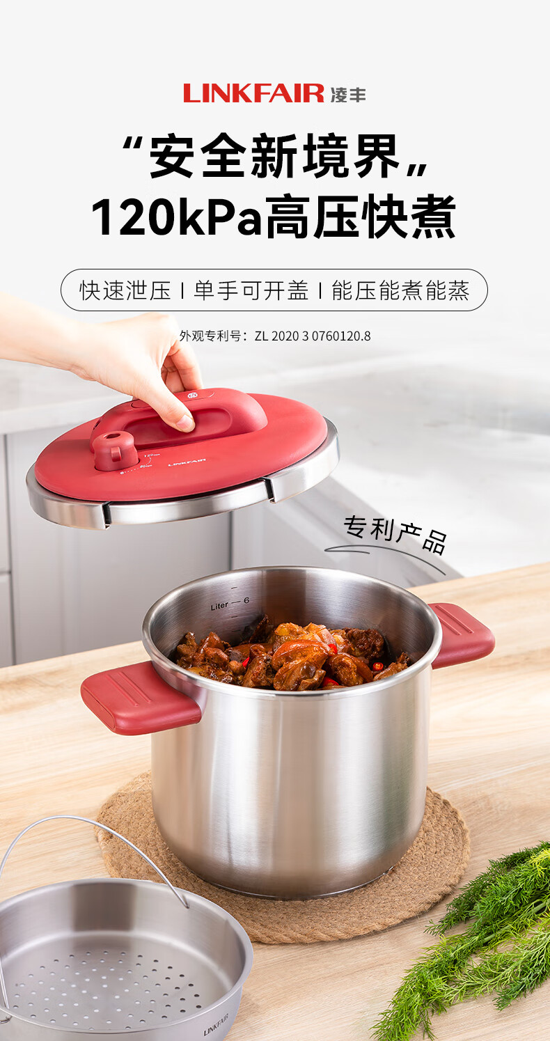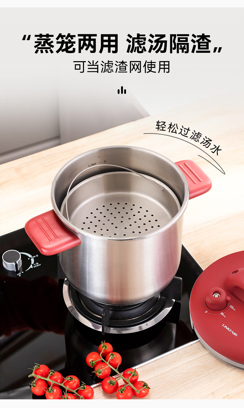 Lingfeng pressure cooker household explosion-proof pressure cooker stainless steel pressure cooker one-hand opening and closing universal gas induction cooker red with glass lid + steamer 22cm 7L