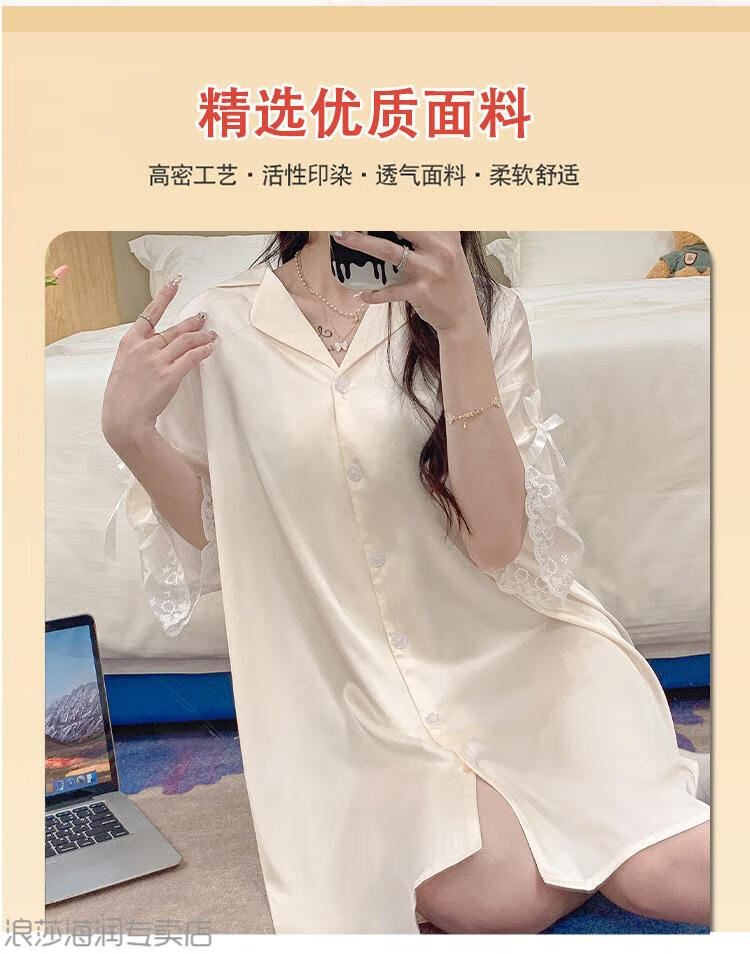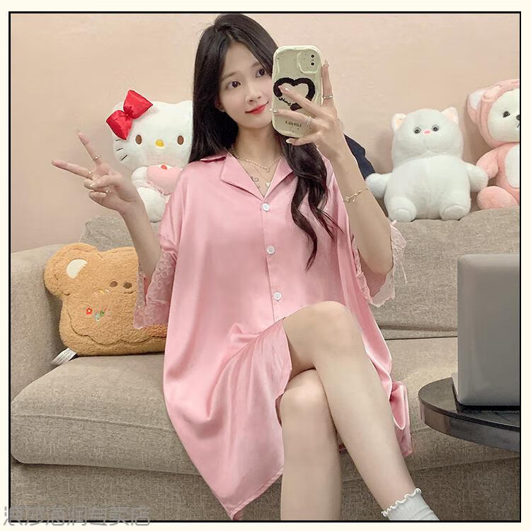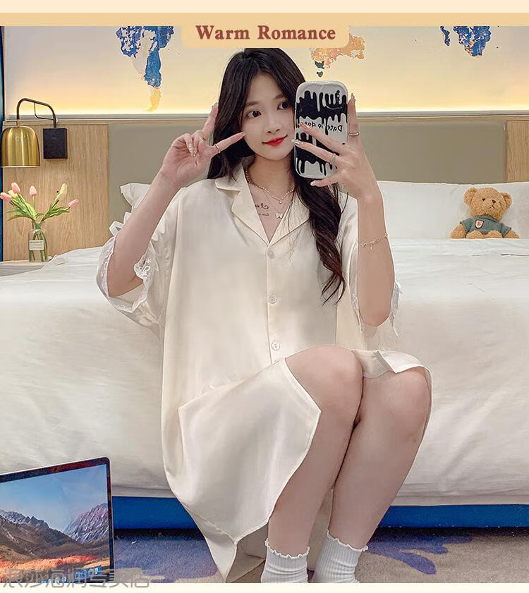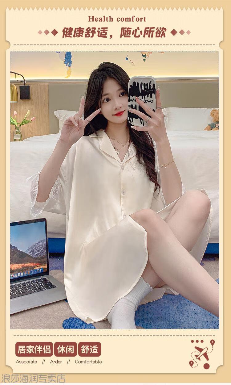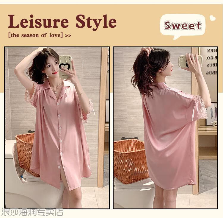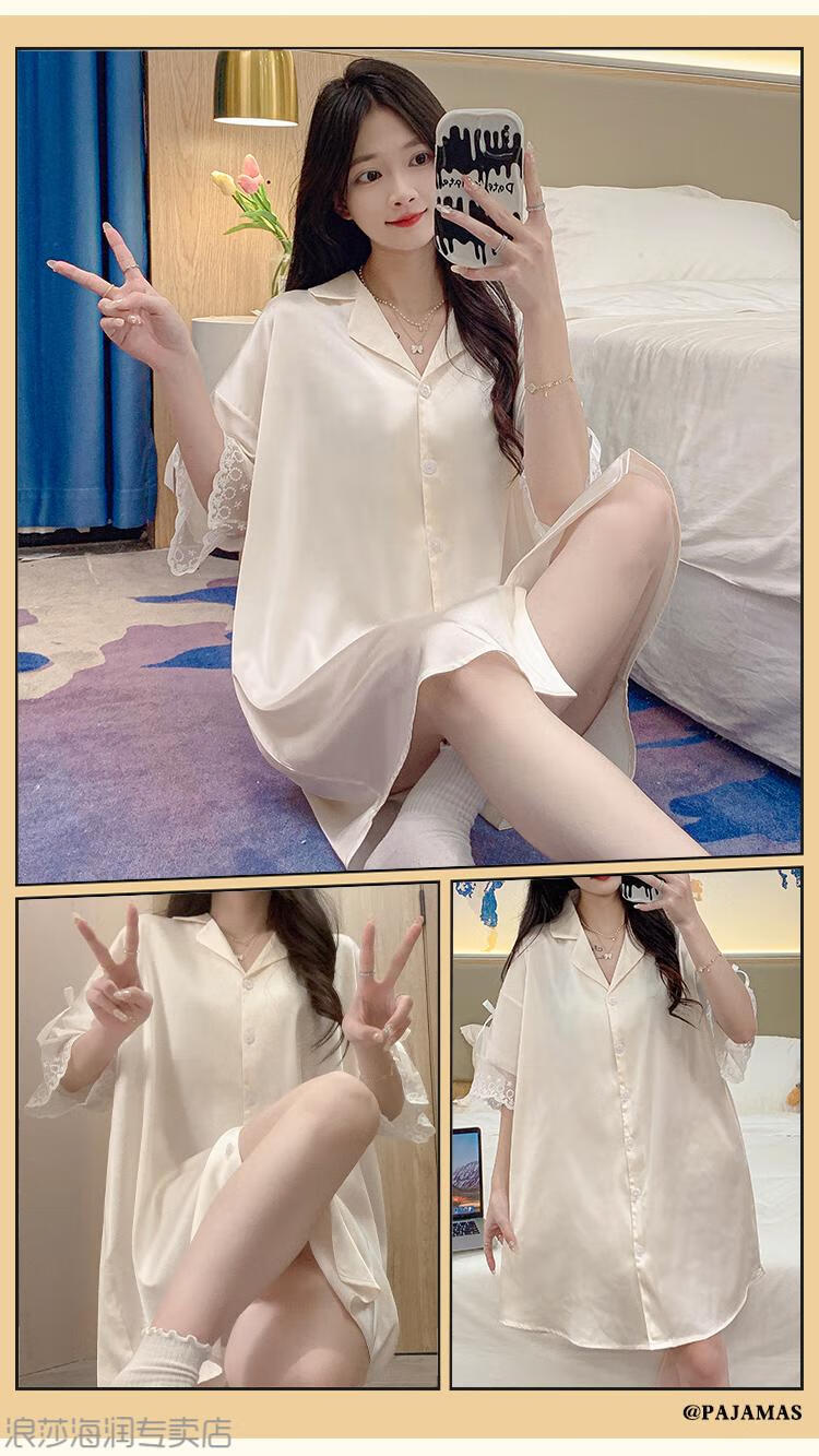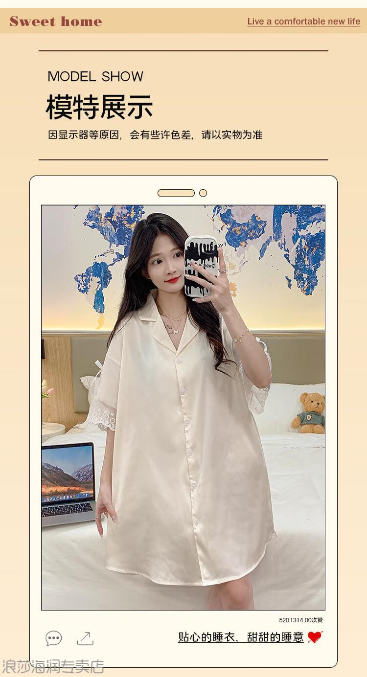 LangSha (LangSha) Light Luxury Ice Silk Nightgown Women's Spring and Autumn New Short-sleeved Korean Style Mid-Length Summer Pajamas Boyfriend Style Sexy Shirt 5000Q 2XL Recommended 140-160 Recommended Jin Jin is equal to 0.5 kg Wear