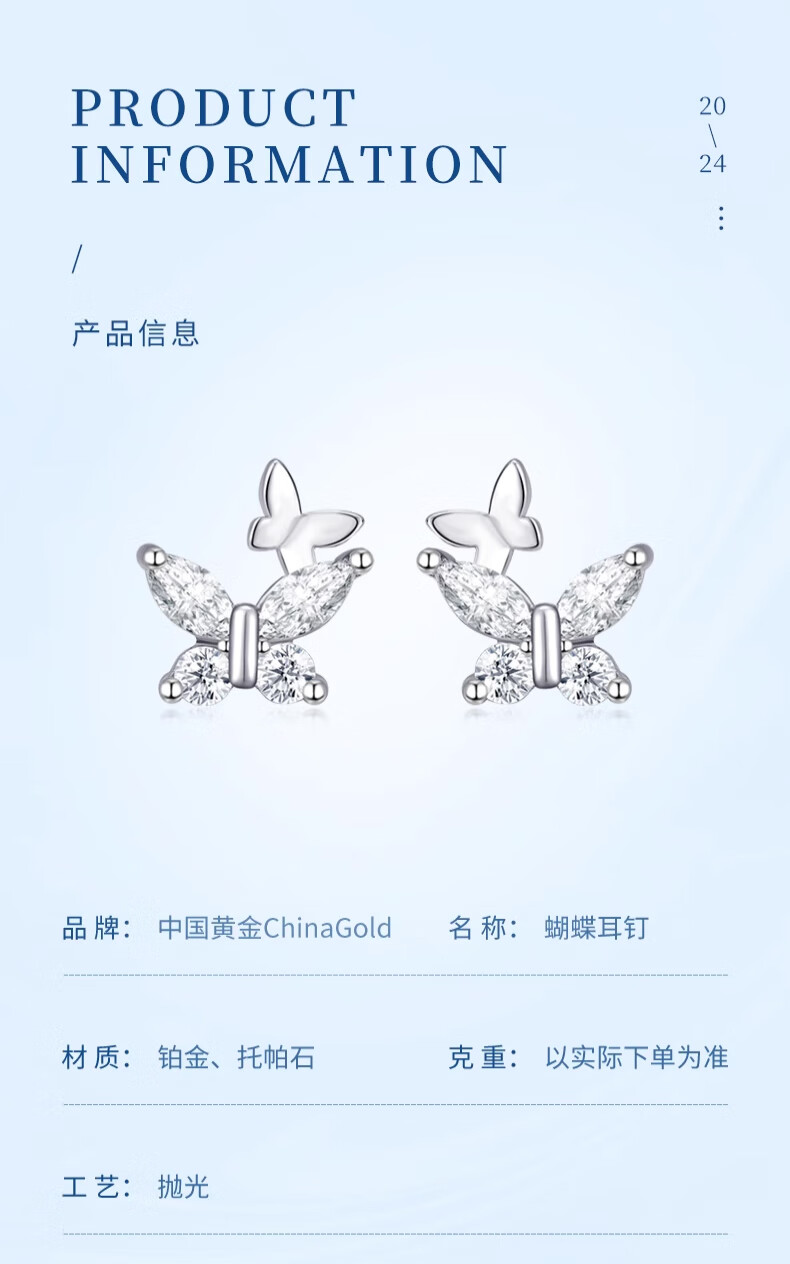 China Gold (CHINA GOLD) Butterfly Earrings PT950 Platinum New Earrings Women's Light Luxury Valentine's Day Birthday Gift for Girlfriend and Wife Platinum Fantasy Butterfly Earrings About 1.1g Zhongjin Gift Box