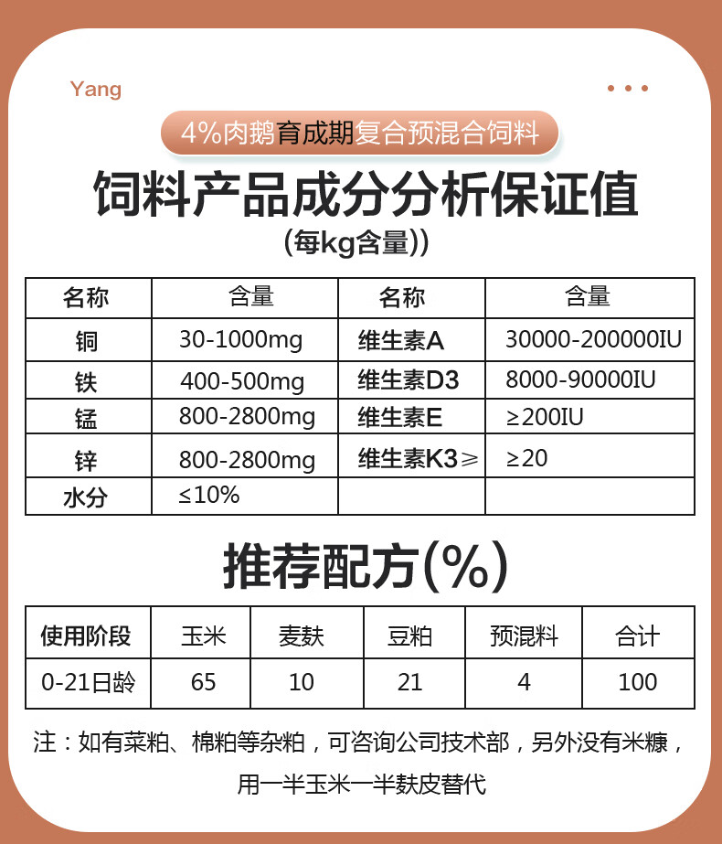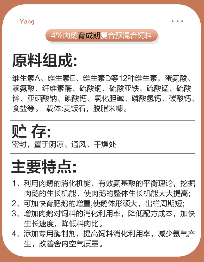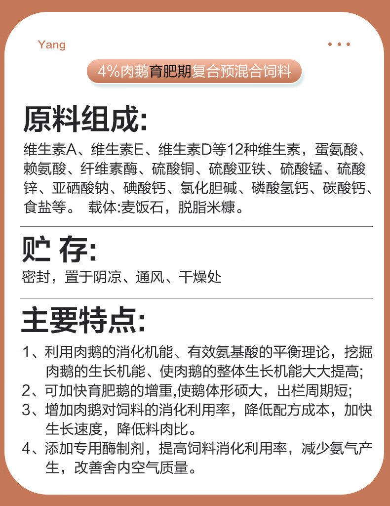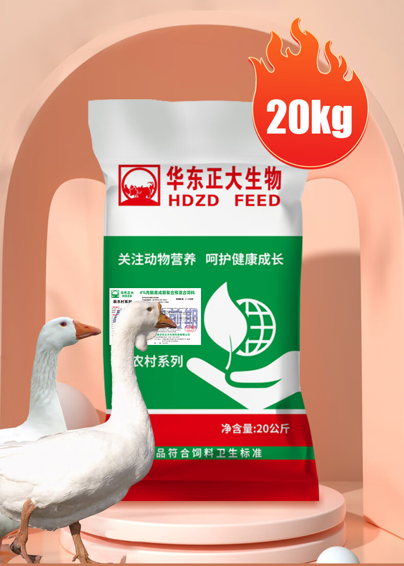 Zhengda Huadong Zhengda 4% meat goose pre- and late-stage premix has precise proportioning to promote growth, disease resistance, fattening, and improve breeding capacity. 1 bag of 4% meat goose pre-mix (0-20 days). 1 bag of 40 Jin Jin is equal to 0.5 kg. Mixed with 1000 Jin Jin is equal to 0.5 kg. Feed