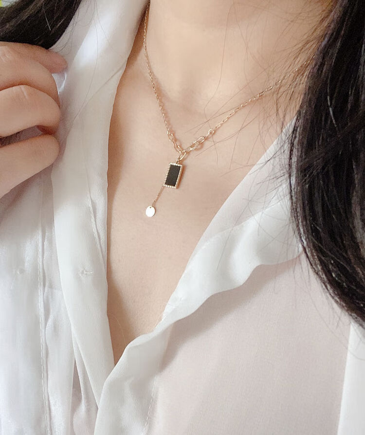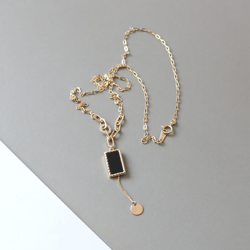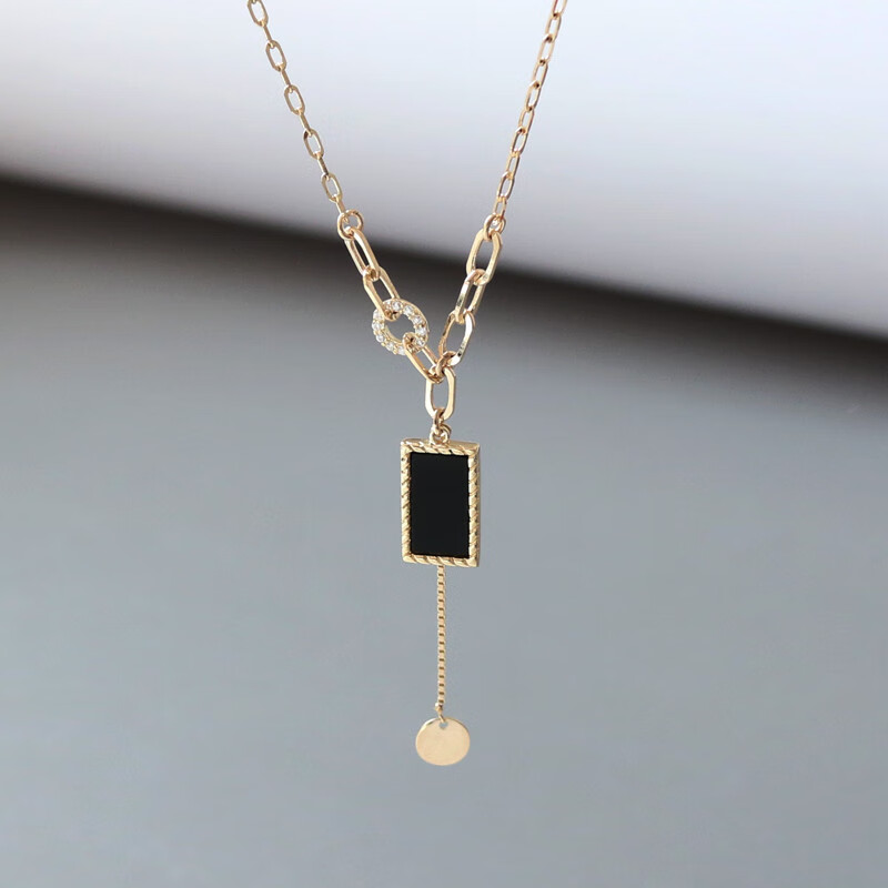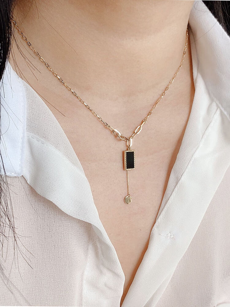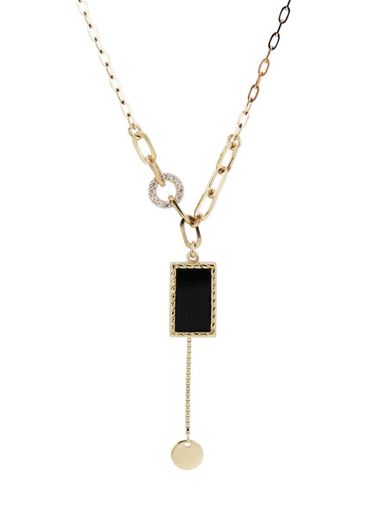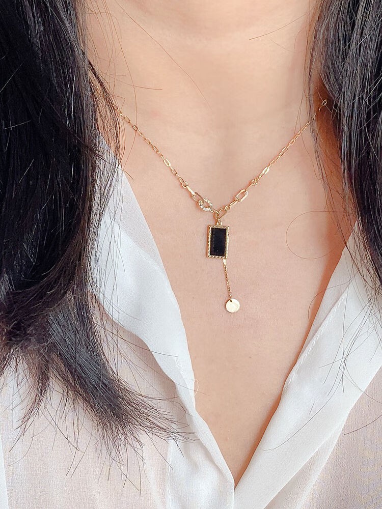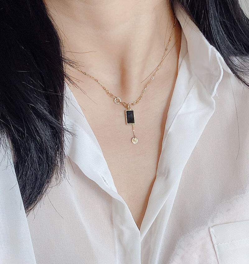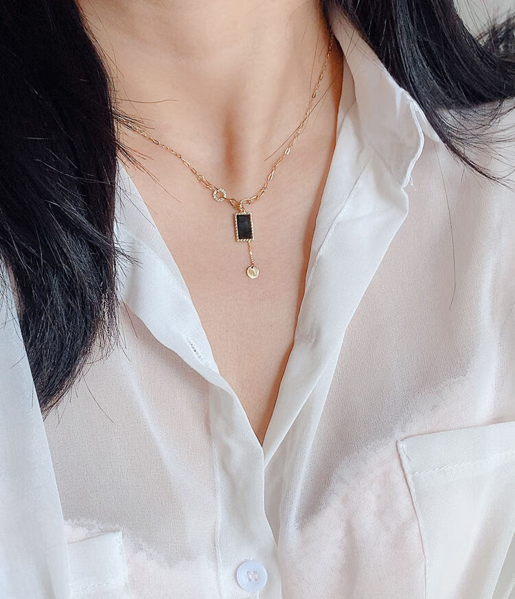 Chishe Versatile Fashionable Tassel Korean 14K Gold Necklace Women's Donut Square Black Agate K Gold Clavicle Chain Full Length 42cm