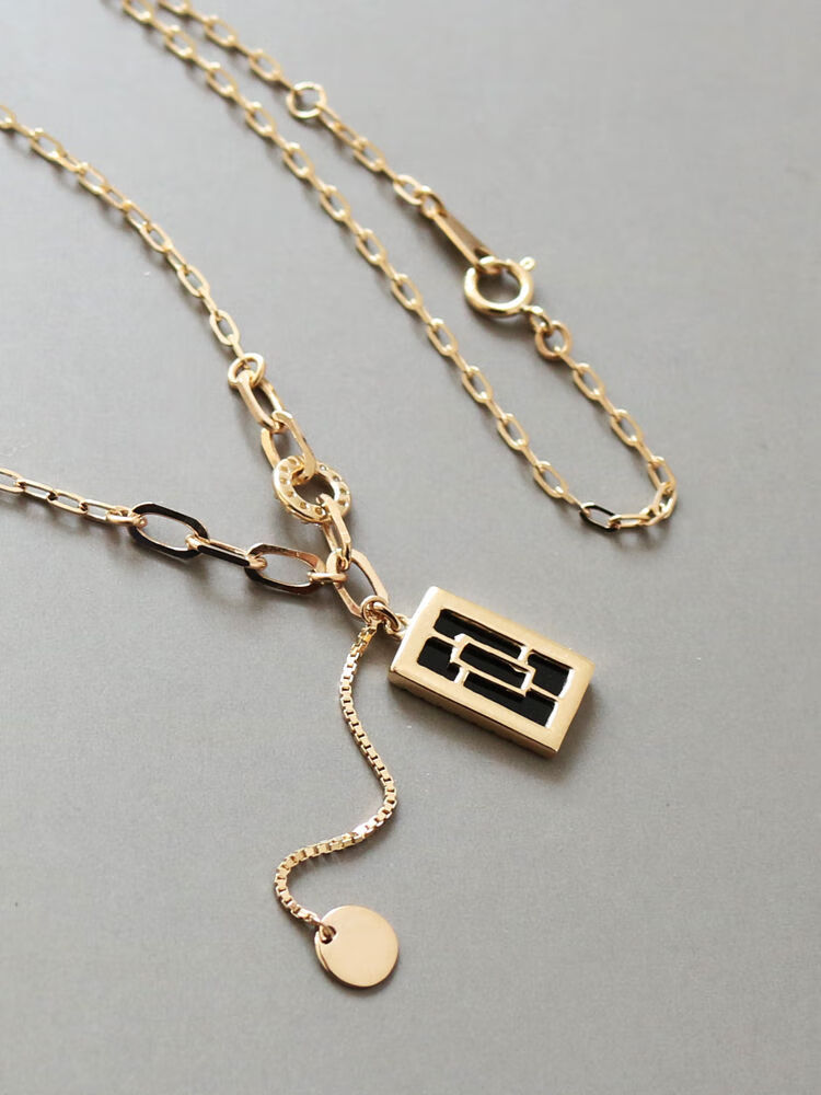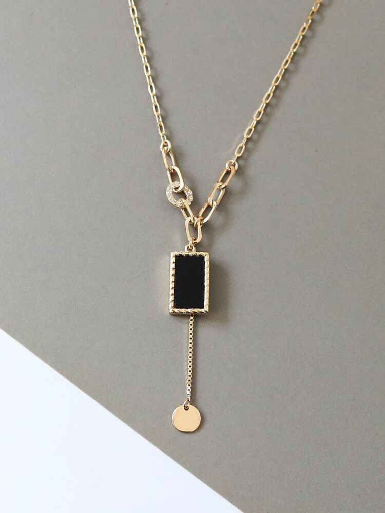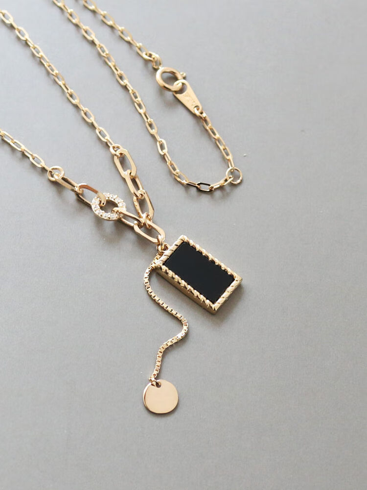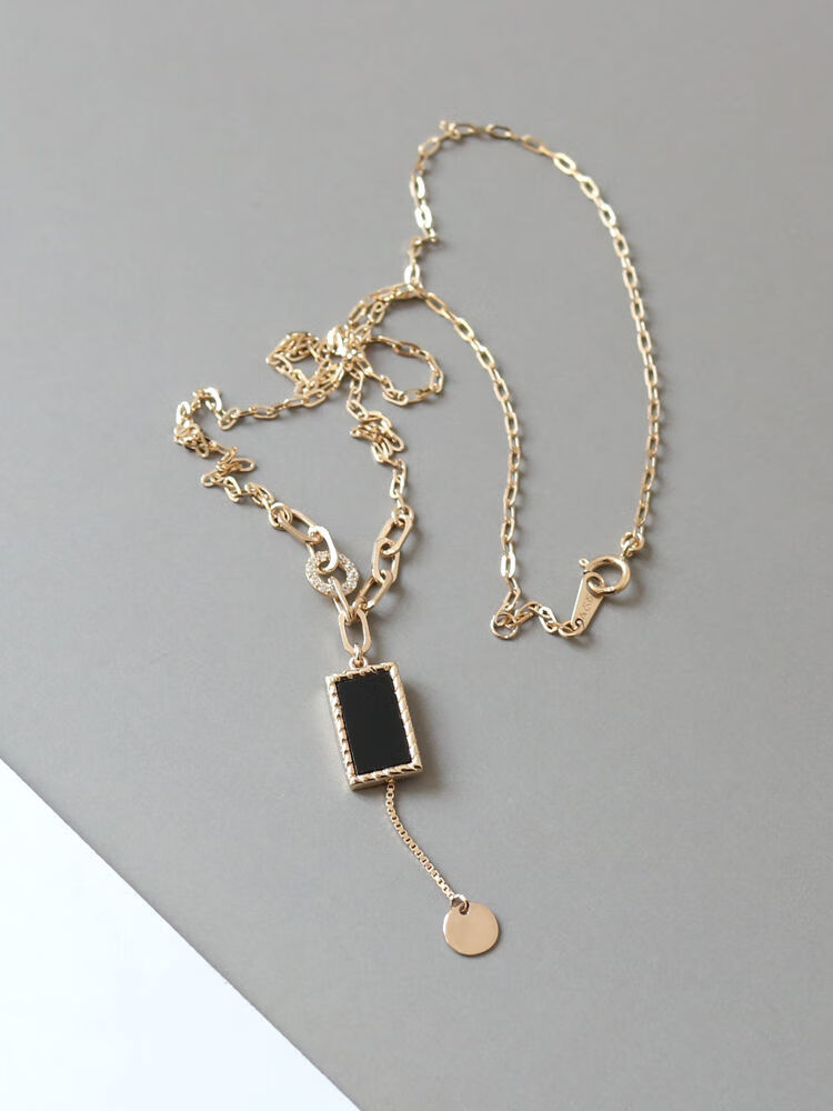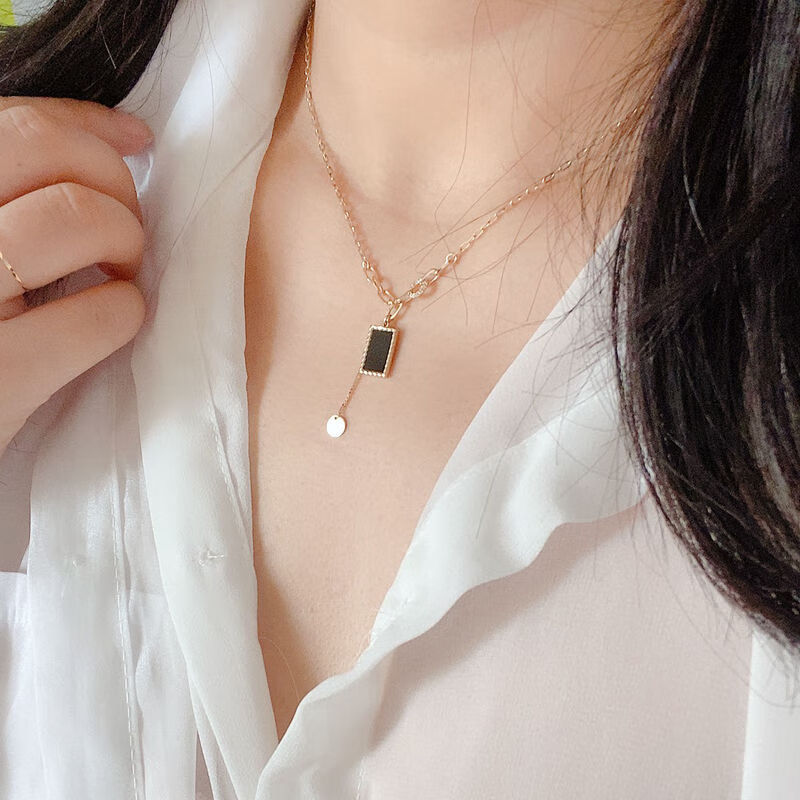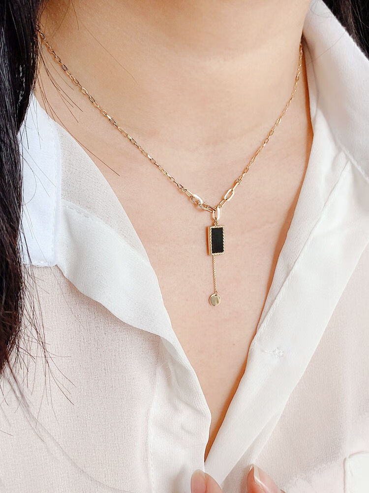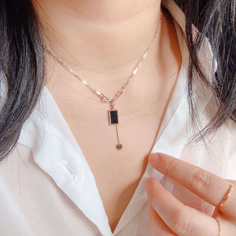 Chishe Versatile Fashionable Tassel Korean 14K Gold Necklace Women's Donut Square Black Agate K Gold Clavicle Chain Full Length 42cm