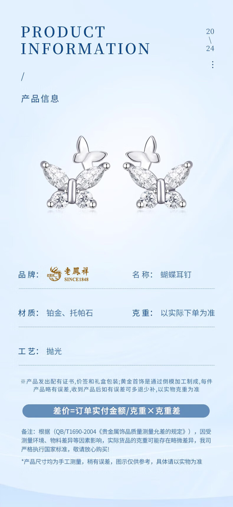Lao Fengxiang butterfly earrings PT950 platinum new year earrings for women light luxury anniversary birthday gift for girlfriend and wife PT950 platinum butterfly earrings about 1.3g