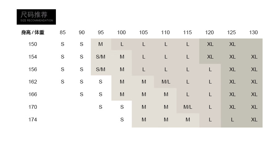 China (cm) 160-165/84-86 165-170 / 88-90 167-172 / 92-96 168-173 / 98-102 170-176 / 106-110