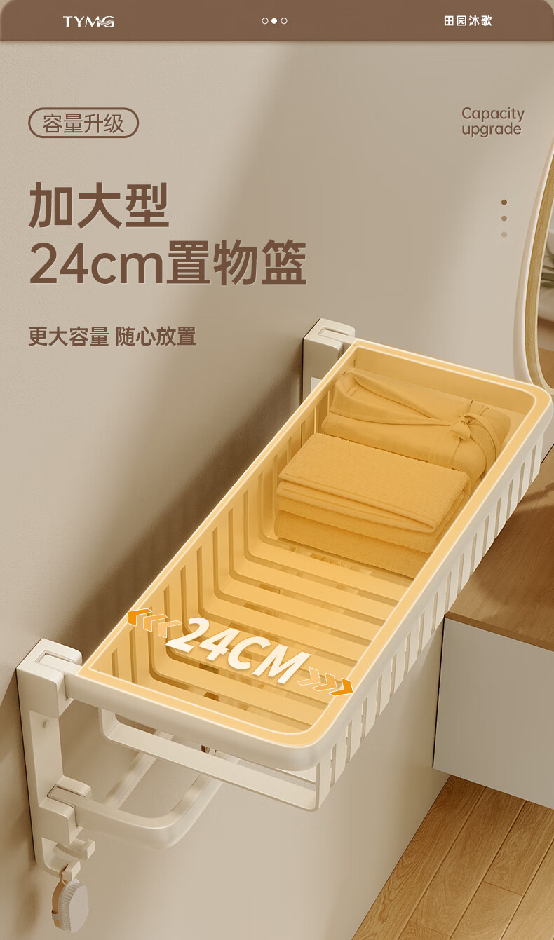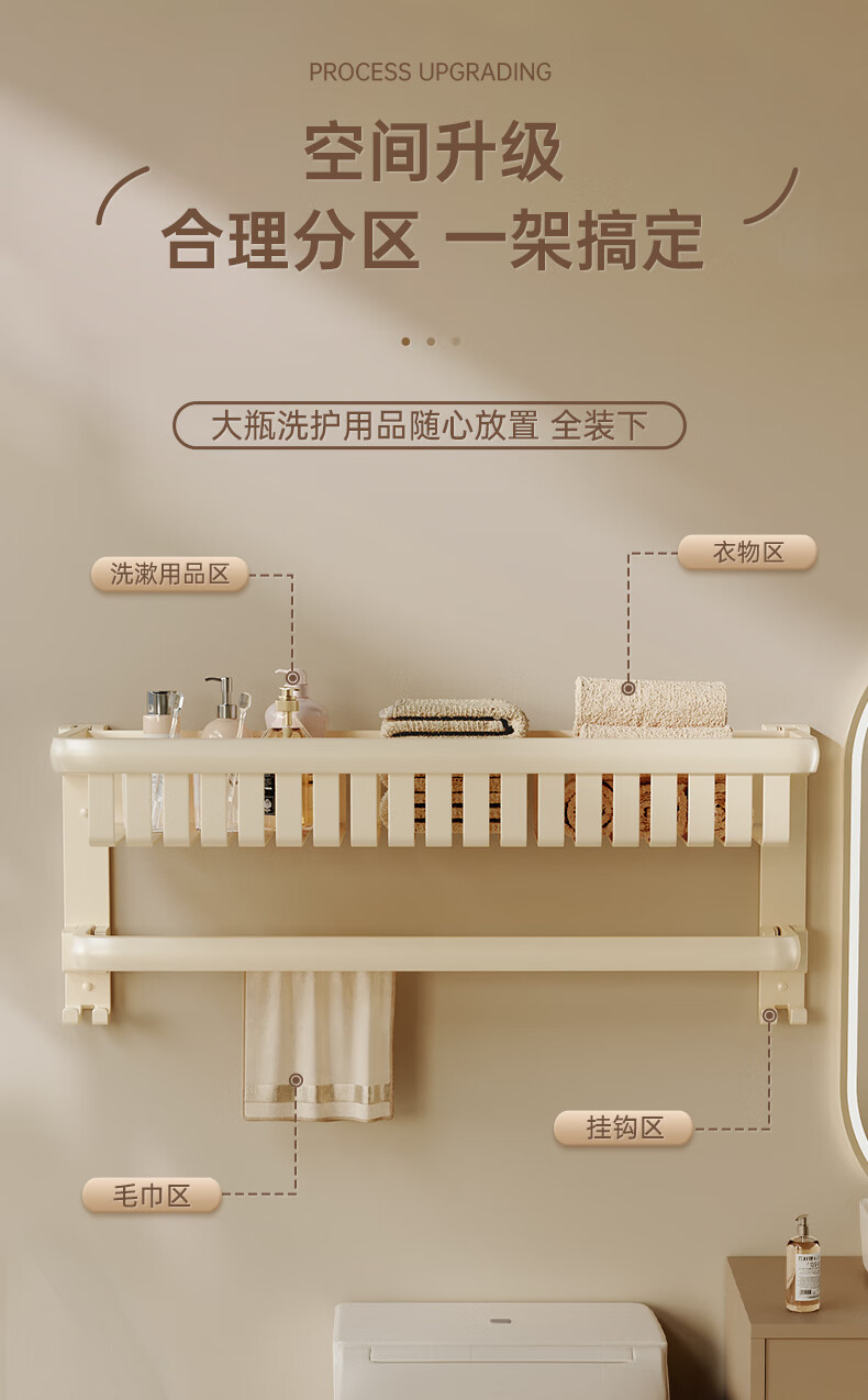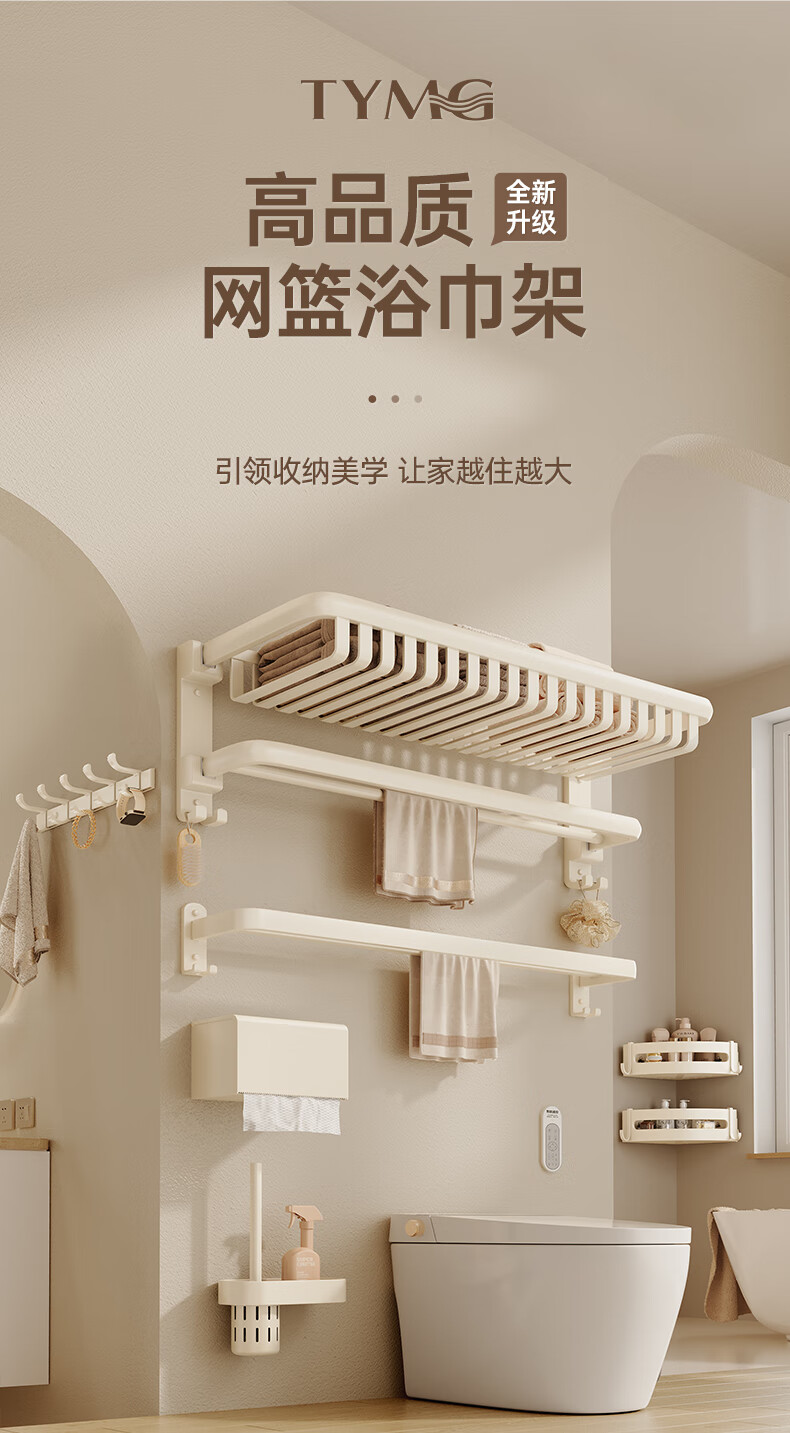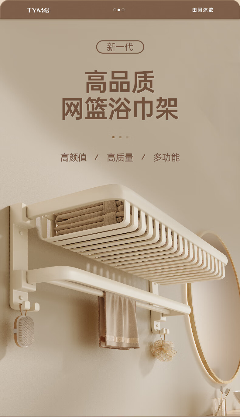 Pastoral Muge Cream Style Towel Rack No Punch Bathroom Storage Rack Bathroom Towel Rack Bathroom Toilet Wall Milk White Milk White Double Folding Mesh Basket Towel Rack 60cm