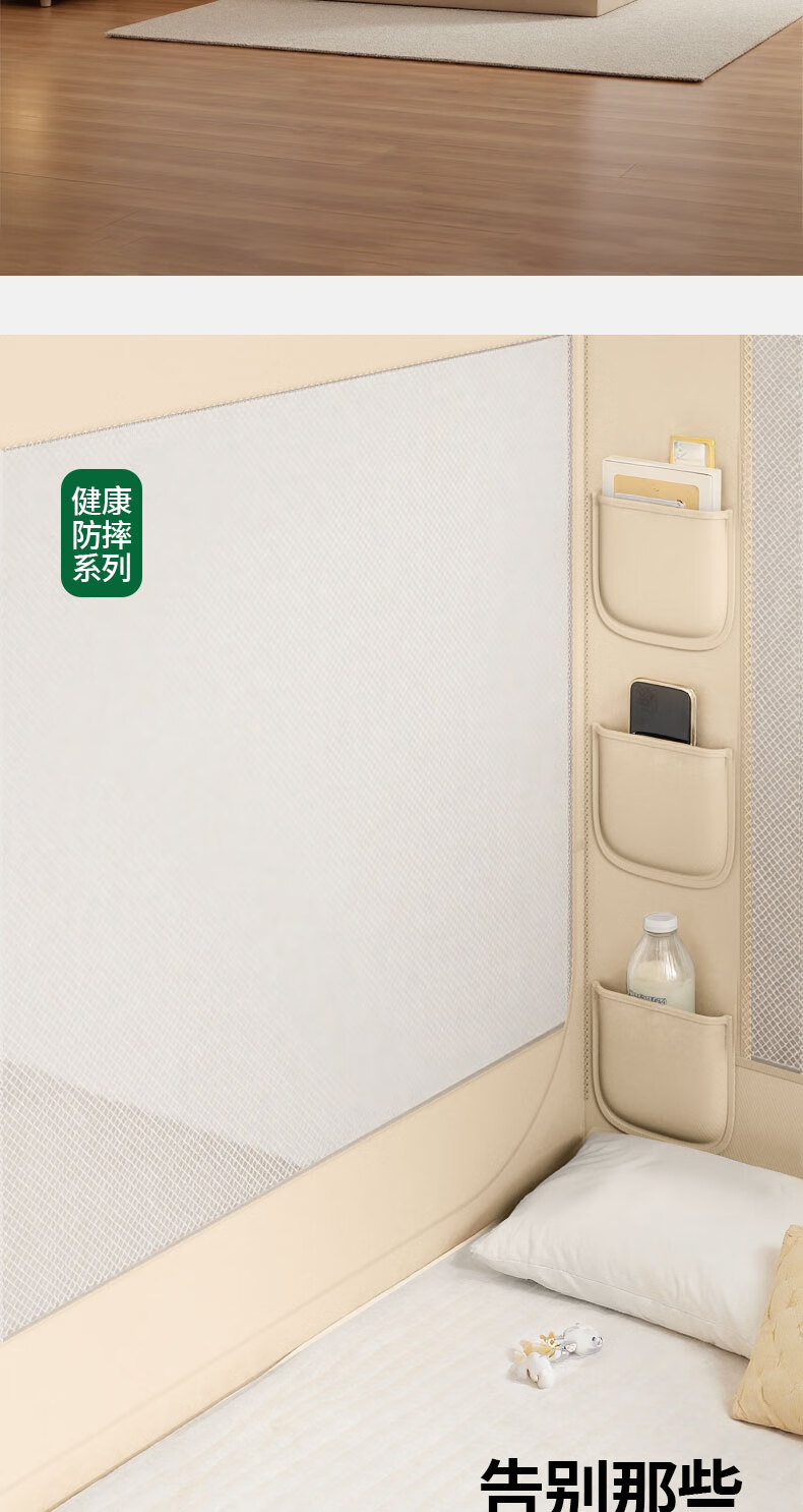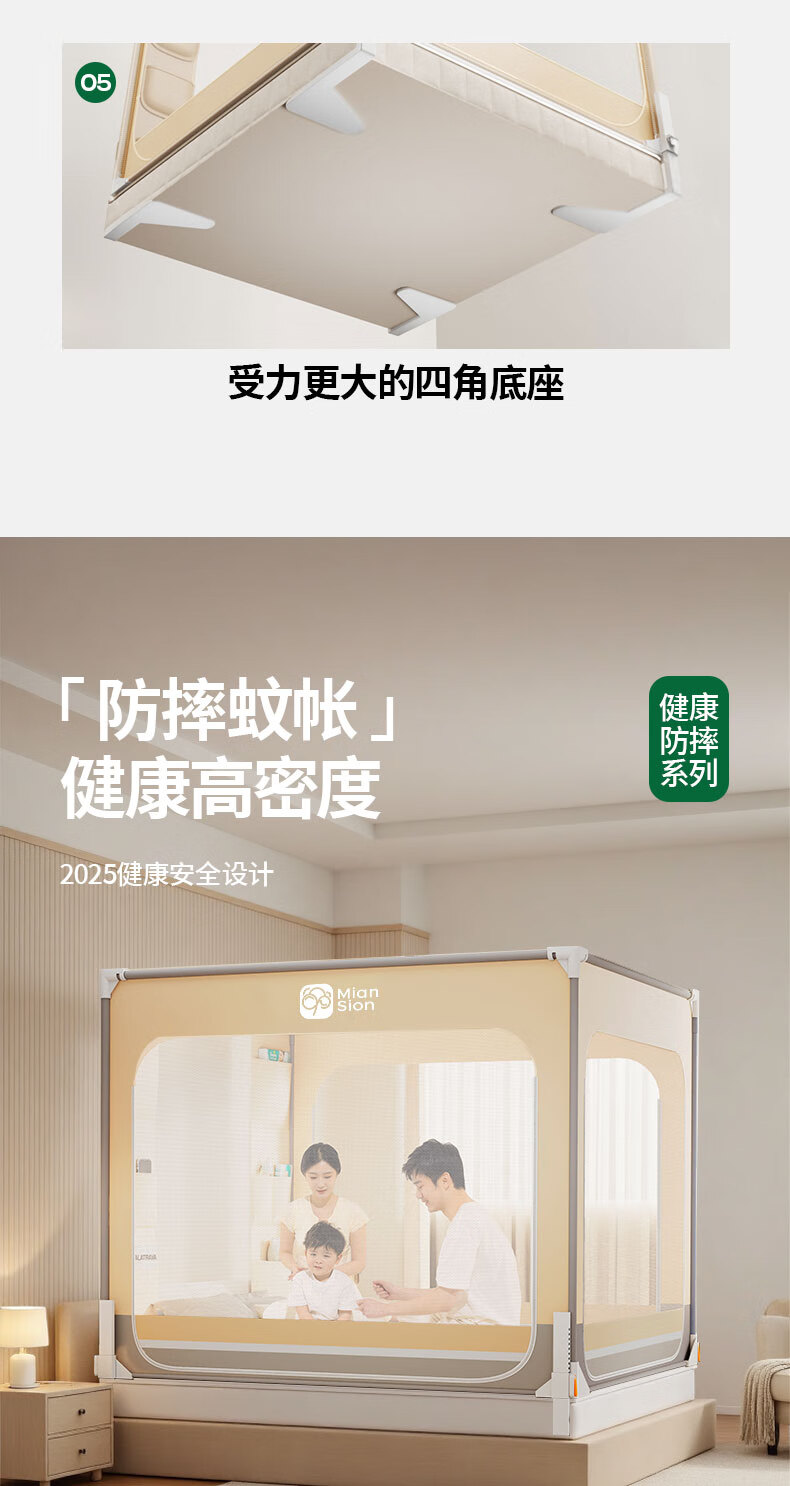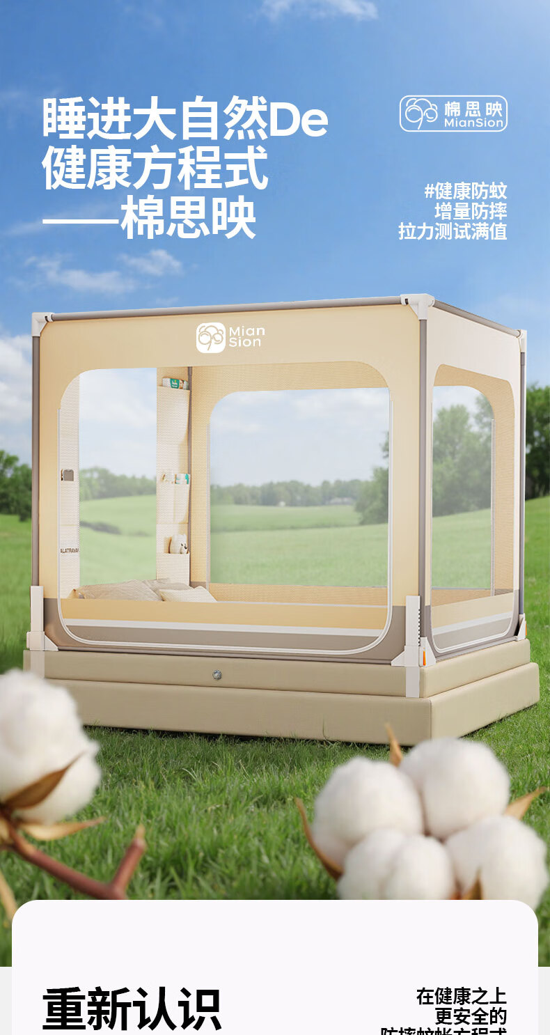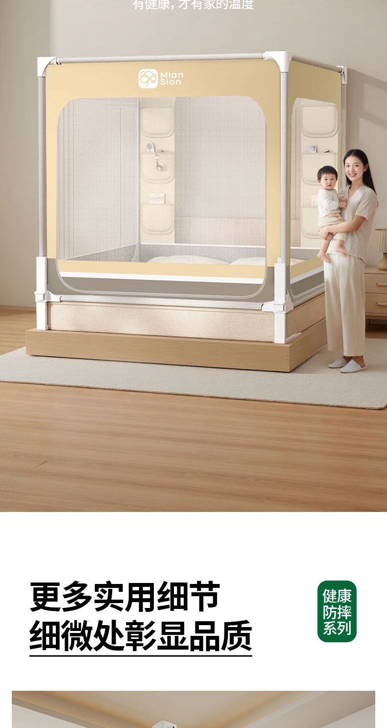 Miansiying mother and baby anti-fall mosquito net frame 1.8 2m Class A household bed sheet fence installation-free yurt full-bottom mosquito net ivory gray-with gear lifting base 2m*1.5m*1.7m丨full bottom thickened anti-fall