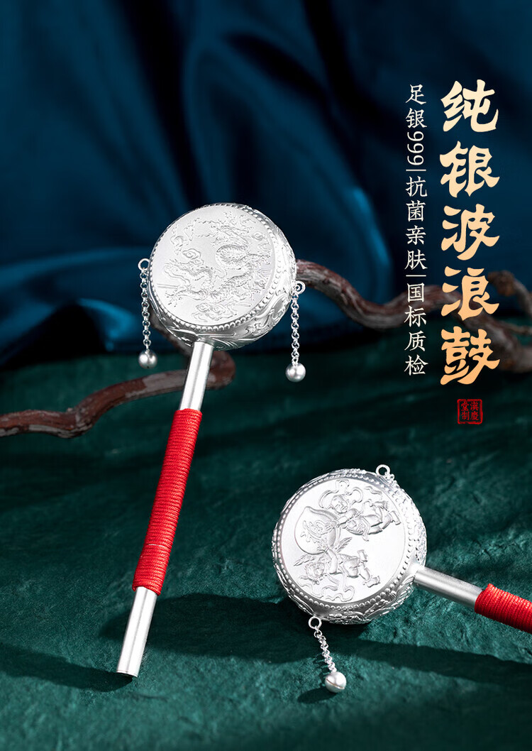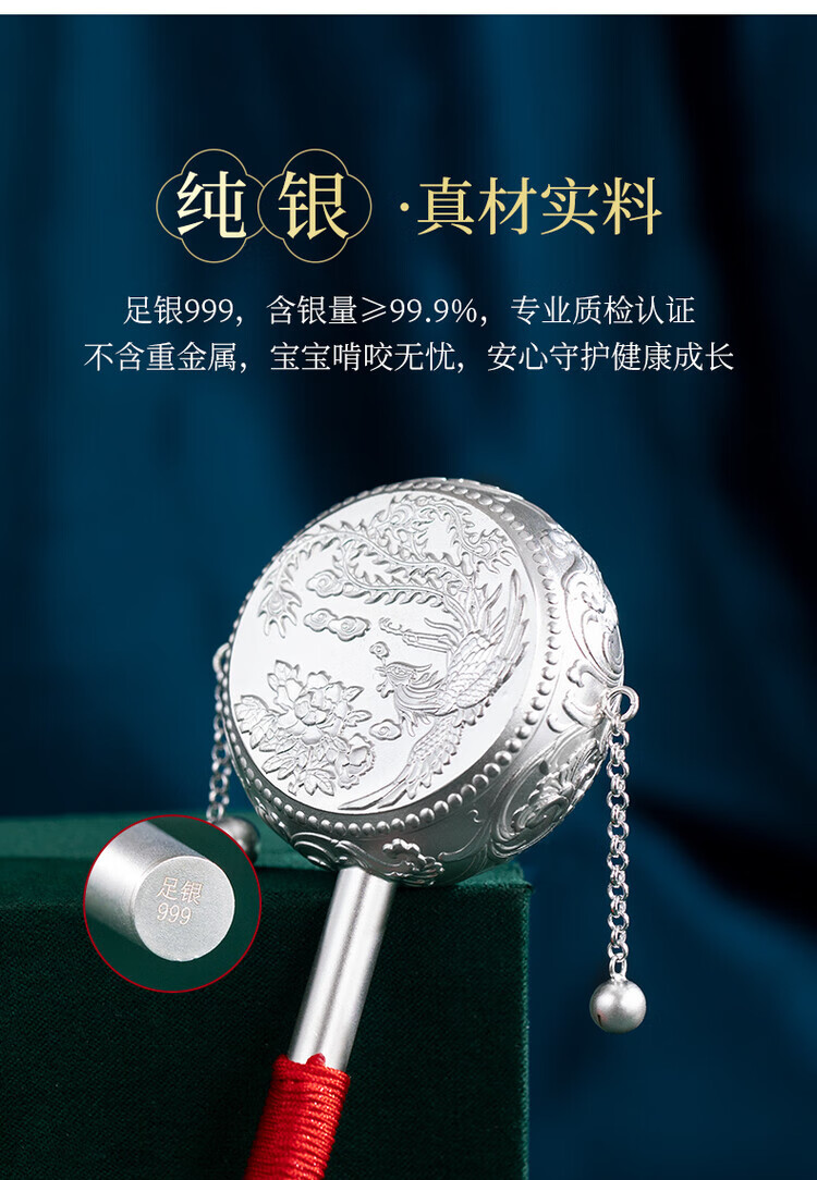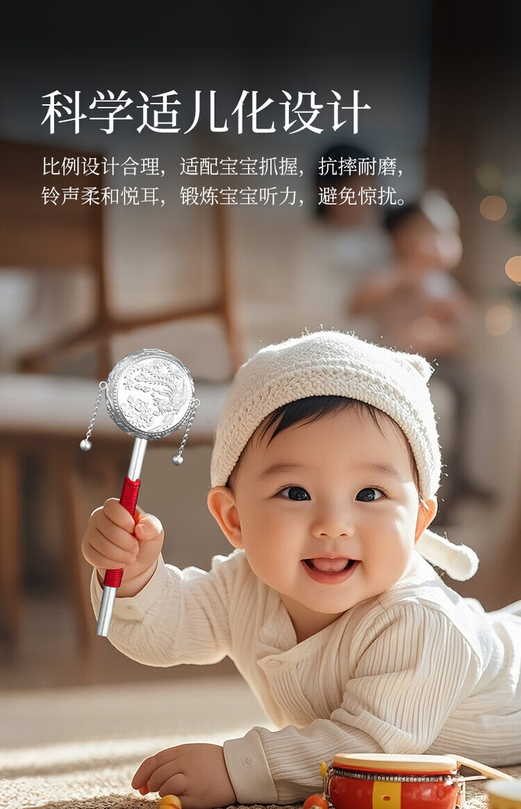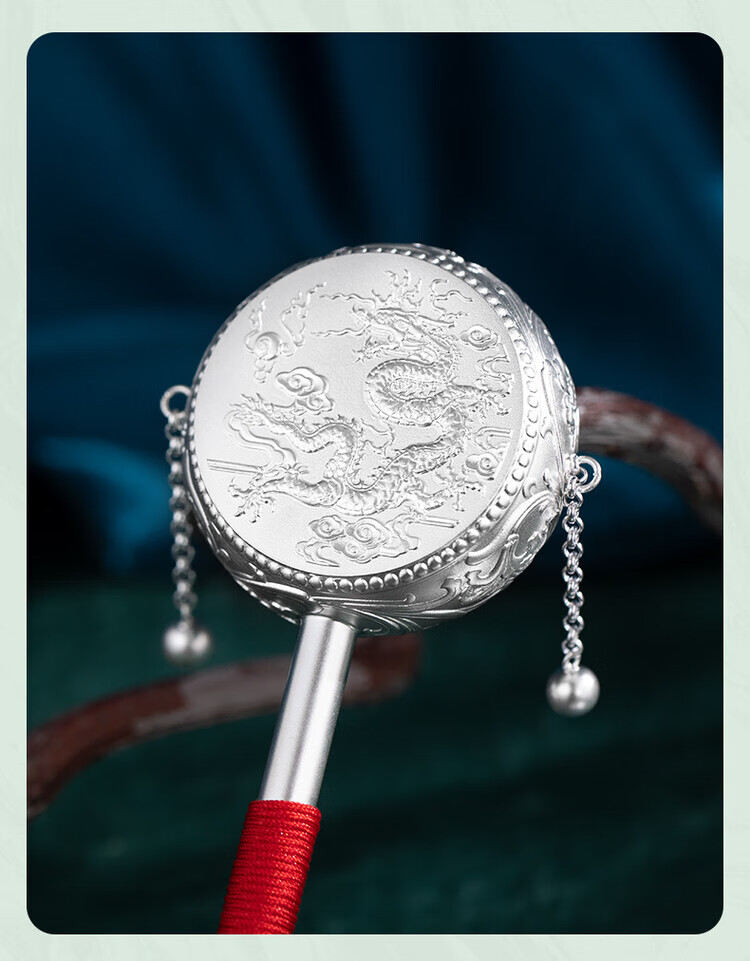 Dian Qingtang sterling silver rattle drum silver rattle children's toy pure silver 999 edible grade chewable full moon gift Baifu style comes with quality inspection certificate + exquisite gift box