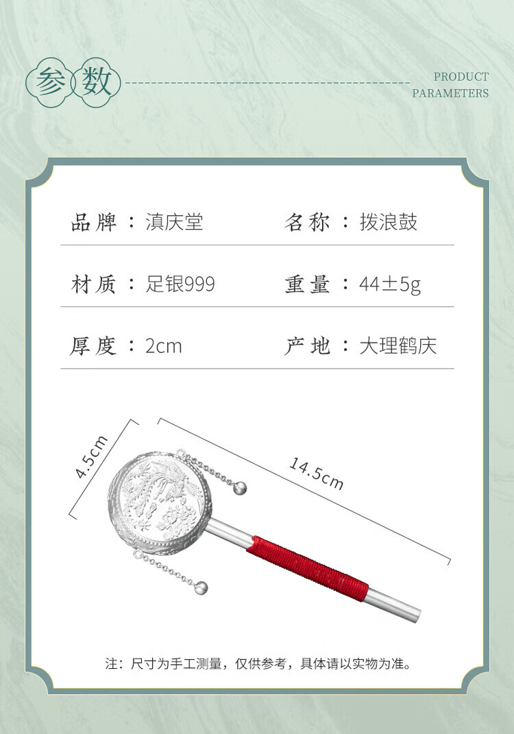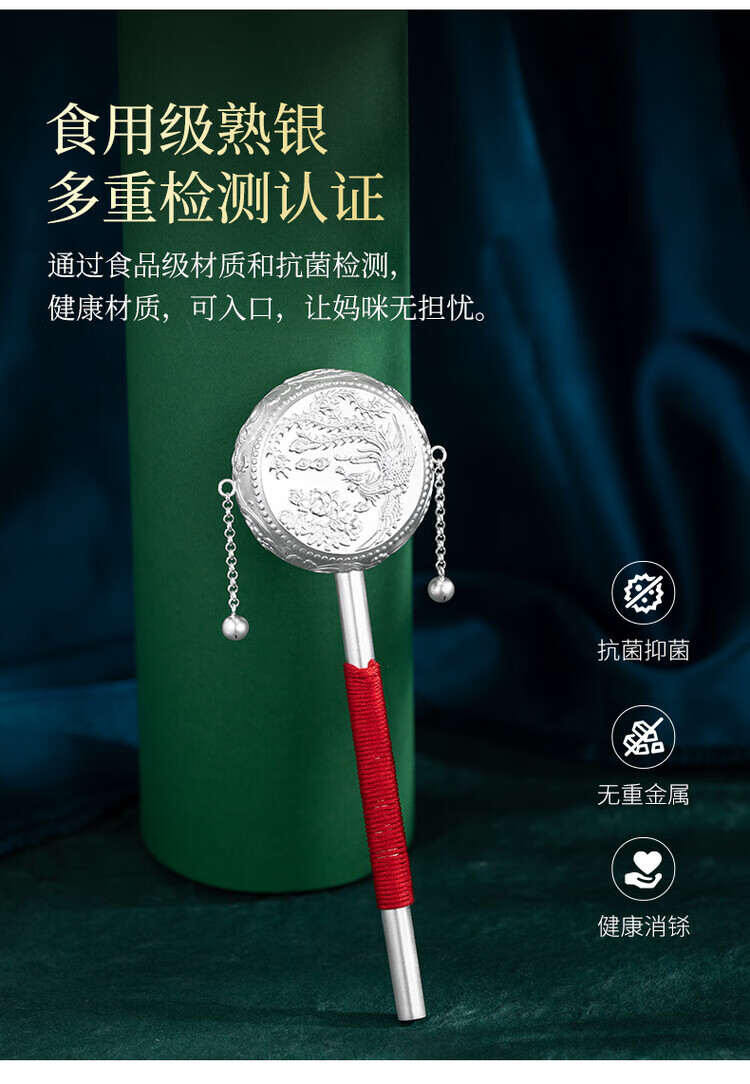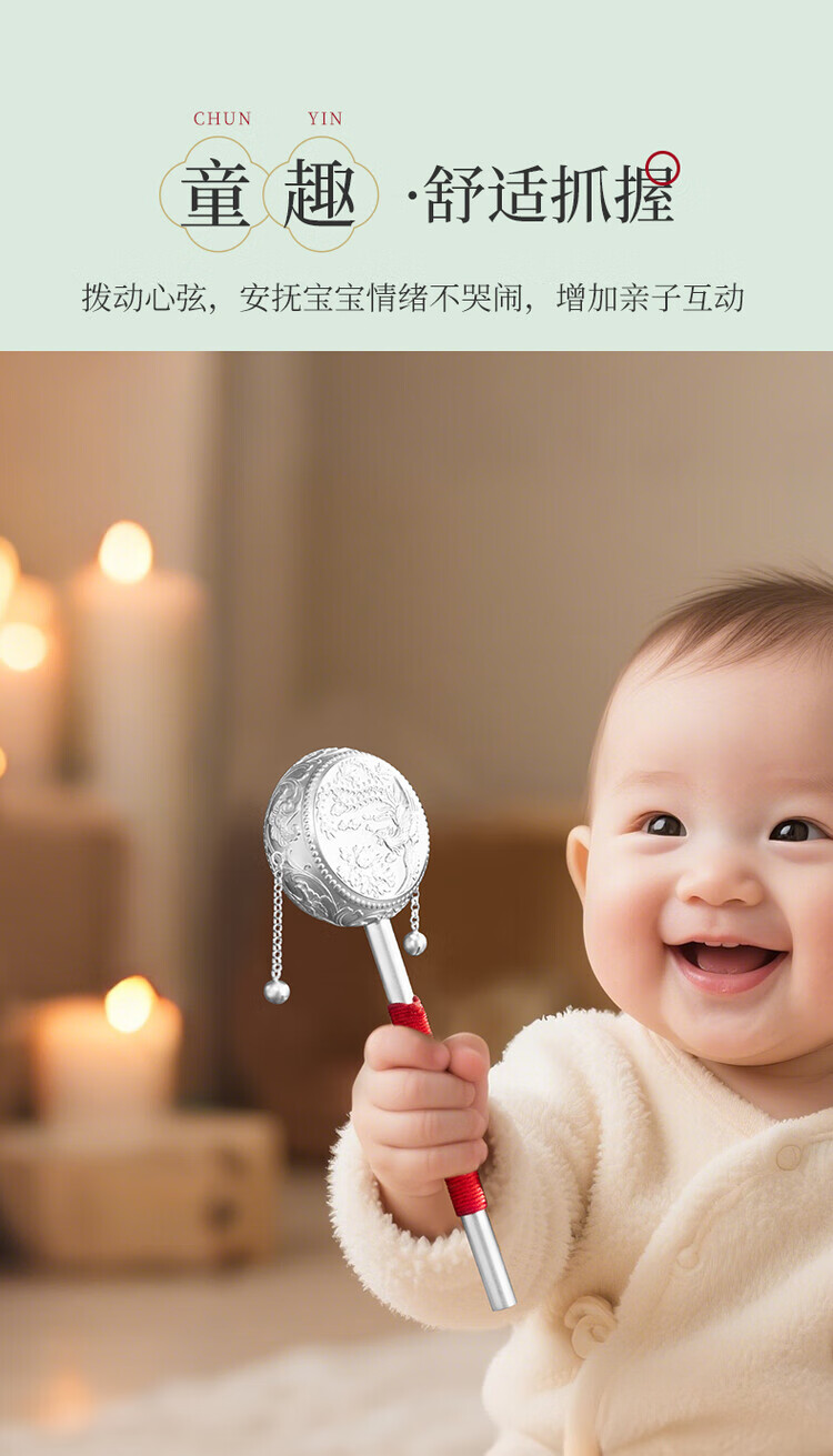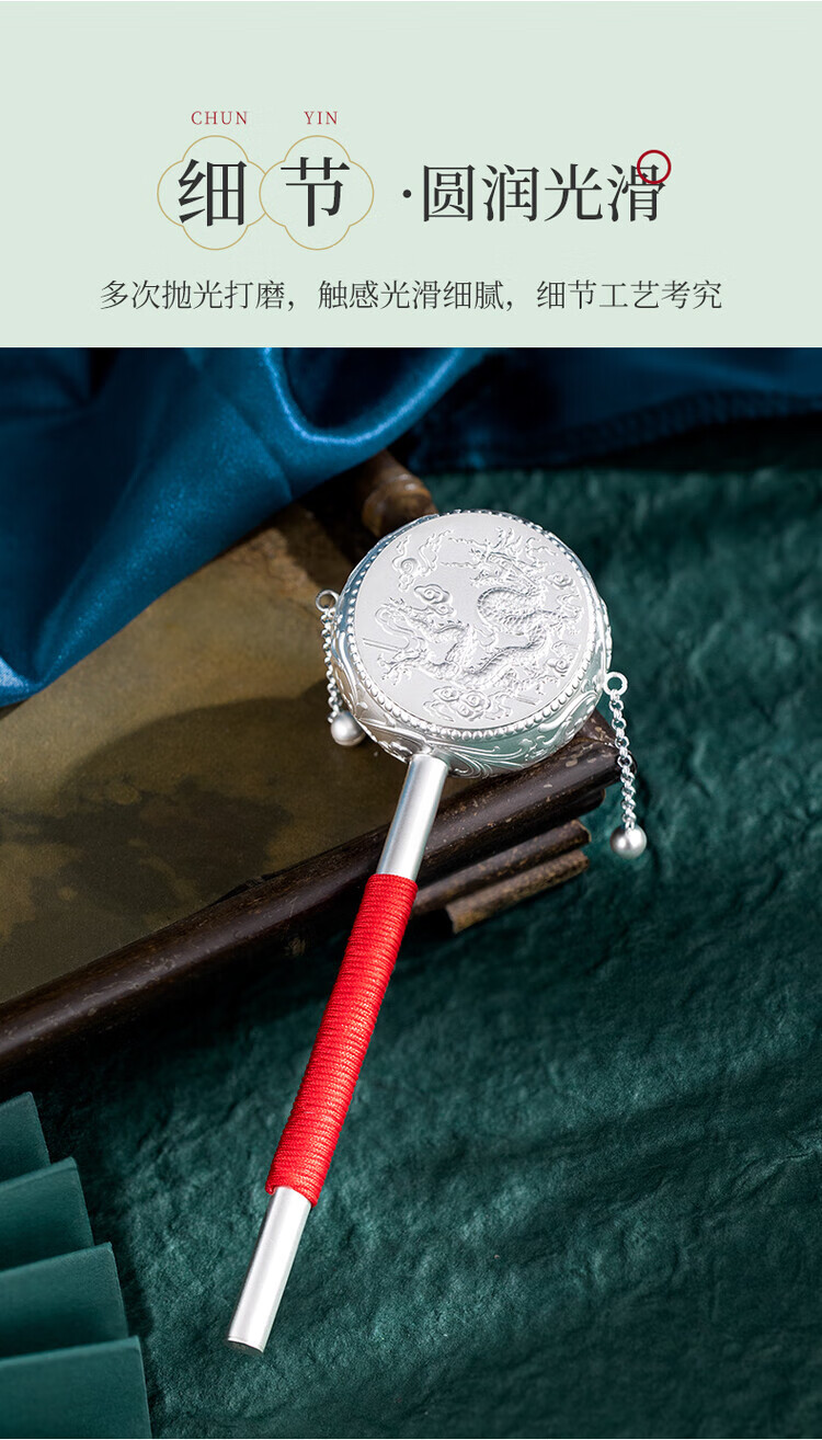 Dian Qingtang sterling silver rattle drum silver rattle children's toy pure silver 999 edible grade chewable full moon gift Baifu style comes with quality inspection certificate + exquisite gift box