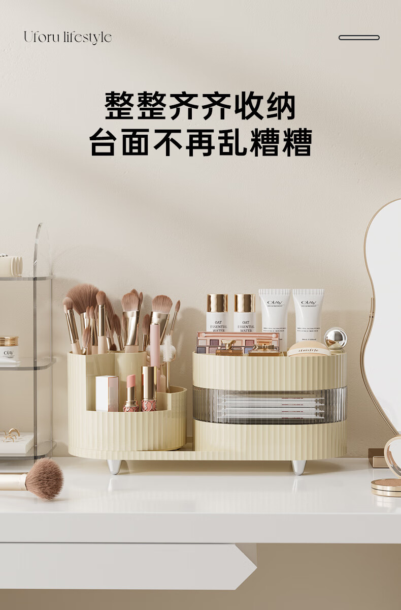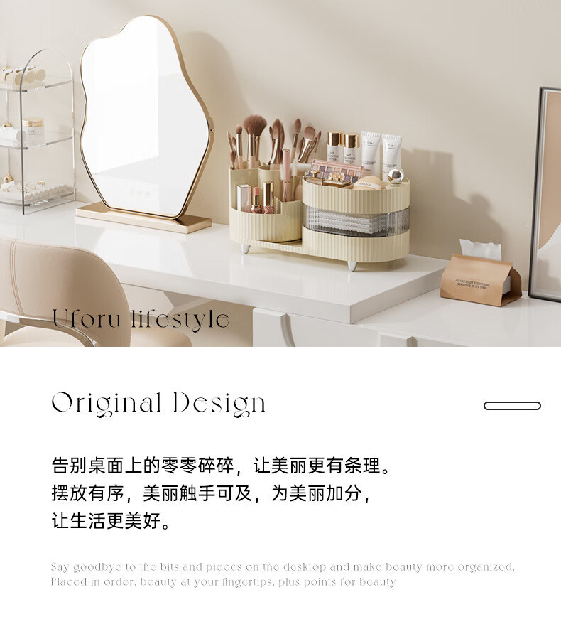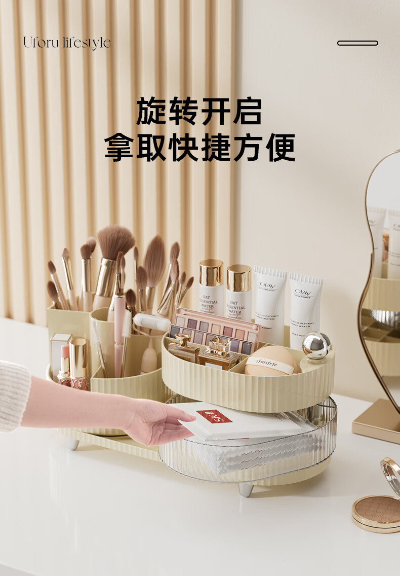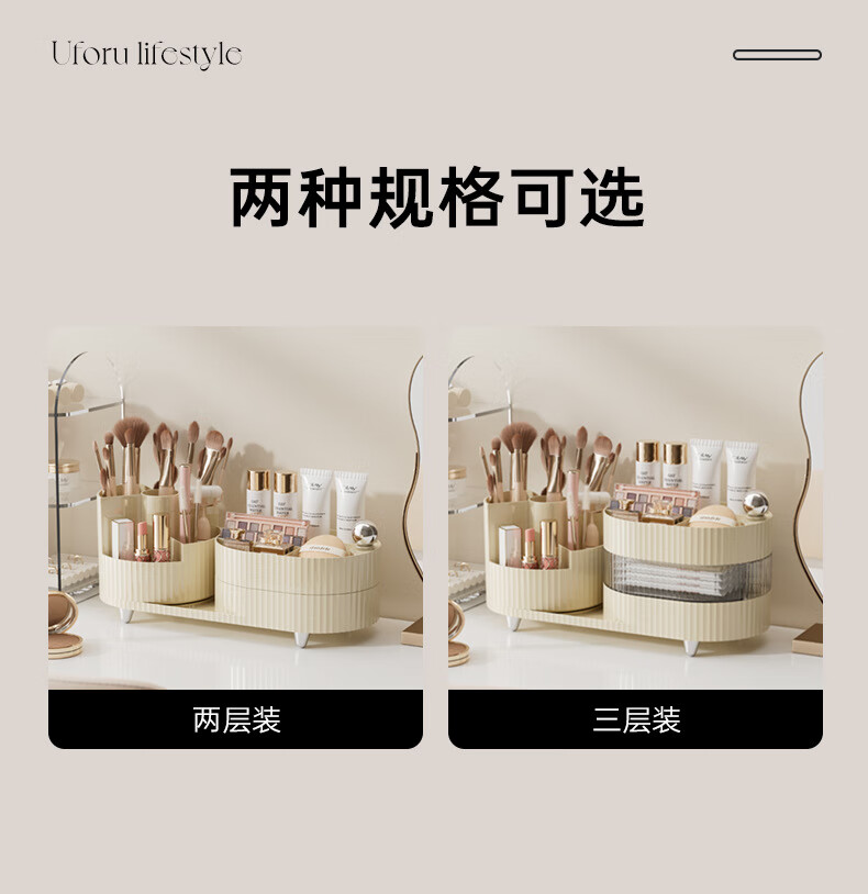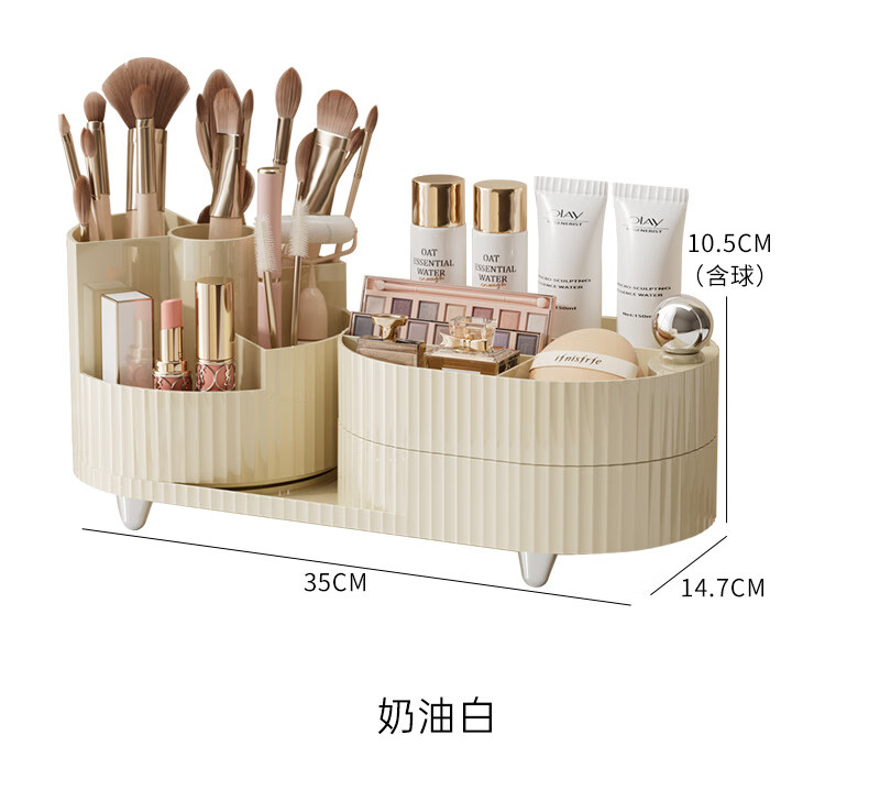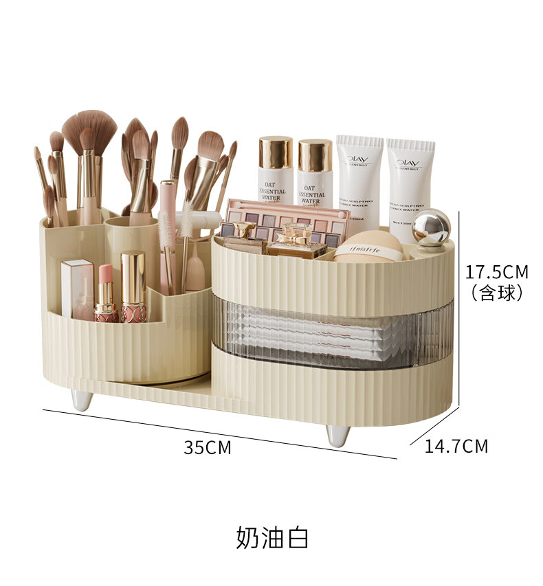 Japanese cosmetics storage box, dressing table, desktop jewelry, integrated rotating bucket storage rack, lipstick makeup brush barrel, cream white - three layers
