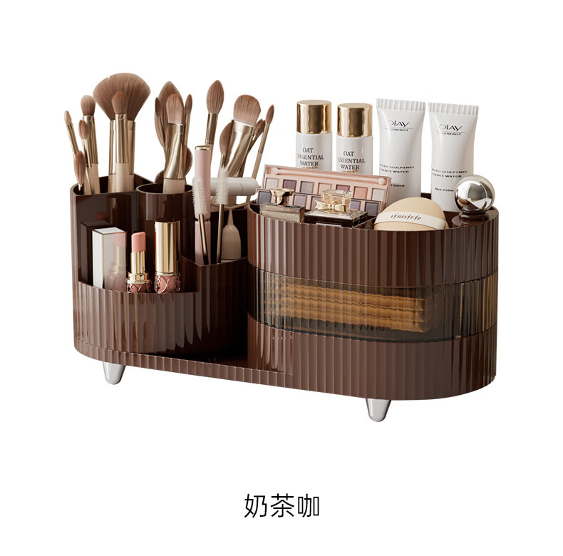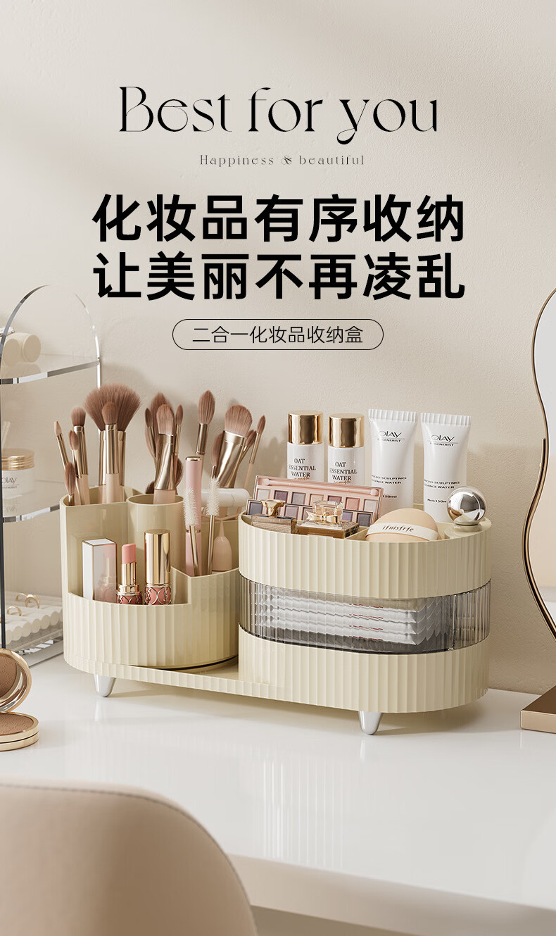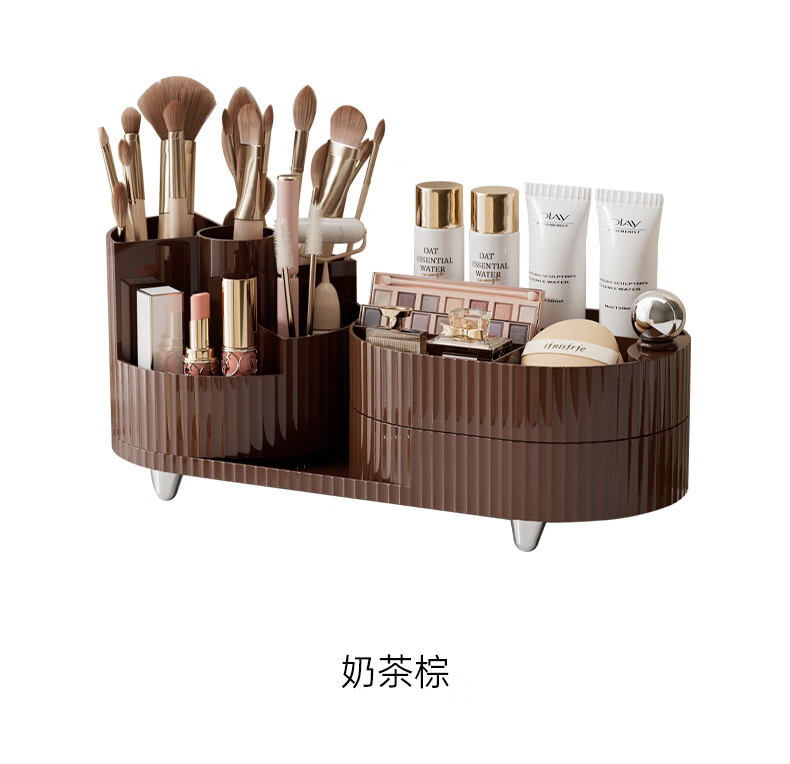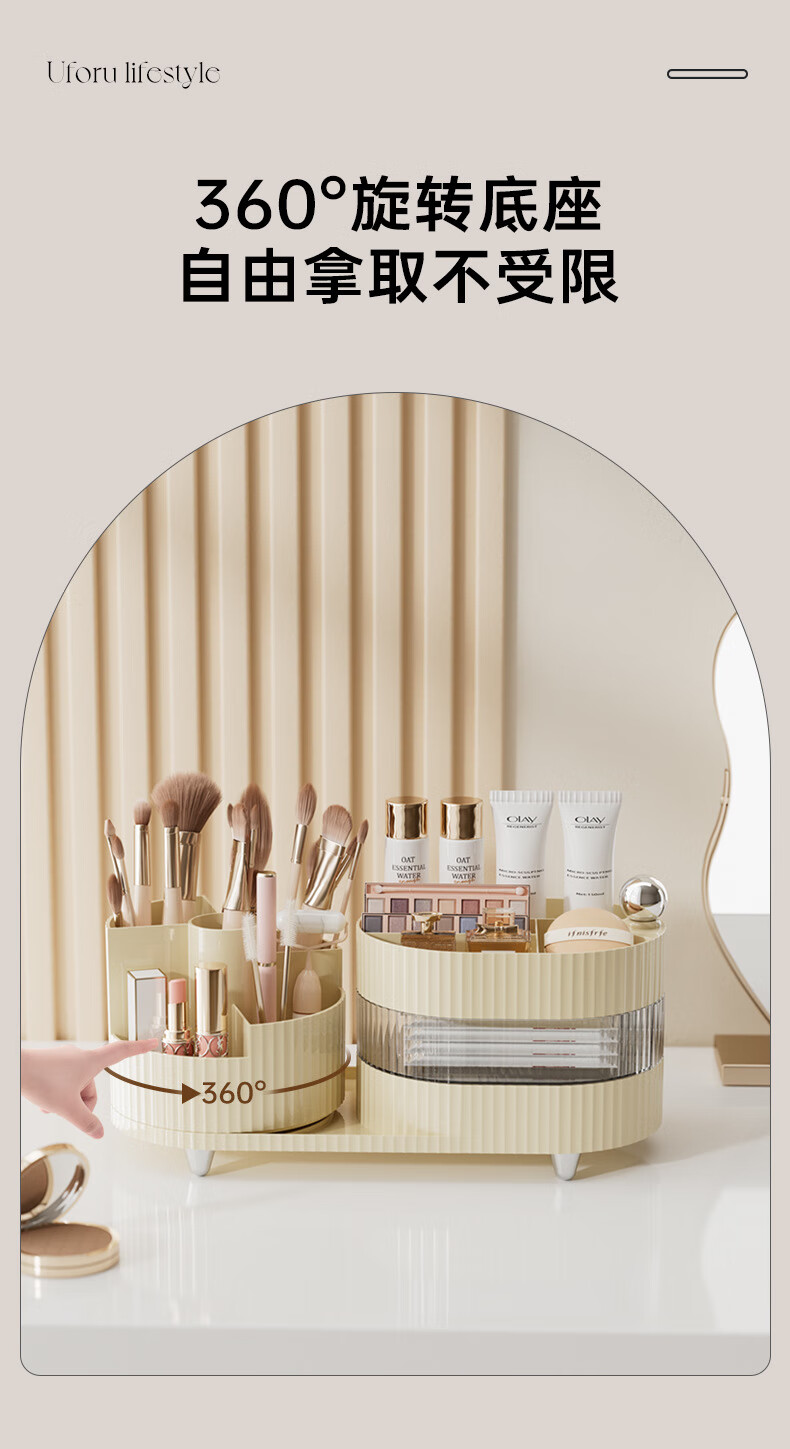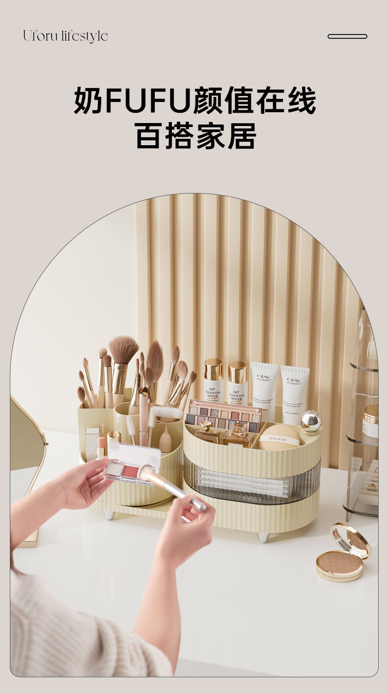 Japanese cosmetics storage box, dressing table, desktop jewelry, integrated rotating bucket storage rack, lipstick makeup brush barrel, cream white - three layers