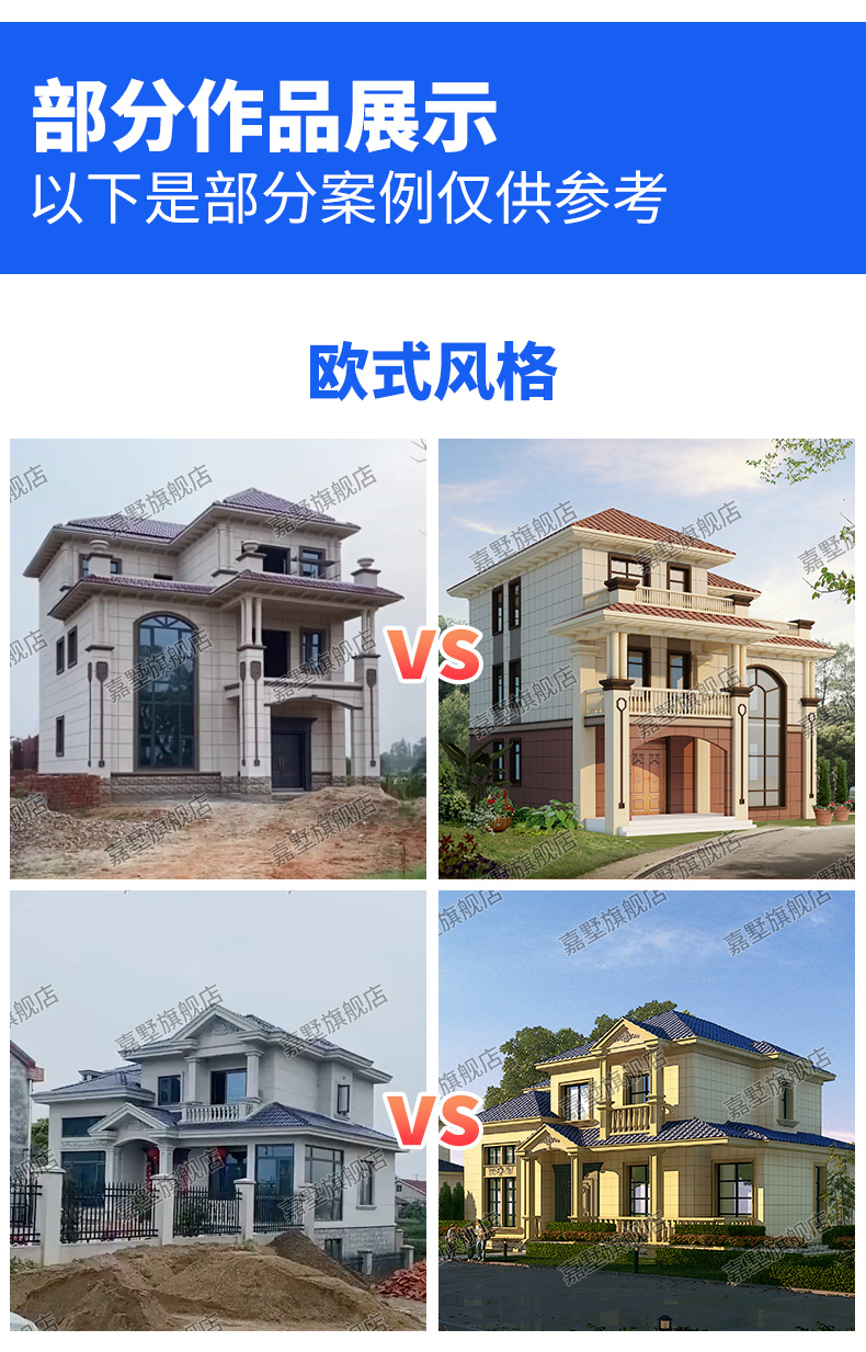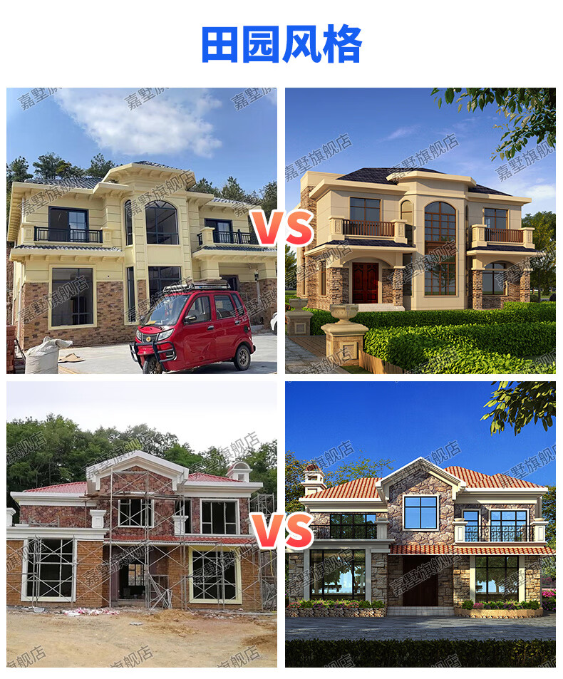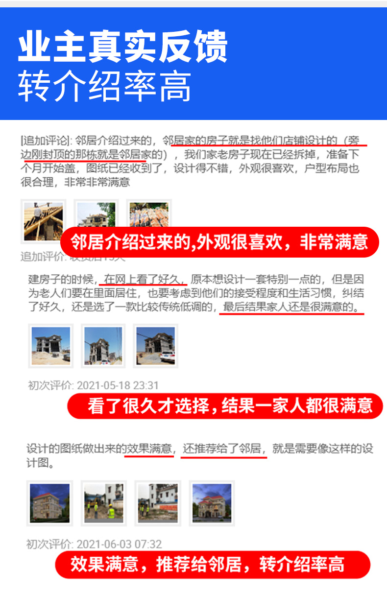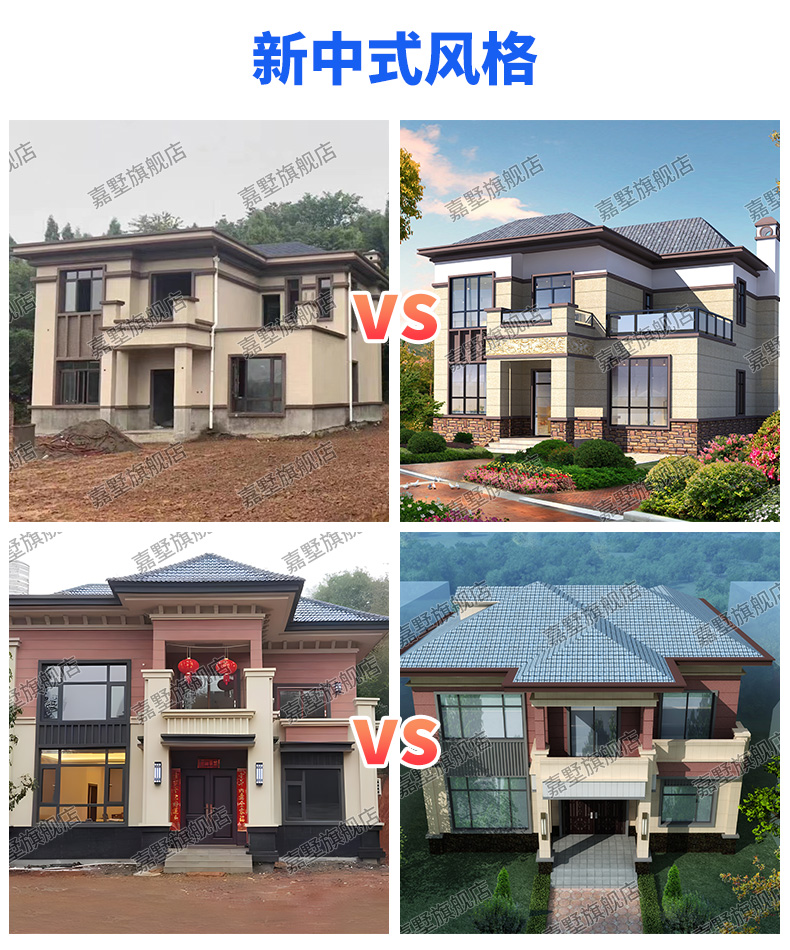 Design drawings of self-built houses in rural Jiashu. New Chinese-style courtyard two-story villa with paper courtyard. One, two and three small foreign houses.