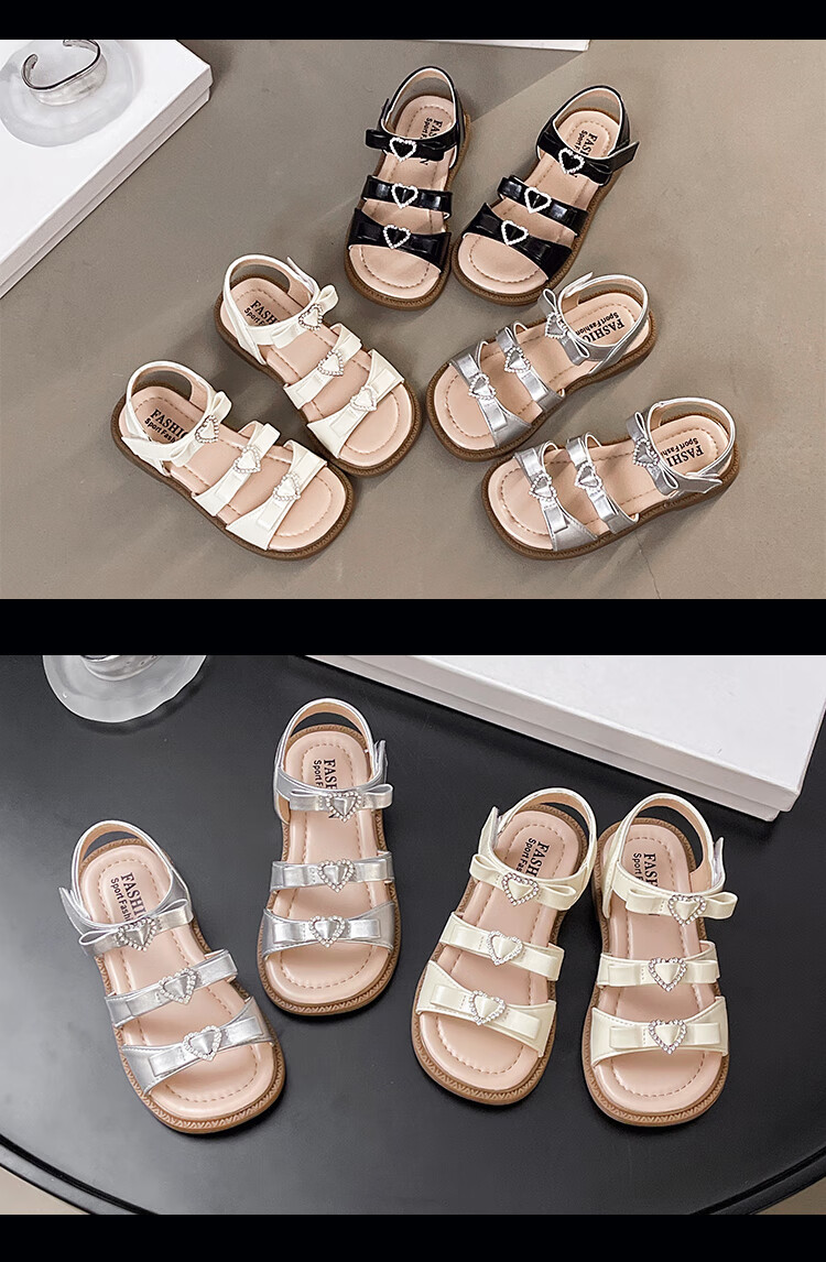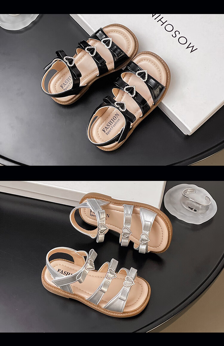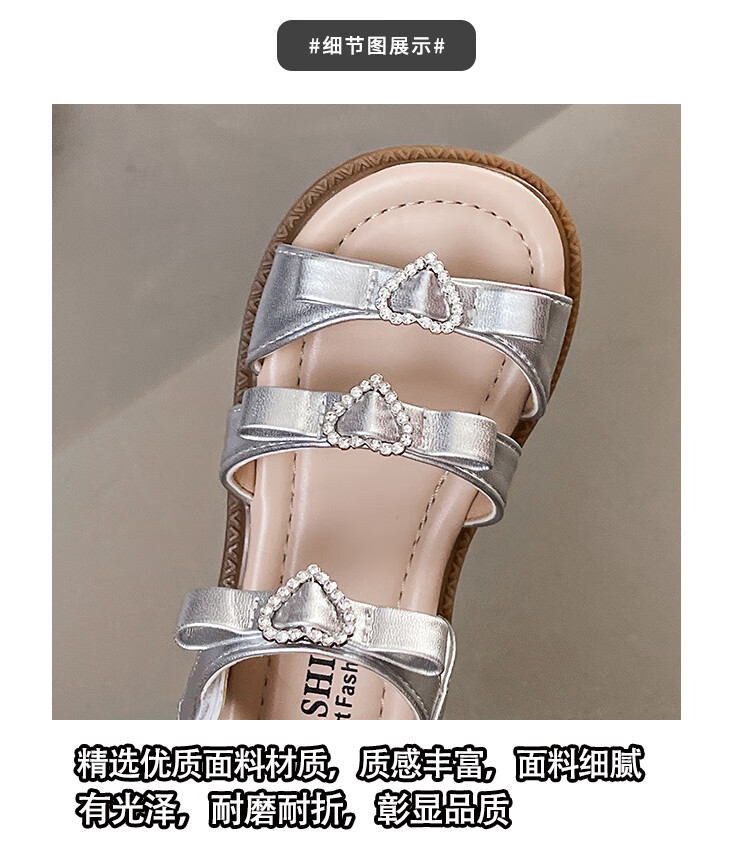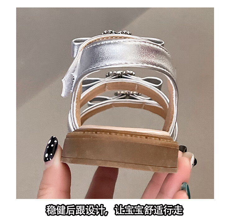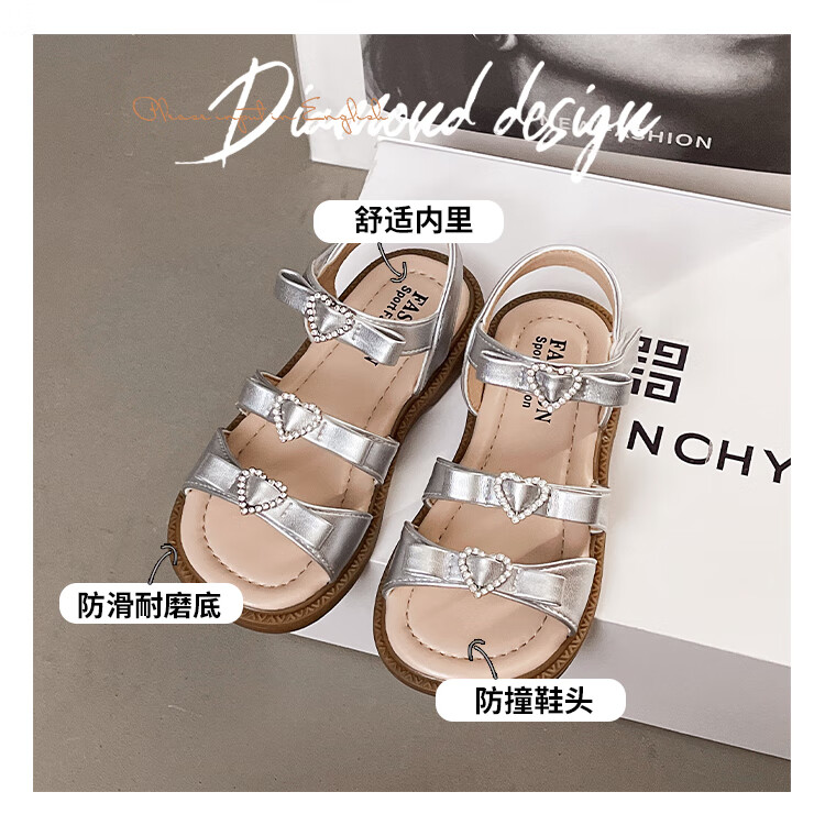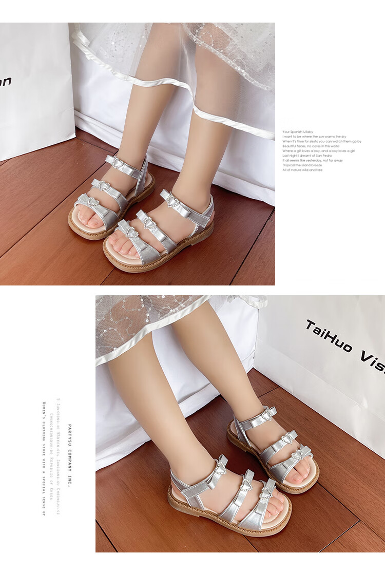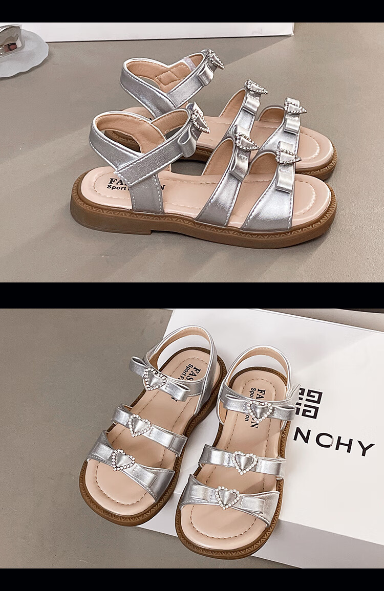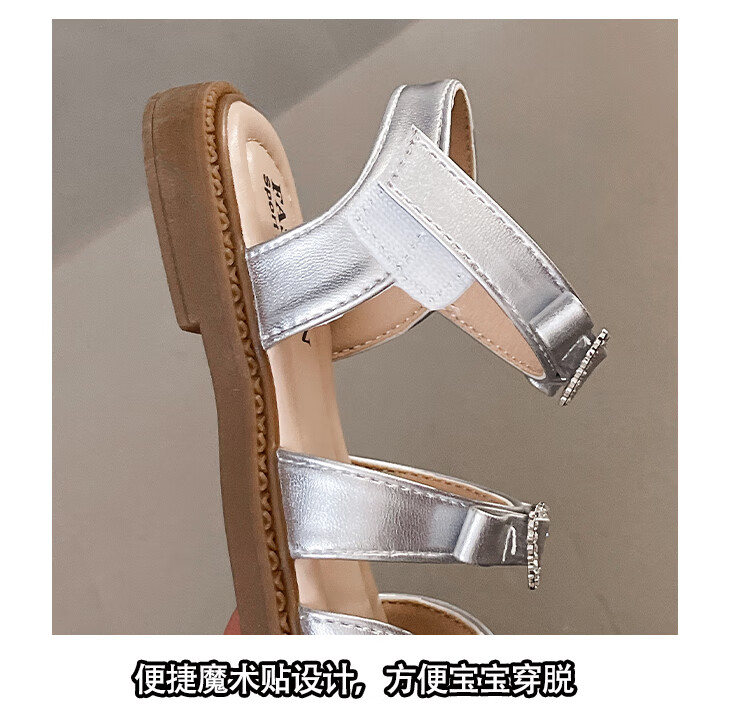 Girls Princess Sandals 2025 Summer New Children's Sandals Soft Sole Medium and Large Children's Open Toe Sandals Velcro Girls Silver Size 27 Inner Length Approximately 16.7cm