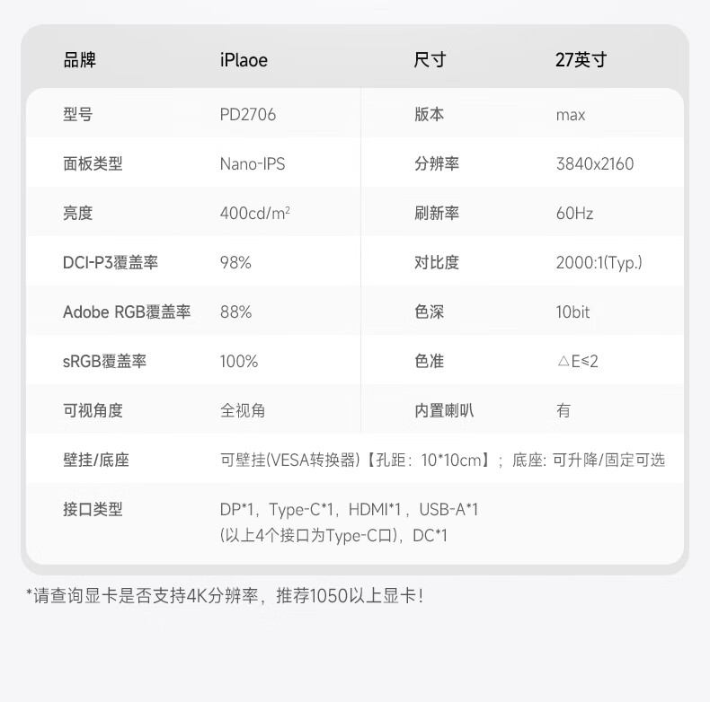 IPlaoe27-inch 4K display 144HZLG panel NanoIPS screen professional design retouching e-sports games Type-C aluminum alloy HDR eye protection Mac external screen vertical screen MAX hole version LG panel 27-4K full screen simple base