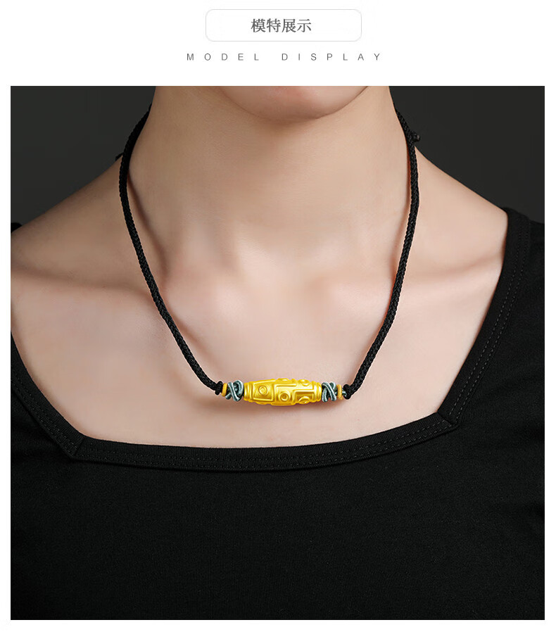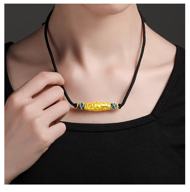 Iosn999 Pure Gold Dzi Bead Necklace for Men and Women Long Barrel Beads Gold Pattern Transfer Beads 3D Hard Gold Bracelet Nine Eyes Pendant Medium Dzi Beads + Braided Necklace