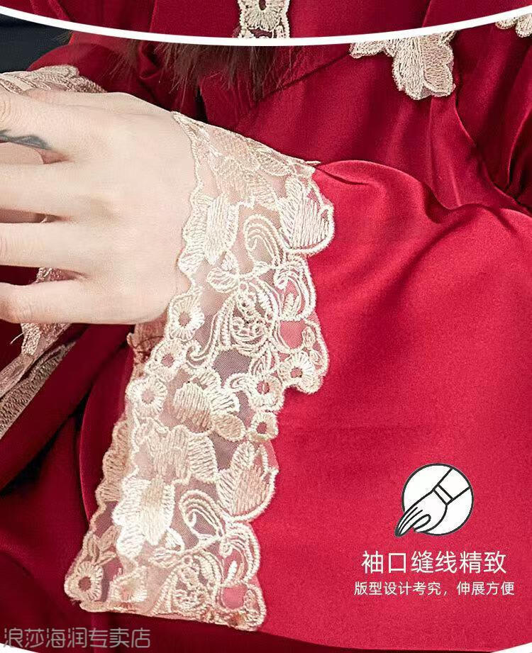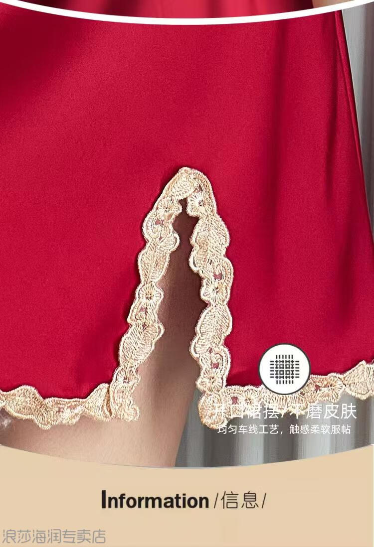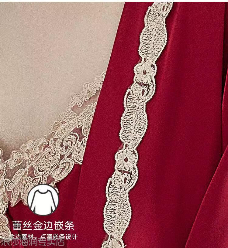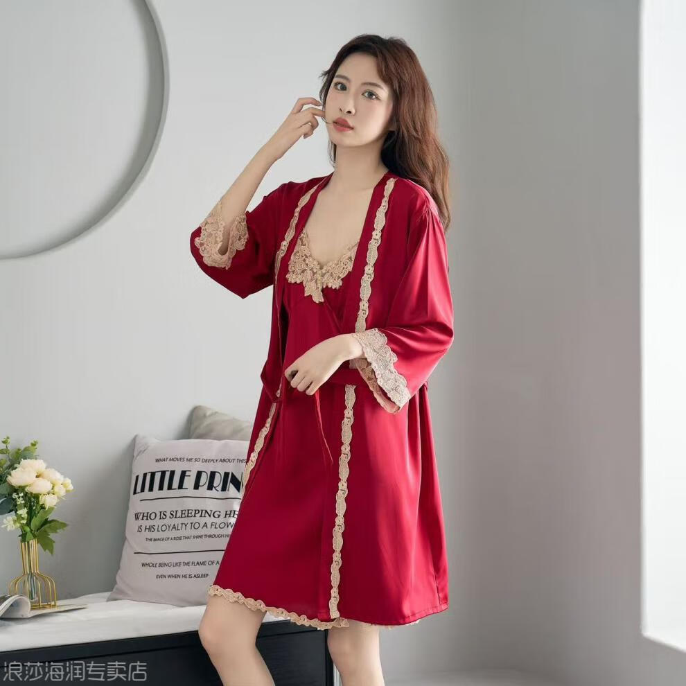 LangSha Light Luxury Sexy Pajamas Women's Summer New Style Ice Suspender Nightgown with Breast Pads Two-piece Deep Lace Nightgown Black Suspender + Outer Robe Skin Friendly and Smooth With L Recommended 85-110 Jin Jin equals 0.5 kg