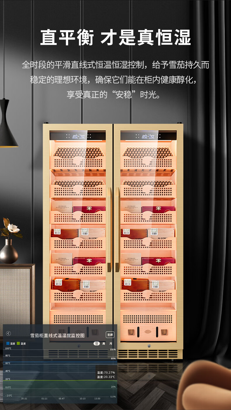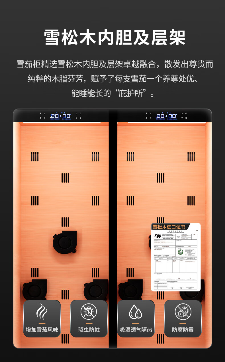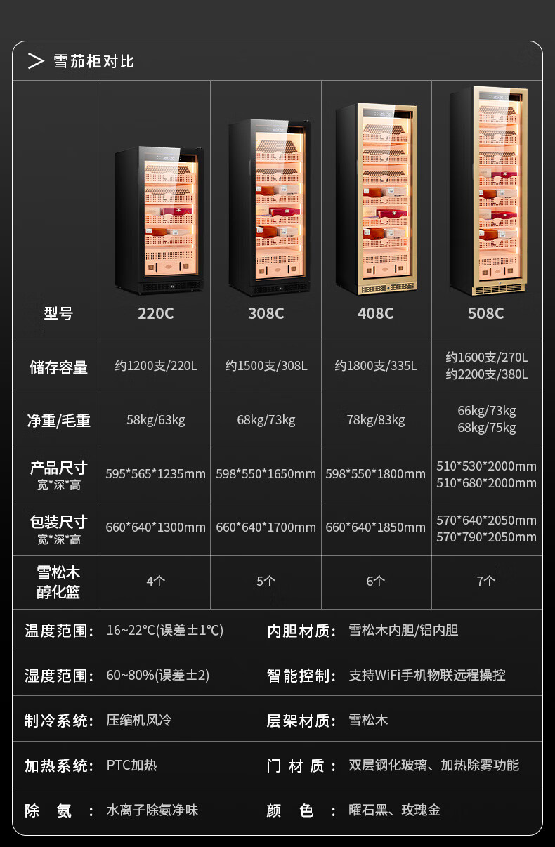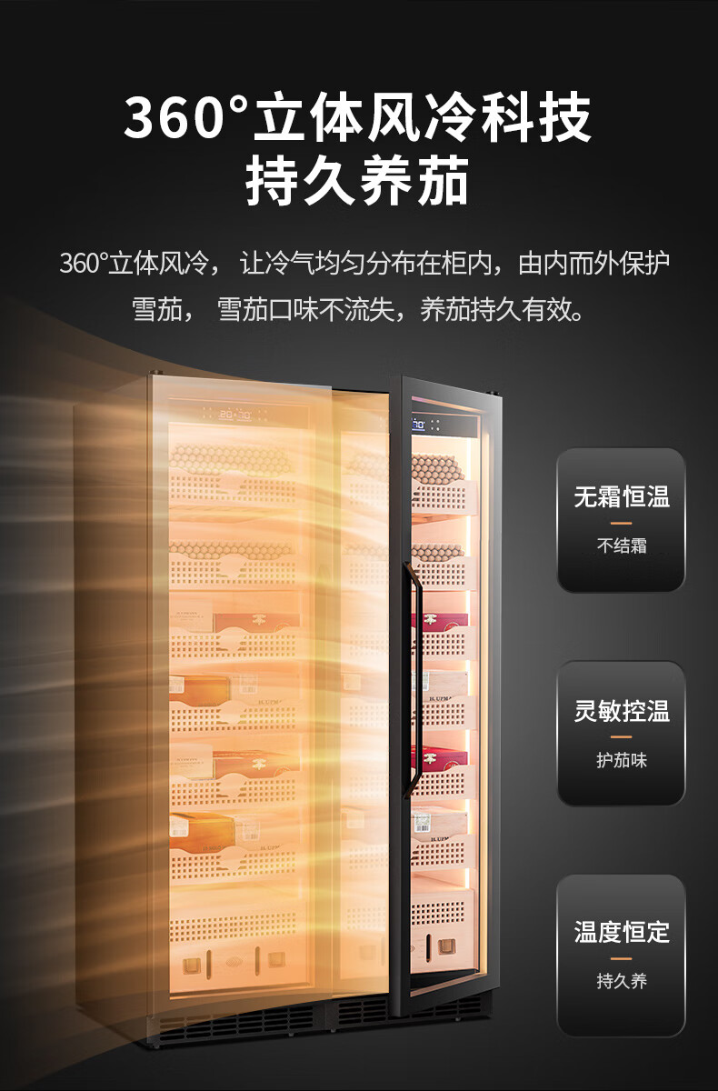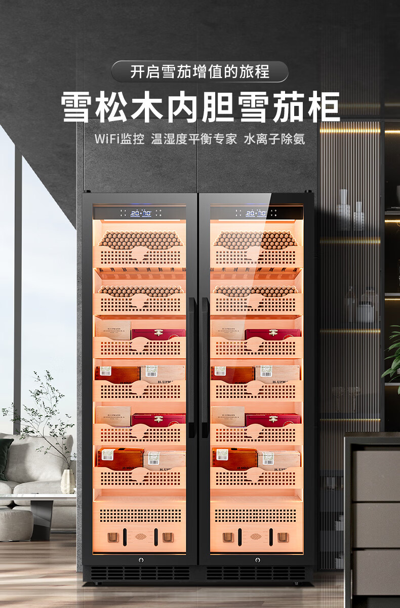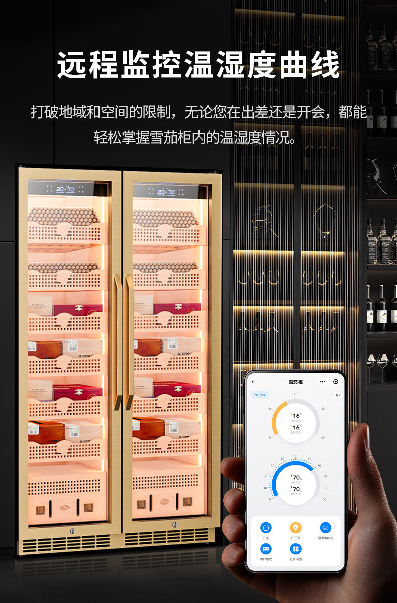 Kelong 680C cigar cabinet with constant temperature and humidity, precise frequency conversion, cedar wood liner and shelf, WiFi smart IoT control, air-cooled water ion ammonia removal compressor, cigar and red wine dual-purpose cabinet, rose gold luxury accessories, clean ammonia + WiFi + cedar wood liner and shelf, thick version (depth 680mm)