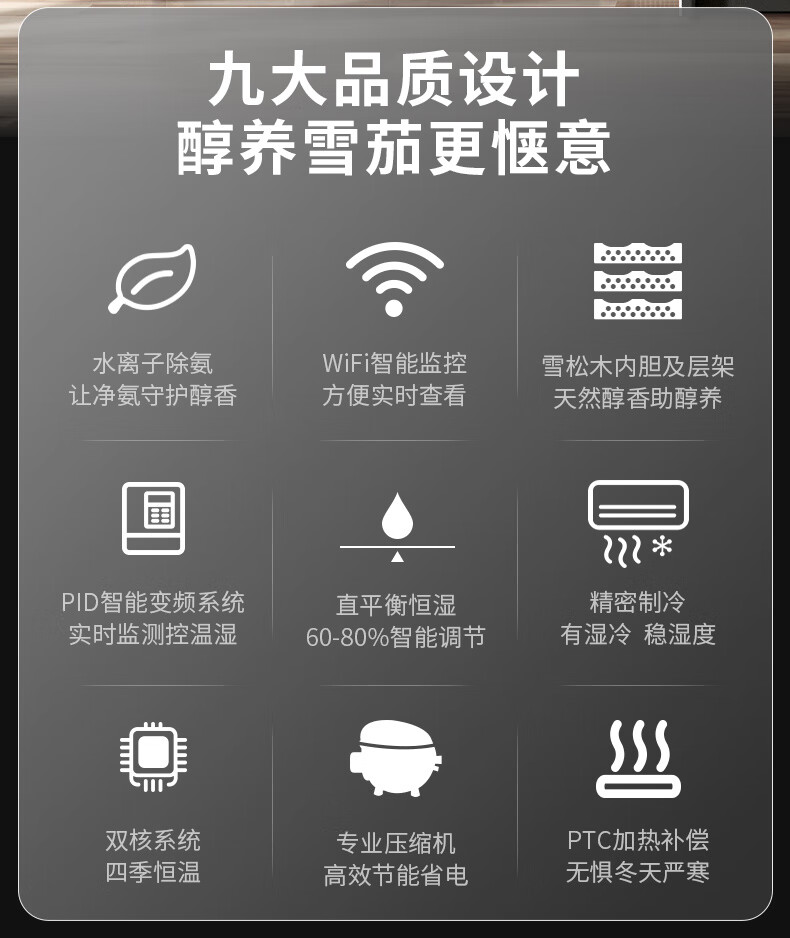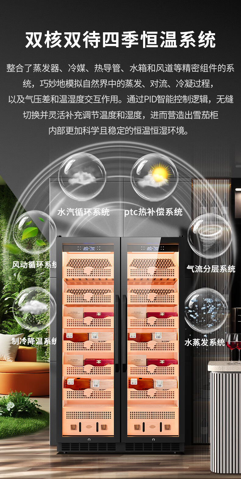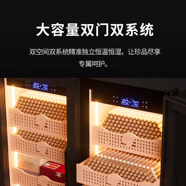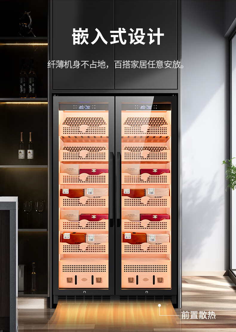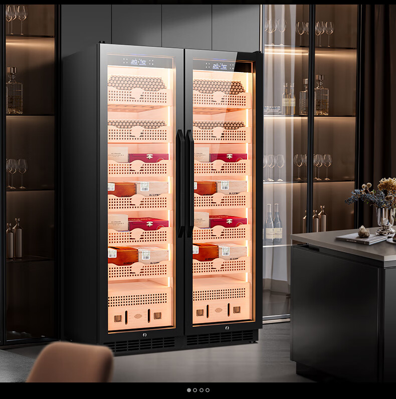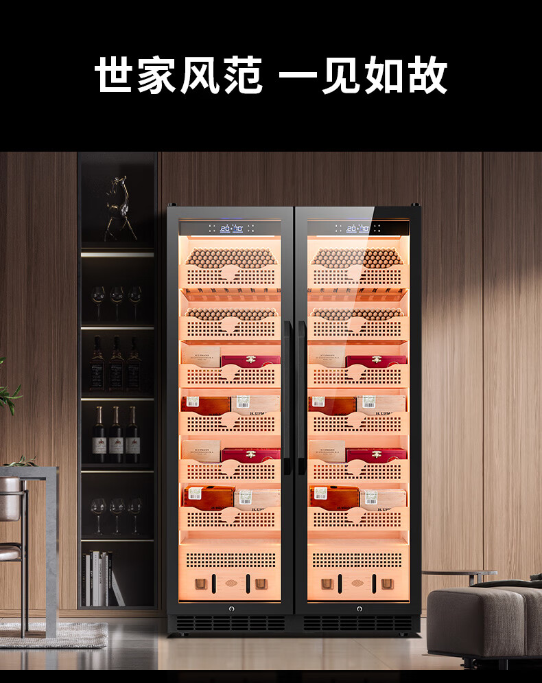 Kelong 680C cigar cabinet with constant temperature and humidity, precise frequency conversion, cedar wood liner and shelf, WiFi smart IoT control, air-cooled water ion ammonia removal compressor, cigar and red wine dual-purpose cabinet, rose gold luxury accessories, clean ammonia + WiFi + cedar wood liner and shelf, thick version (depth 680mm)