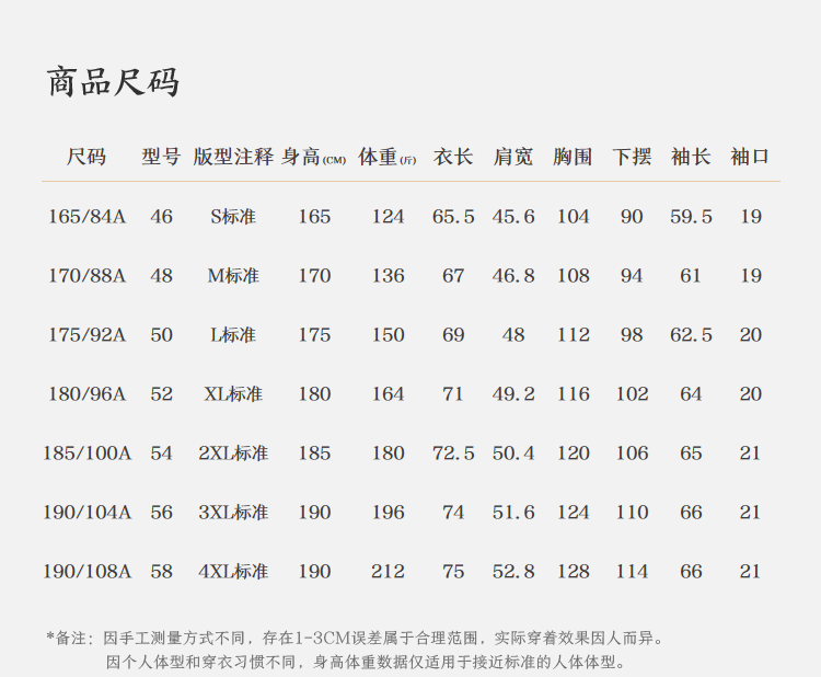 China (cm) 165 / 88-90 170 / 96-98 175 / 108-110 180 / 118-122 185 / 126-130