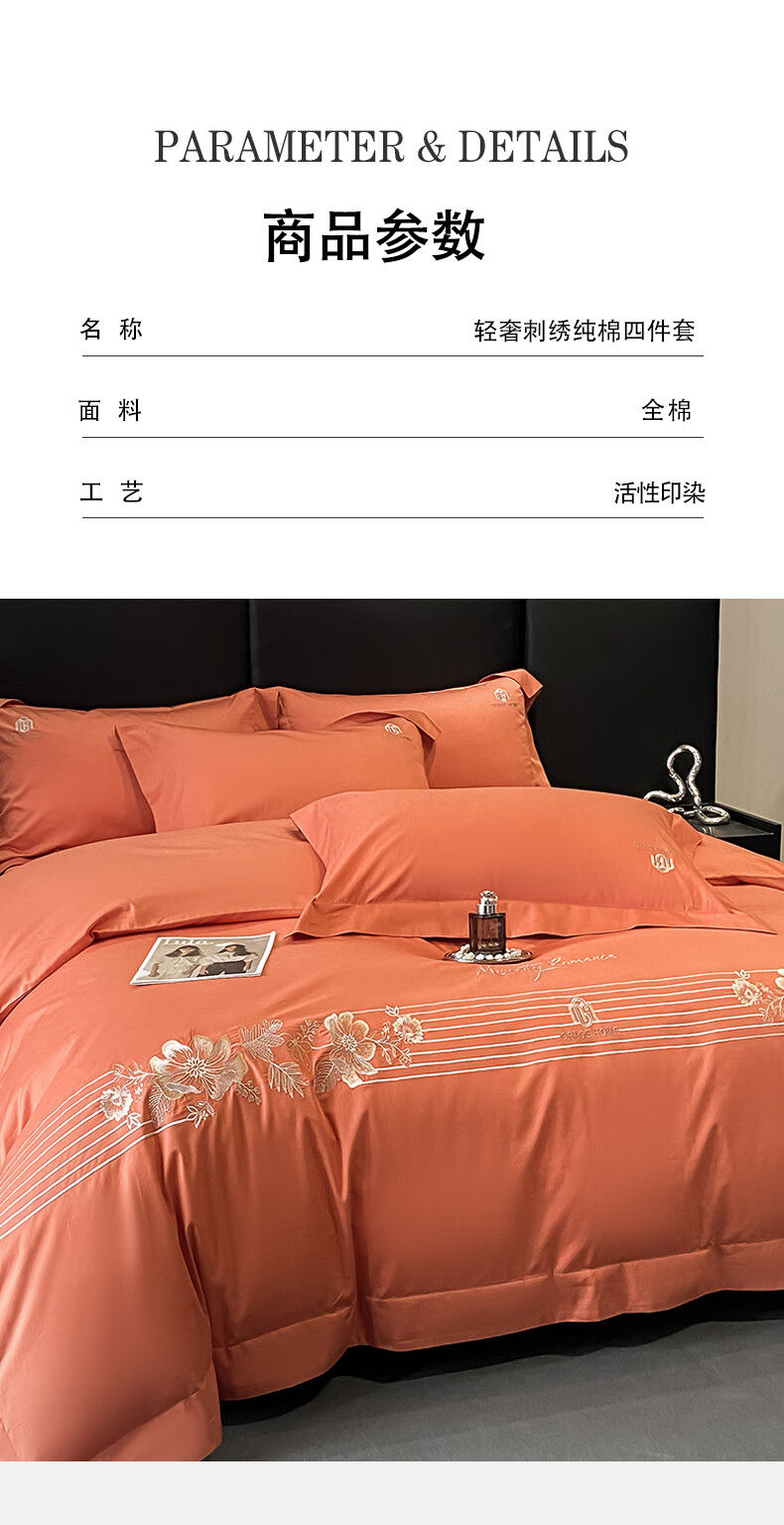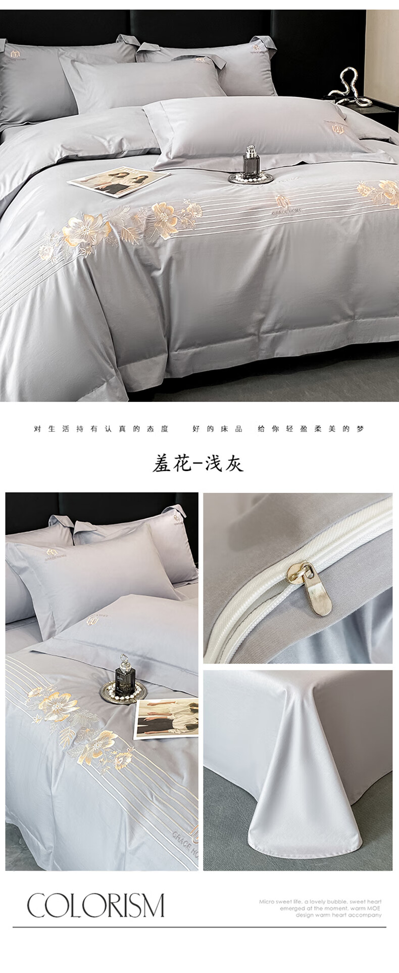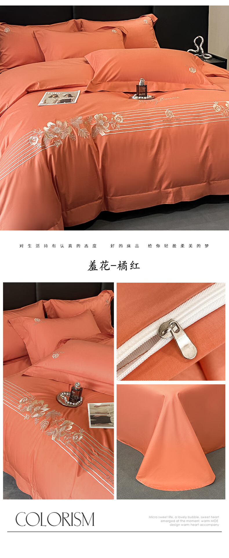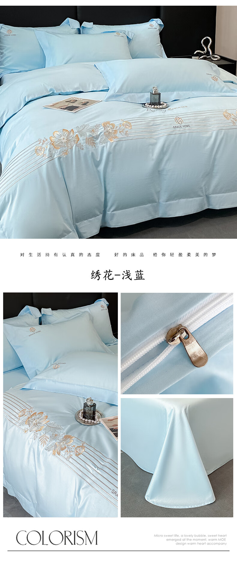 High-end 200 count cotton four-piece set, long-staple cotton pure cotton duvet cover and fitted sheet, skin-friendly, light luxury embroidered bedding for naked sleeping, Shame Flower-Aqua 1.8m duvet cover, extra large fitted sheet, four-piece set