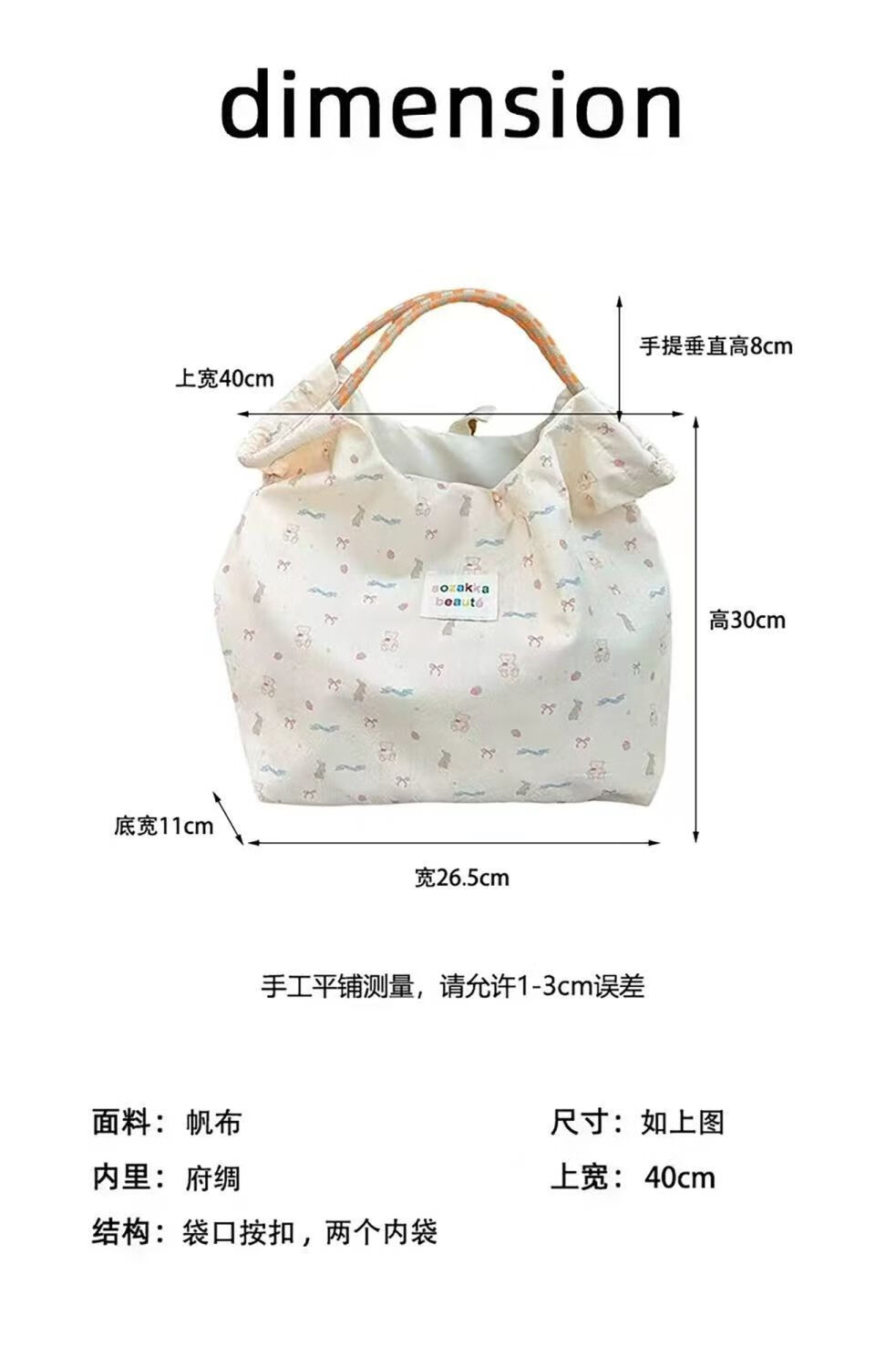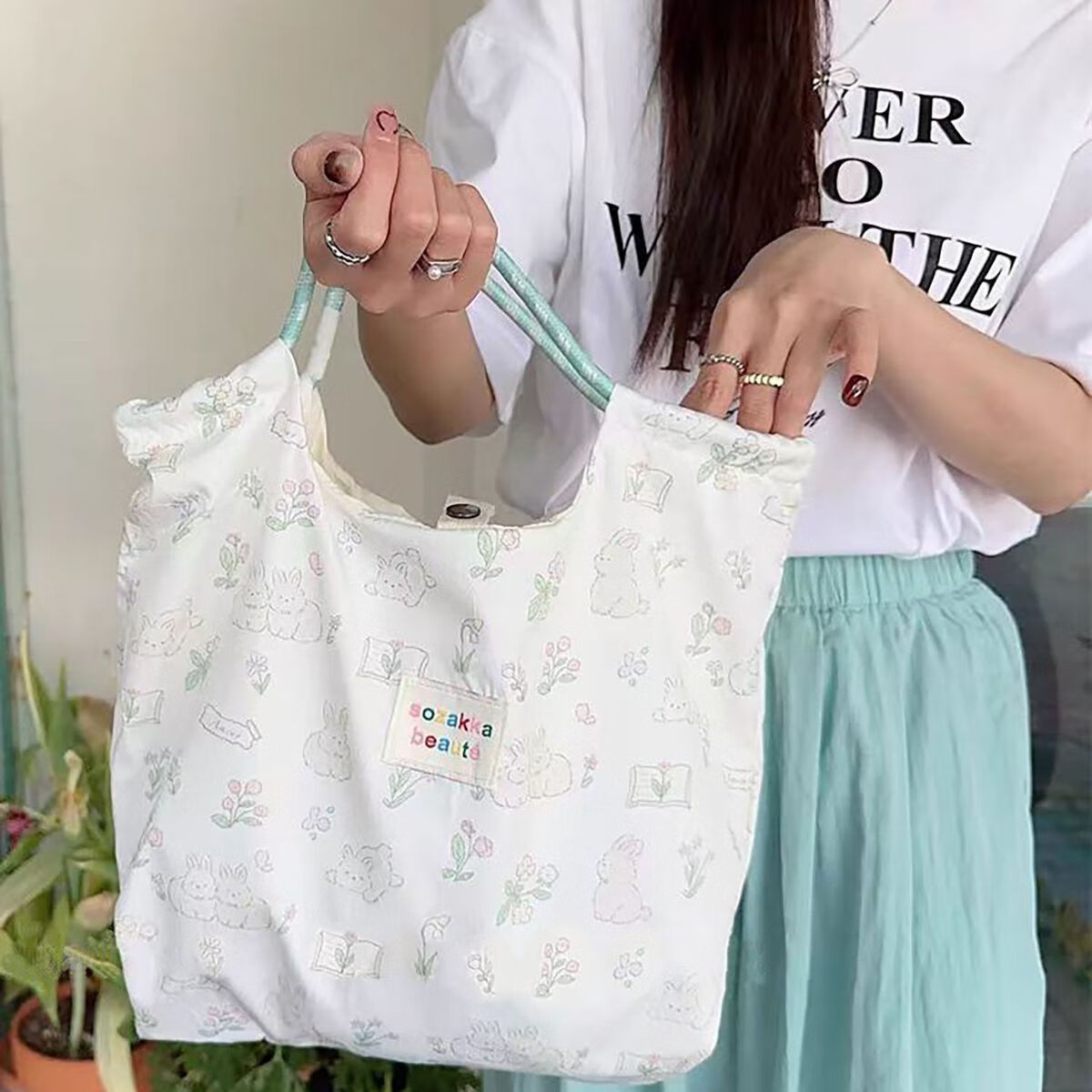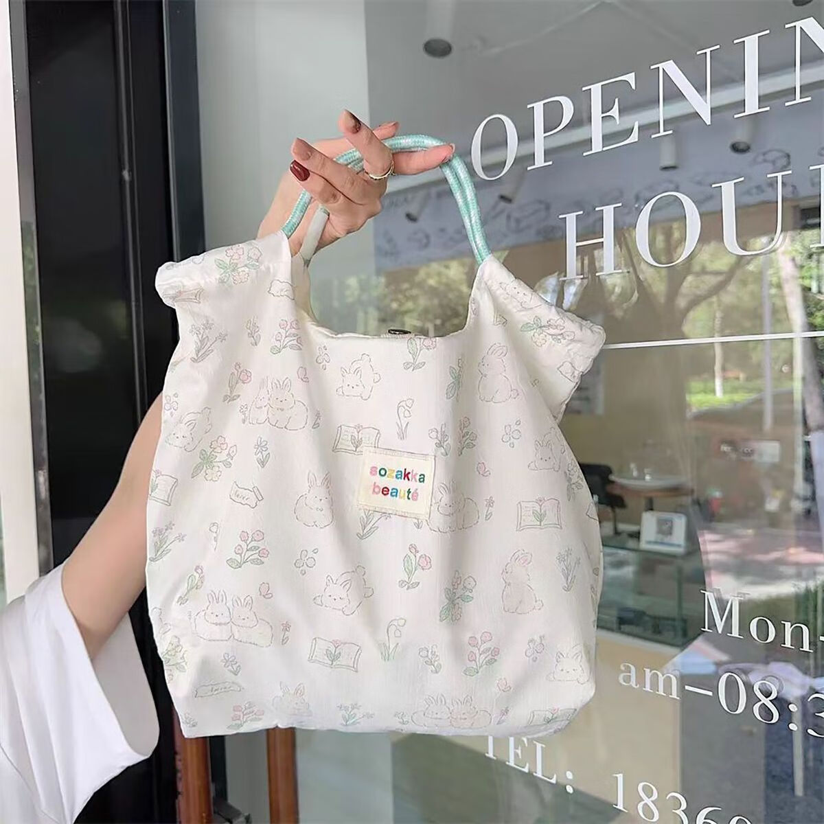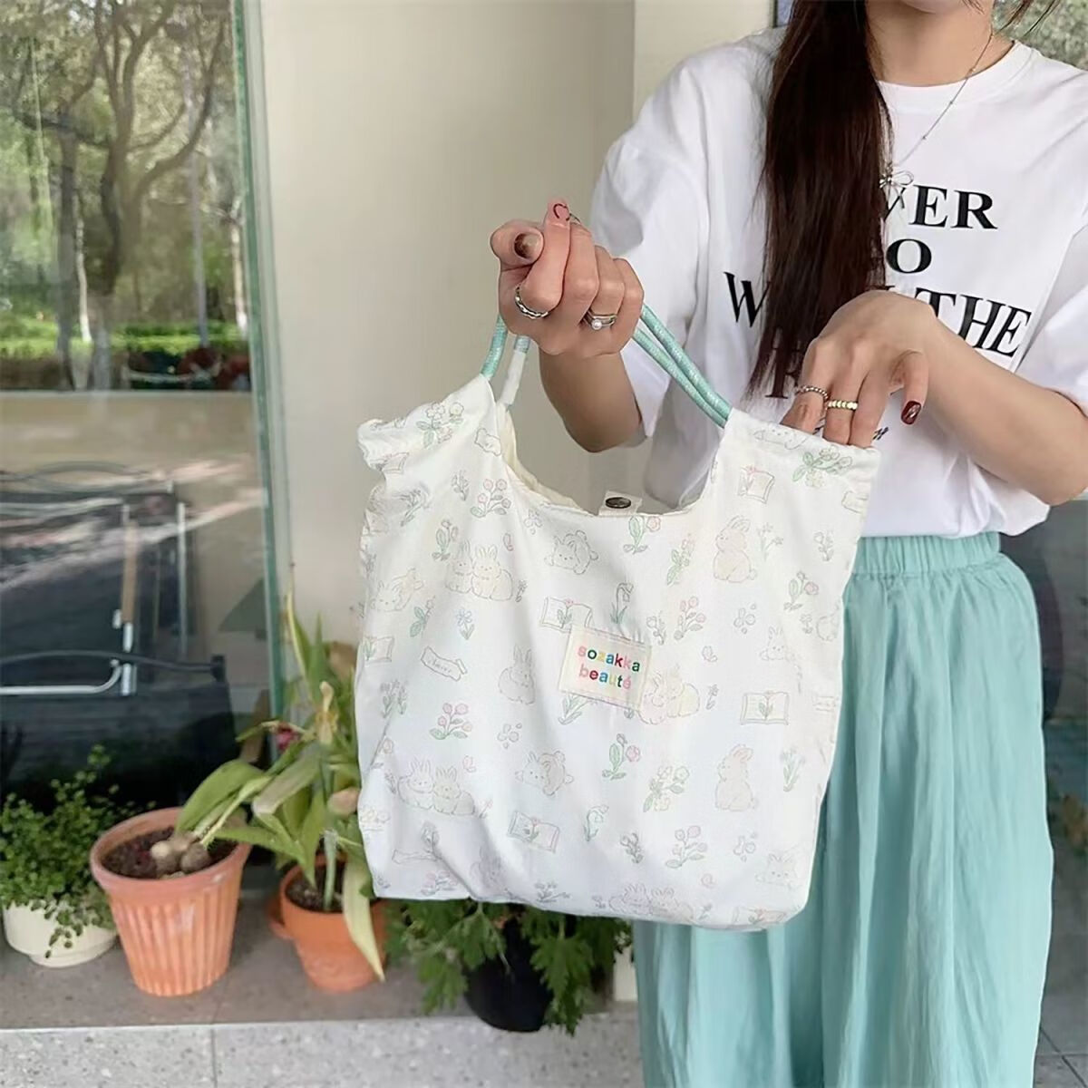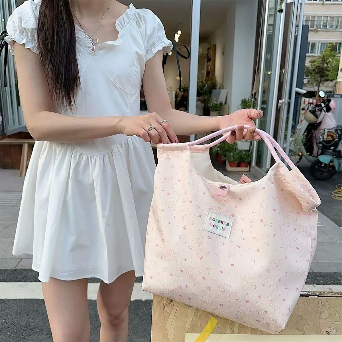 New Cute Floral White Rabbit Canvas Bag Women's Shoulder Bag Large Capacity Handbag Carrying Book Bag Tote Bag Pink Long-eared Rabbit High-Quality Version - No Ornaments