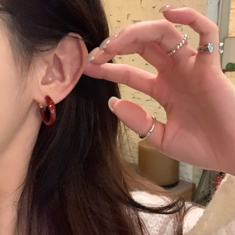 New Year's Eve Ankora Red Drop Glaze Earrings Light Luxury High-end Earrings Niche Temperament Earrings Autumn and Winter Earrings for Women Burgundy Plain Hoop Earrings One Pair