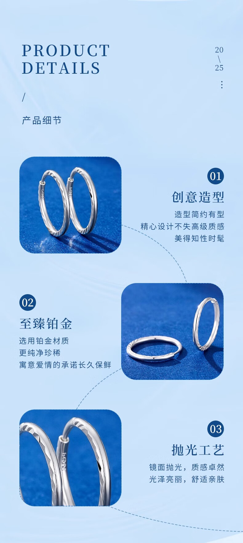 CHINA GOLD PT950 Platinum Twill Earrings Plain Hoop Earrings Practical Valentine's Day Gift for Girlfriend's Birthday PT950 Platinum Twill Earrings About 0.9g